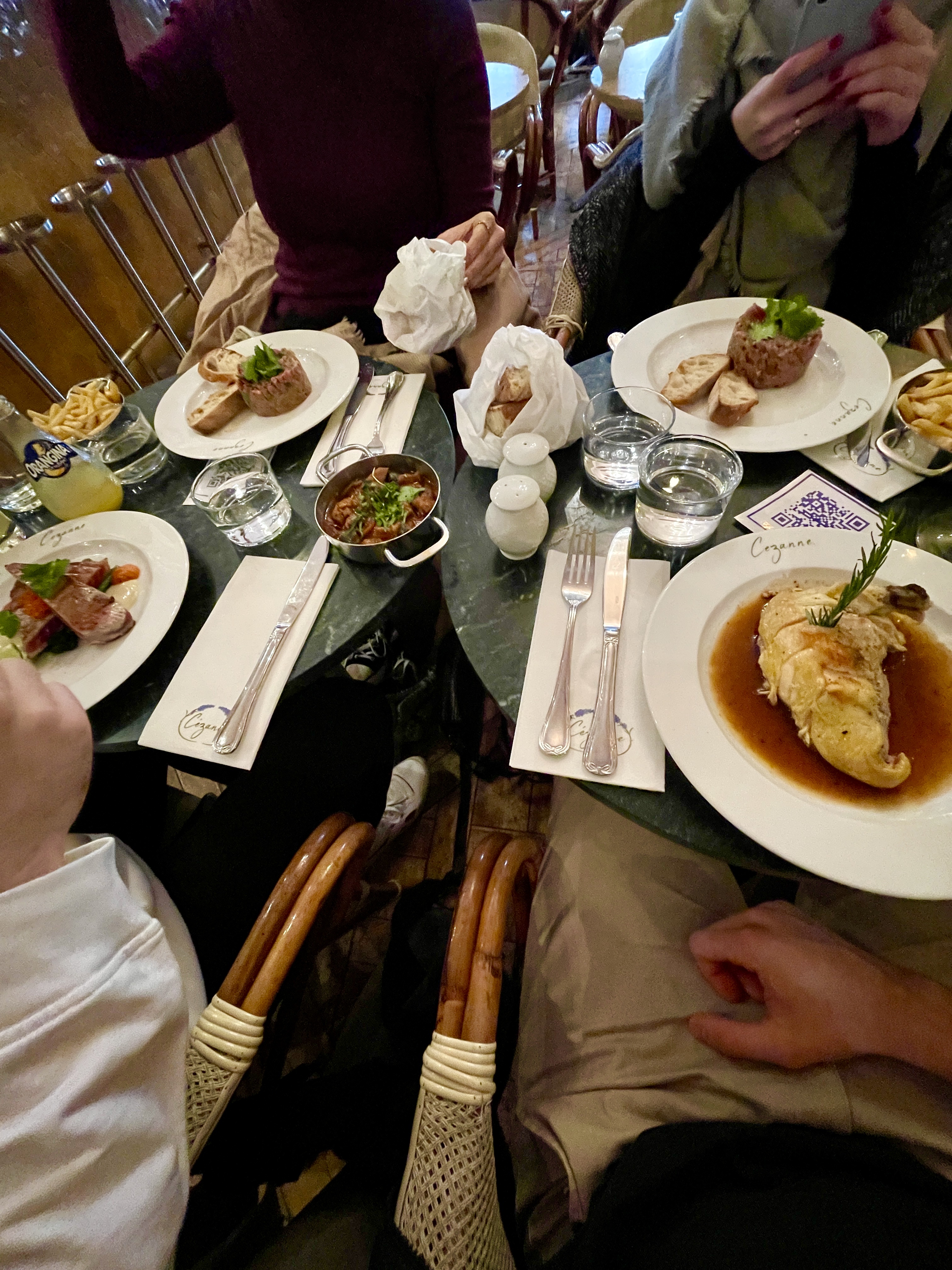 Ma femme et moi avons atterri tard à Paris et n'étions même pas sûrs d'avoir un repas décent à 23 heures, mais Chez Cézanne nous a offert une incroyable surprise ! Nous avons eu de la chance et avons pu monter et trouver une table même s'il y avait beaucoup de monde. L'ambiance et la musique live étaient parfaites pour une sortie du vendredi soir. Le service était bon aussi, toujours sympathique et serviable avec nos questions. Et la nourriture... incroyable ! Facilement l'un des meilleurs steaks que j'ai jamais mangé, ce à quoi je ne m'attendais pas si tard dans la nuit. Notre apéritif d'artichaut fleuri était bien présenté et savoureux. Ma femme a pris le risotto qui était également très bon. Ils avaient une excellente sélection de vins et le désert brioché à la fin était incroyable ! Compte tenu de la qualité des plats servis, de la sélection de vins, de l'emplacement et de l'atmosphère privilégiés, je dirais que les prix étaient également raisonnables. Je le recommande sans hésiter et j'espère avoir la chance de revenir un jour !