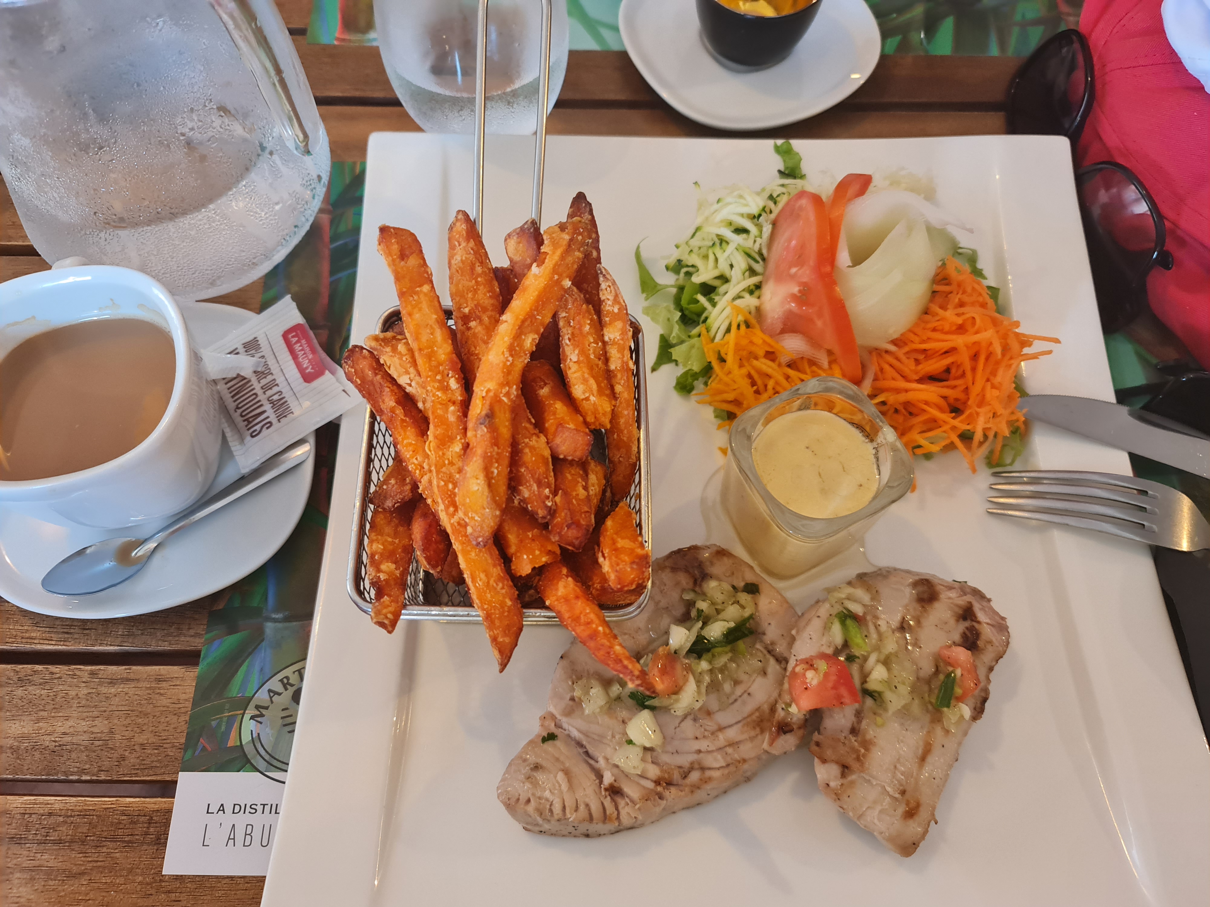 Nous étions ici pour la deuxième fois et avons mangé du poisson, du steak et de l'agneau. Cela fait maintenant 3 semaines que nous sommes aux Caraïbes, d'abord en Guadeloupe puis en Martinique et nous n'avons jamais mangé mieux nulle part. Le dessert, la tarte aux poires, était également de classe mondiale.