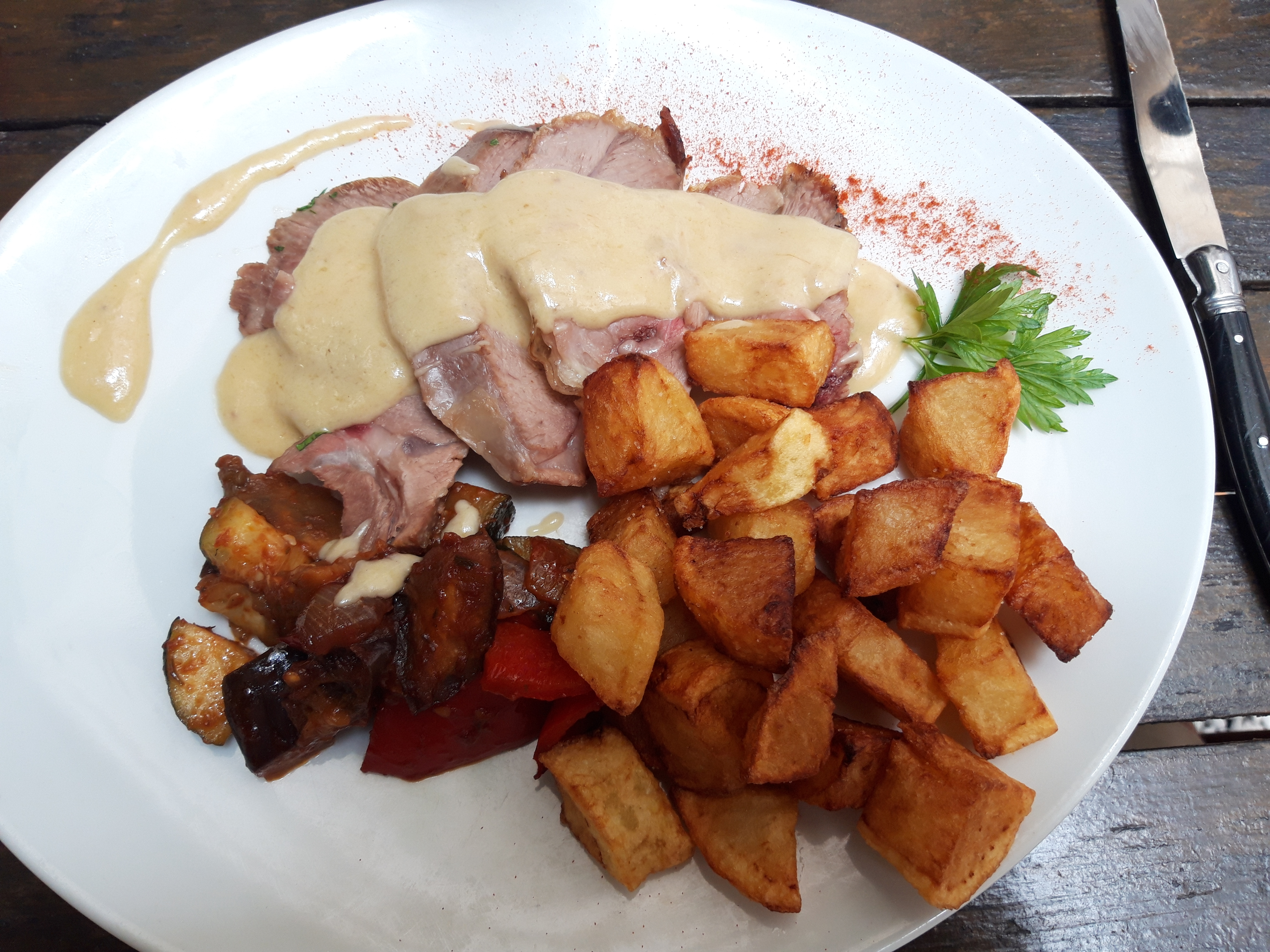 Nous avons très bien mangé : filet mignon accompagné d'une ratatouille et pommes rôties cuisinées maison le tout excellent suivi d'un fondant au chocolat fabuleux. De plus la jeune serveuse était adorable ! Je recommande cette adresse pour ceux qui apprécient la vraie cuisine française.