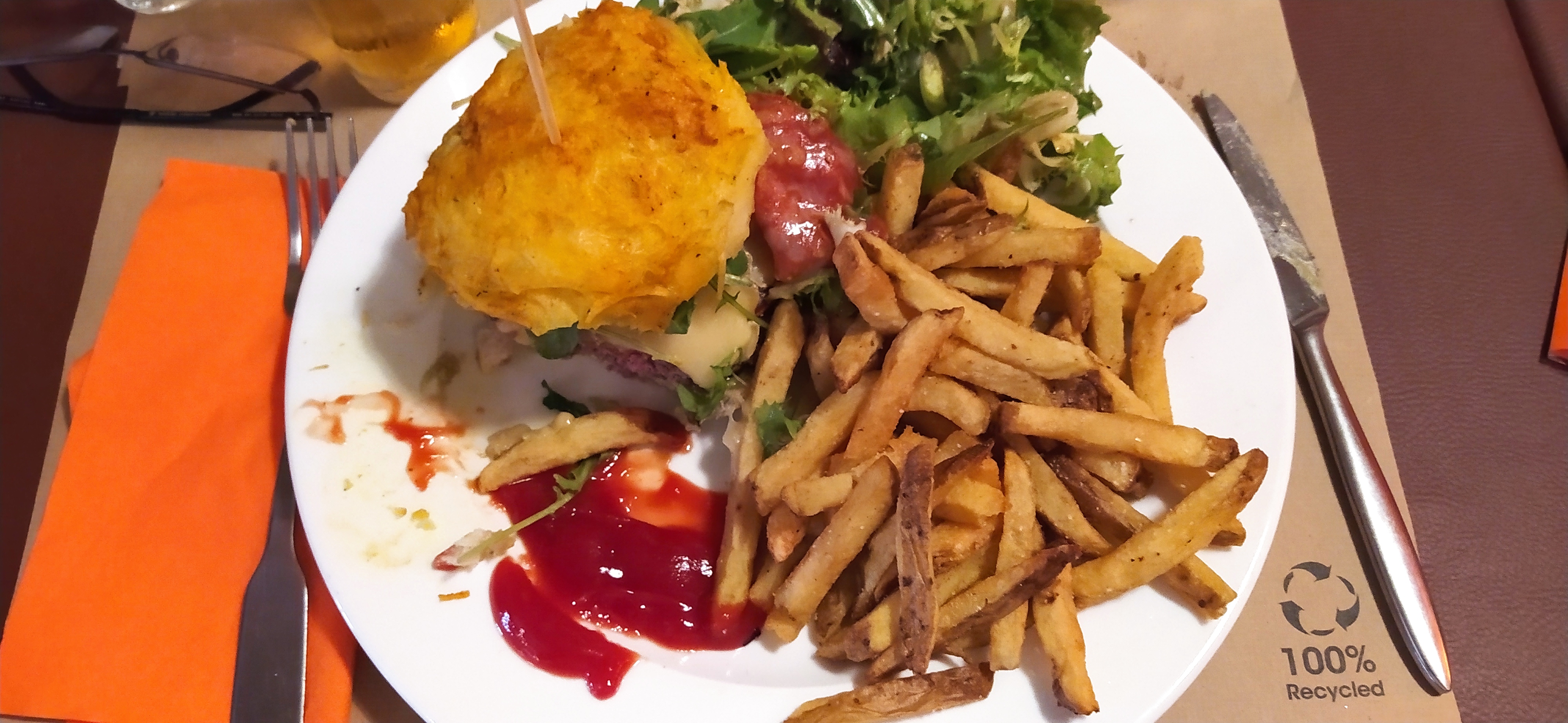 Commande passée a 12h30 attente par apero. Puis par le cidre presque épuisé 😩 à l'arrivée du plat plus d1h après la commande le steak de mon Burger était archi cuit les frites pouvaient ce compter environ une quinzaine. La serveuse voyant nos plats non terminés avec les couverts a l'intérieur nous a demandé si c'était bon et ma femme et moi en cœur avons répondus que non. Regardant mon beafsteak elle m'a dit Ue j'avais sûrement demandé bien cuit ce qui n'était pas le cas car on ne le demande pas pour un Burger. Le patron est passé et nous a proposé de nous offrir un café nous avons refusé. Par contre sur l addition aucun effort. Voilà vous savez tout. A vous de voir. Mais je ne conseille pas. Sis