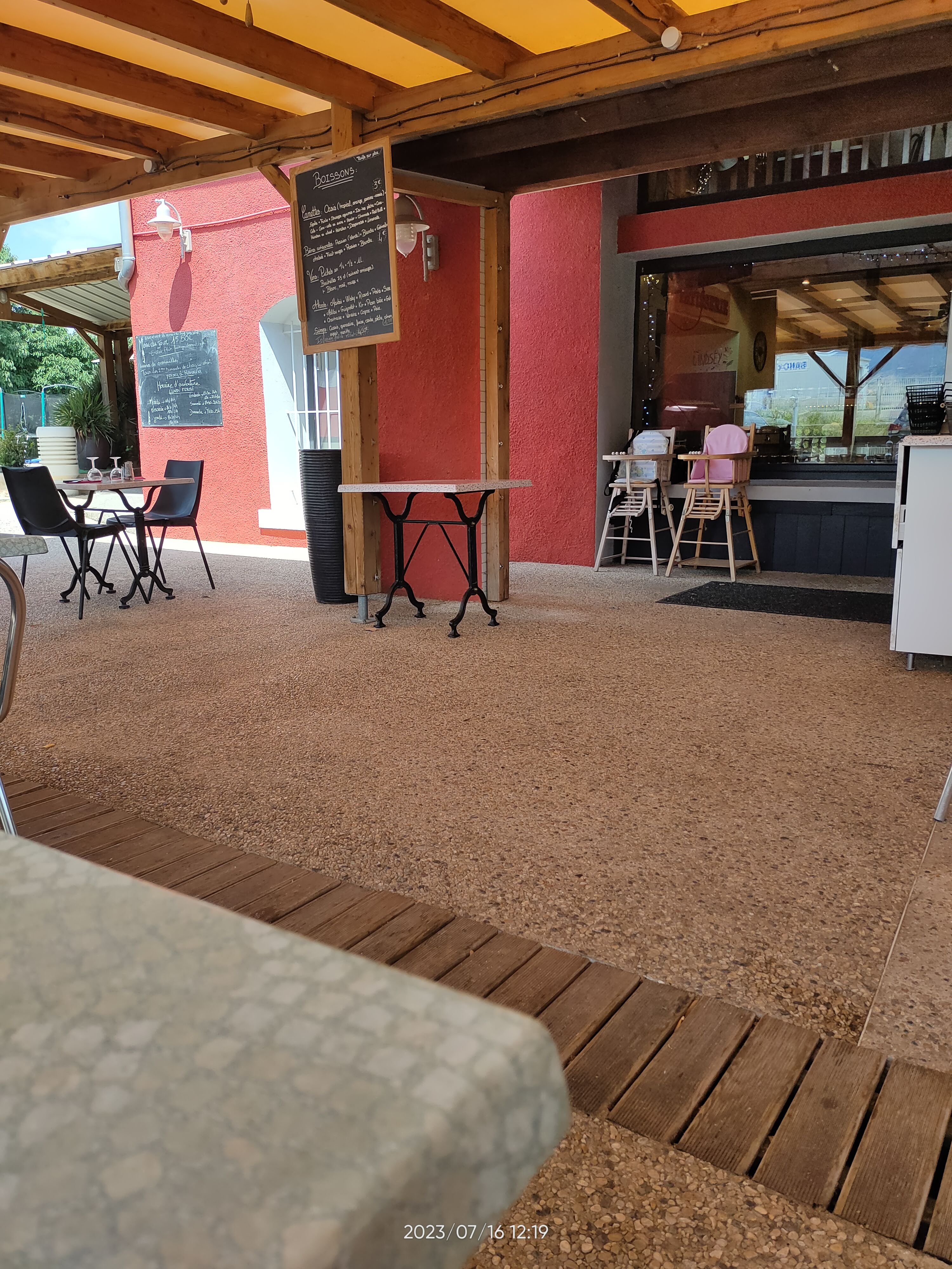 Je me suis arrêté ici en me basant sur les avis google (plutôt bons), et quel ne fut pas mon désenchantement. Ca fait 20 ans que je fréquente des restaurants de toutes sortes, des bons et des moins bons, mais là on est dans le domaine du bas de gamme total. A noter que mon avis ne concerne que l'activité restaurant, je n'ai pas testé le reste. Le plat du jour était composé d'une tranche de rôti de porc, de 2 quenelles collantes et d'une demi-tomate provençale (oui : 1/2 tomate), le tout servi dans une petite assiette rectangulaire 10cm x 20cm. A la fin du repas j'avais l'impression d'avoir mangé une entrée, et pourtant il s'agissait bien du plat du jour facturé 12 euros (alors qu'il y en avait pour moins d'1 euro de matière première, et quelques centimes de savoir-faire). Pas mieux pour les menus enfant à 12 euros (!) : 1 verre de sirop (pas de soda, trop cher), 1 cordon bleu frites et une glace à l'eau. Le cordon bleu bien sûr, était de l'industriel premier prix, mou comme une éponge (il n'est manifestement pas passé par la poêle, mais je suppose simplement chauffé au micro-ondes). Seules les frites étaient correctes. Là aussi, moins d'1 euro de matière première, et un penny de savoir-faire... En demandant des explications, il nous a été dit le prix du menu enfant était celui pratiqué dans les environs, donc on s'est alignés. Je suggère ne pas se limiter à consulter les prix de la concurrence, mais également le contenu de leur assiette, ça serait plus équitable. Autre argument justifiant le prix des menus enfant : la présence d'un château gonflable et d'un trampoline. Pardon mais on n'a pas demandé une entrée dans un parc d'attraction, uniquement un repas (surtout avec cet été pluvieux, ces équipements n'ont juste pas servi, mais tout le monde a contribué à les payer). Bref, nous avons quitté les lieux complètement ébahis par cette expérience. Je m'interroge sincèrement sur le décalage entre notre expérience et d'autres avis lus sur cet établissement. J'espère juste être tombé sur un mauvais jour où le cuisinier manquait d'inspiration. Si ce n'est pas le cas, je suggère de laisse tomber l'activité restaurant, ce n'est pas pour vous !