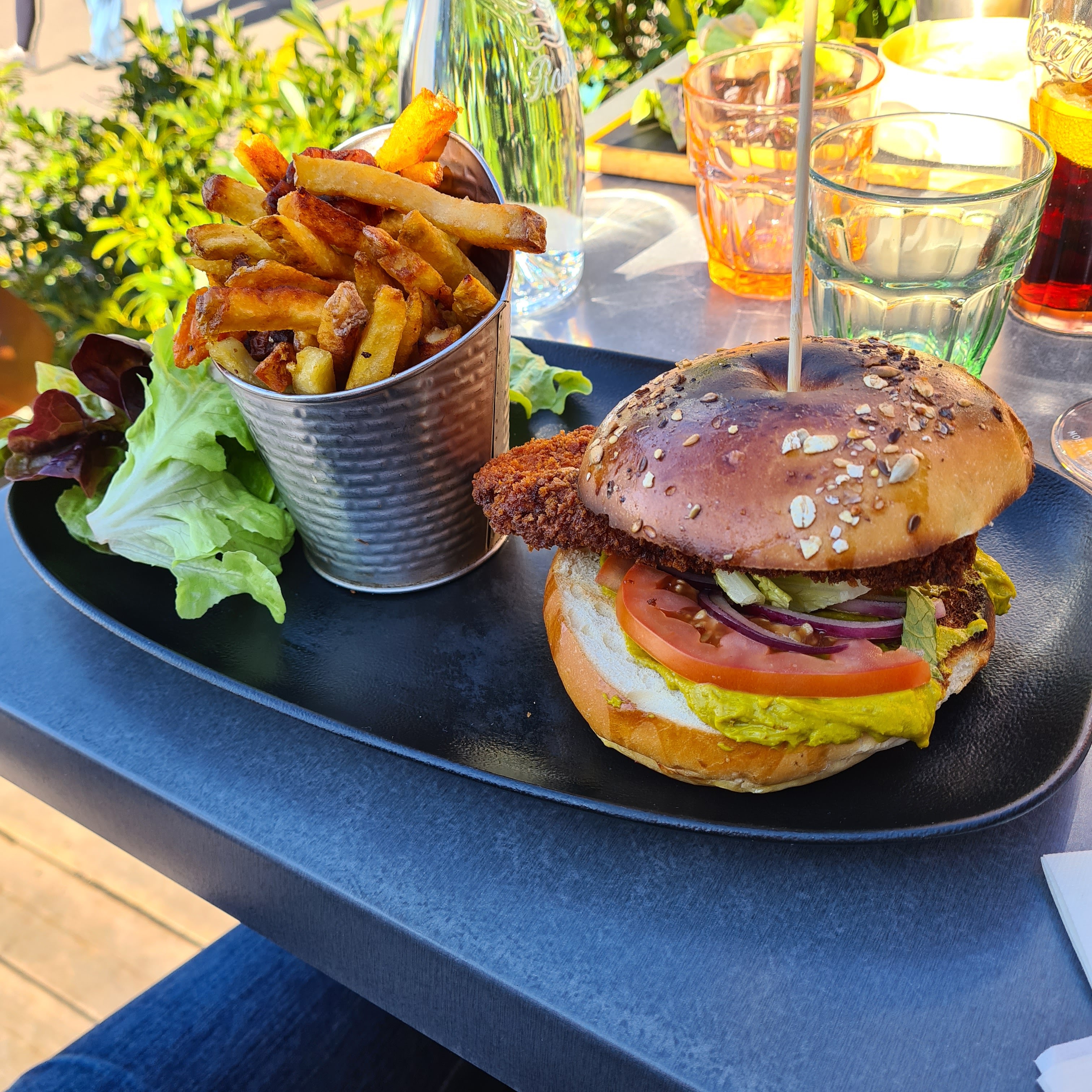 Très déçue de l'avocado bagel...aucun assaisonnement, pas d'intérêt gustatif. Cependant les frites de patates douces étaient bonnes. Super cadre avec vue sur le lac.