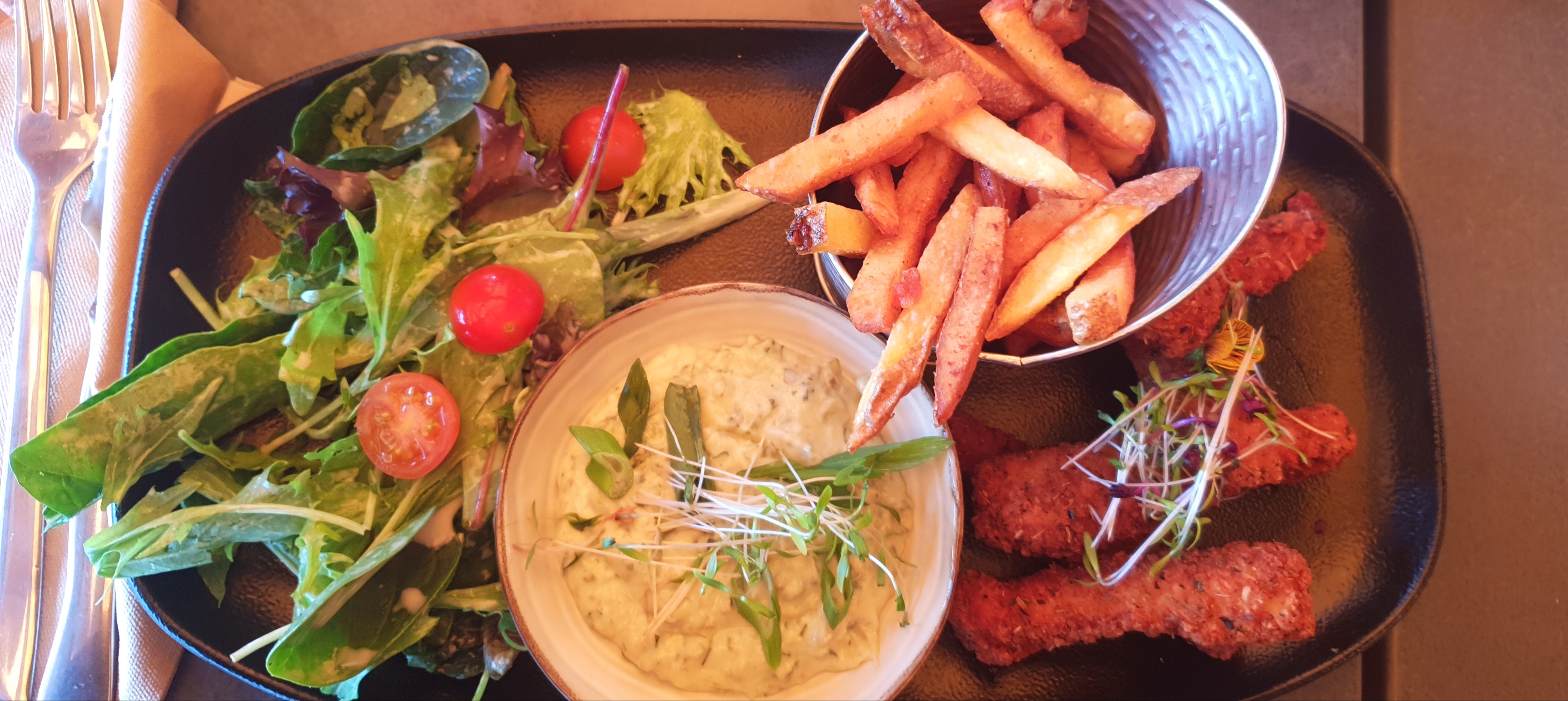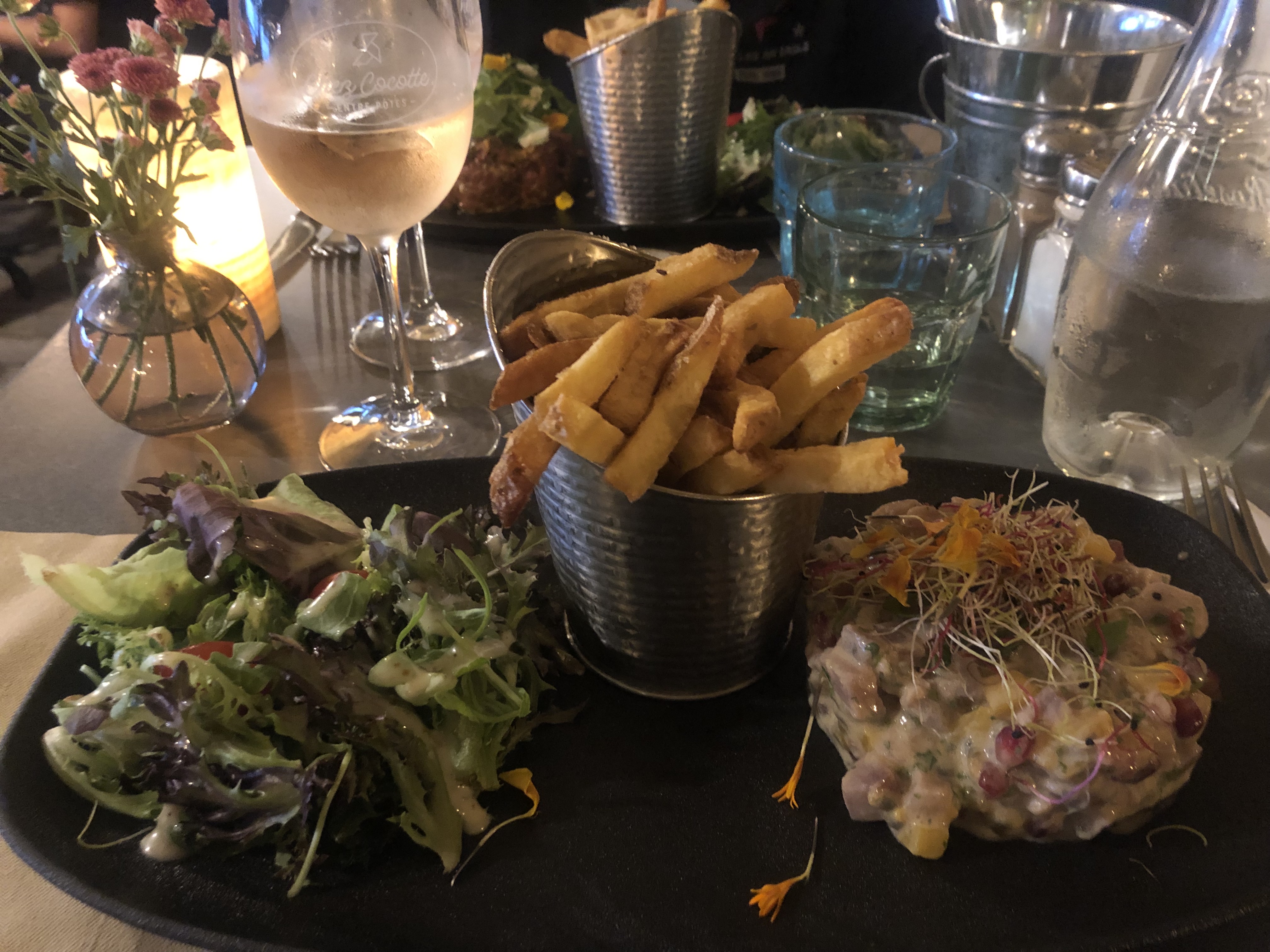 Tartare et ceviche delicieux avec des frites sont super bonnes. La salade est super bien assaisonné avec une moutarde au miel.