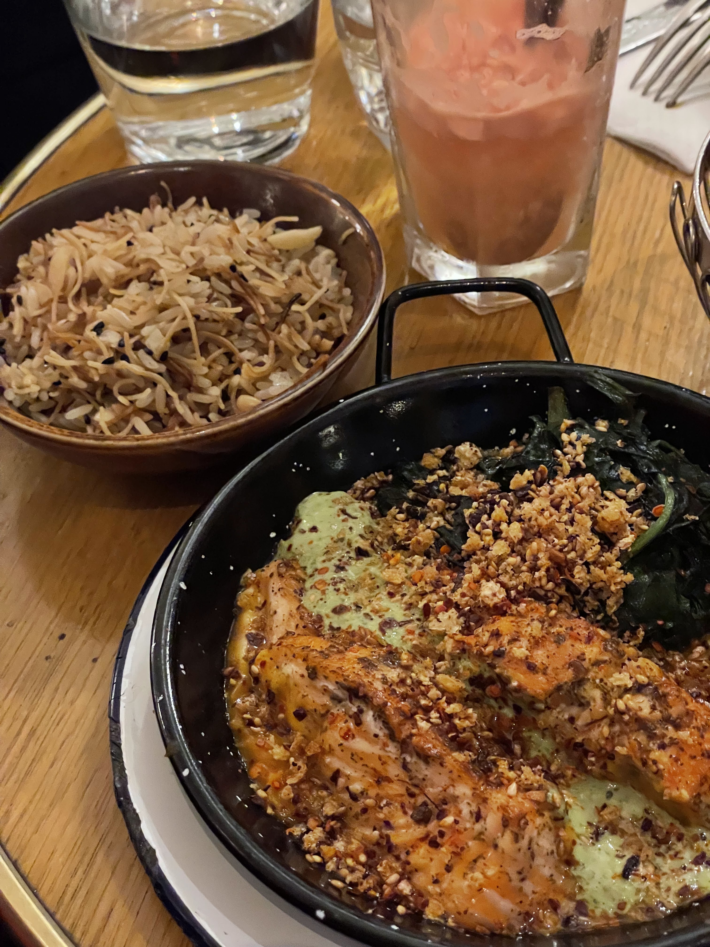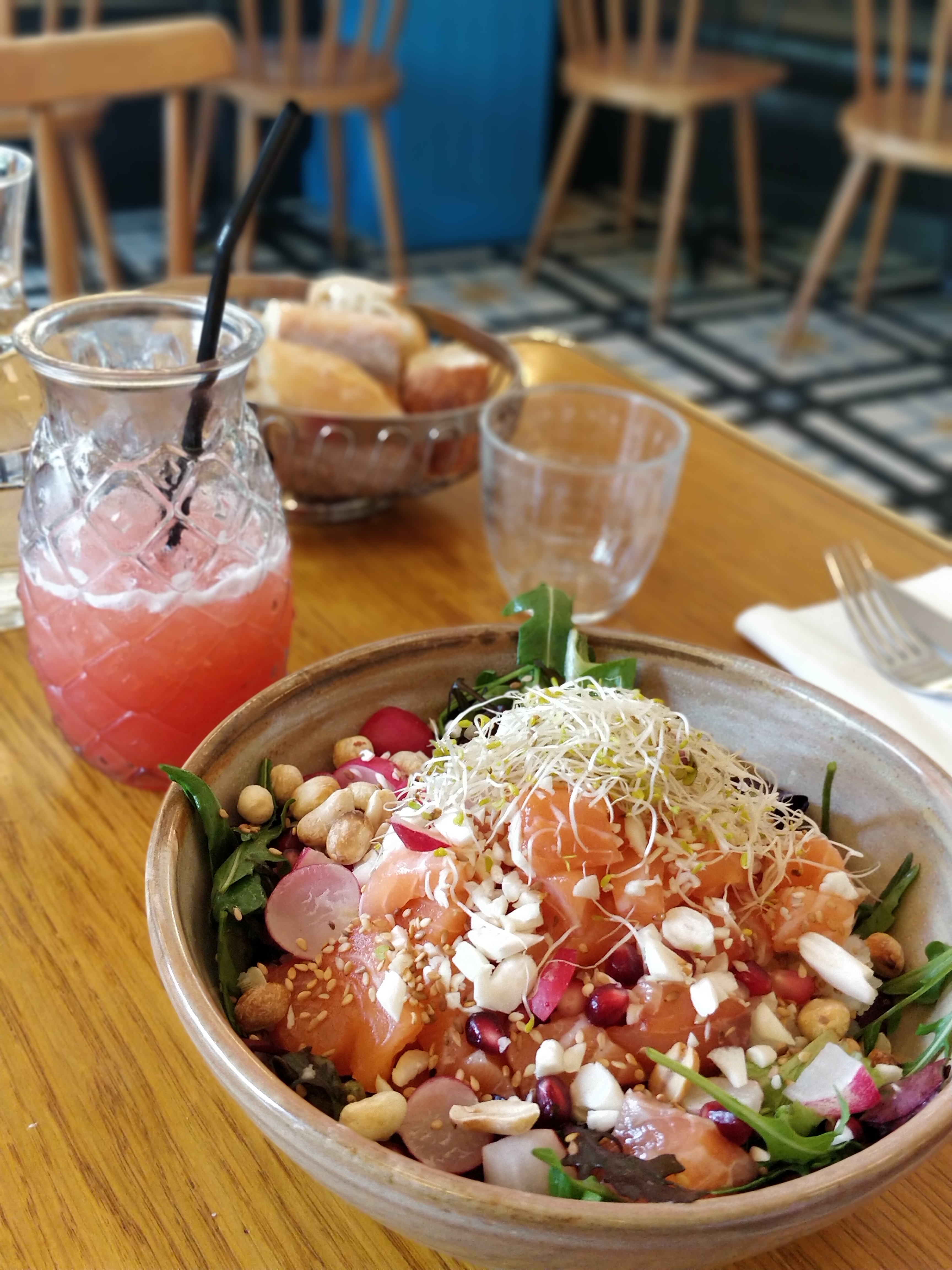 Nous avons pris un saumon et le plat Veggie, avec patates douces, lentilles tofu, etc. Les deux étaient vraiment pas terrible que ce soit en proportion en présentation comme au niveau du goût. Ces deux plats pour 38 € le midi franchement ça ne les vaut pas. La serveuse était sympa. Par contre le serveur qui est venu pour l’encaissement plus froid c’est difficile. Il a même pas demandé si ça avait été ; en fait il a bien fait 😟 Finalement, un endroit plutôt à conseiller pour boire un verre