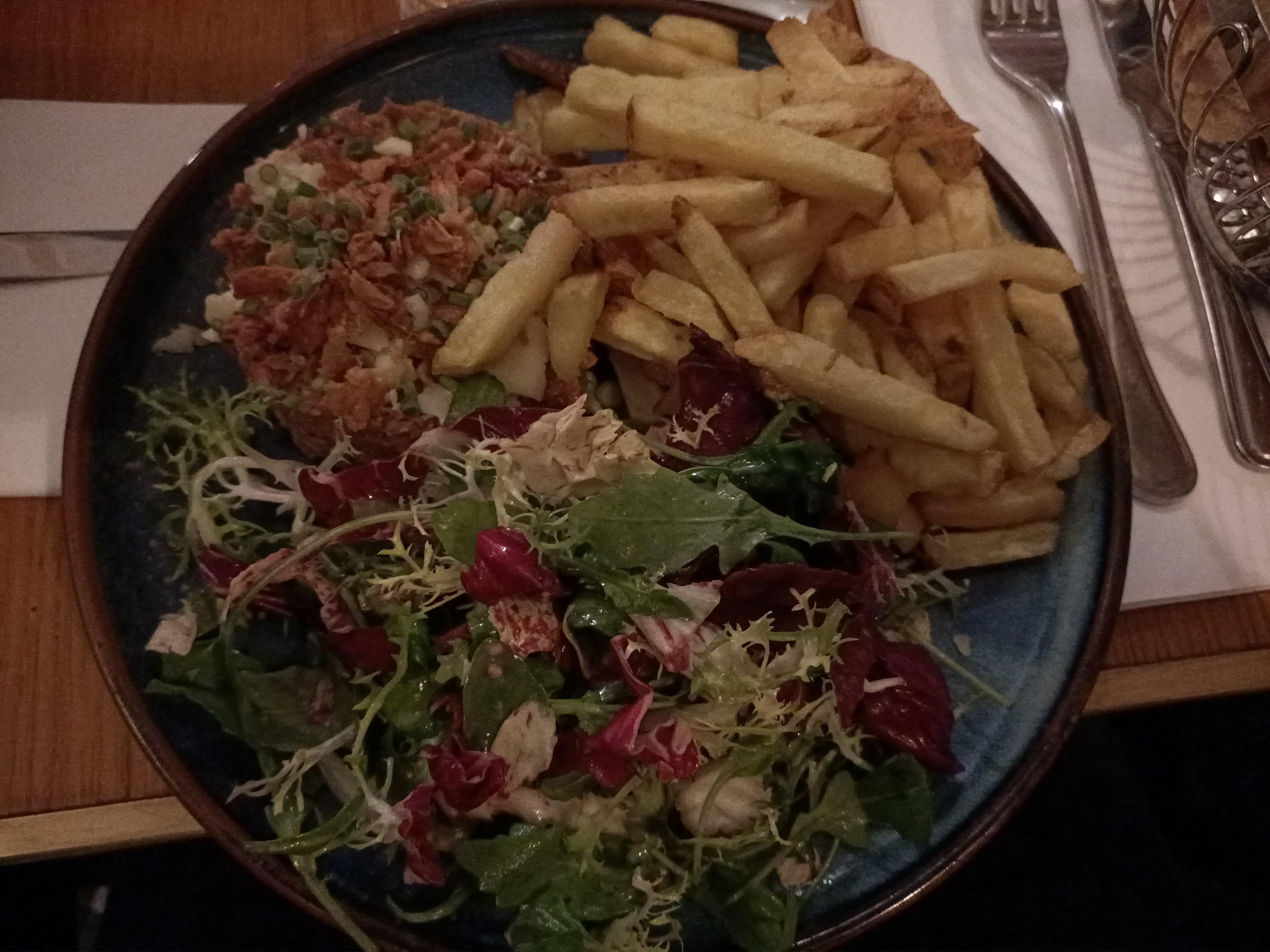 J'ai commandé un tartare de bœuf accompagné d'une salade et de frites. Le tartare était moelleux et sous-assaisonné. Les frites étaient définitivement préparées et frites. C'était croustillant à l'extérieur et sec à l'intérieur. Rien de bon ou de mauvais à dire sur la salade et le pain. J'ai terminé mon repas avec un cappuccino. La forme du cappuccino était pétillante et non lisse comme vous pouvez le voir sur la photo. Donc dans l’ensemble, je note le tartare 3 sur 10 et le cappuccino 4 sur 10.