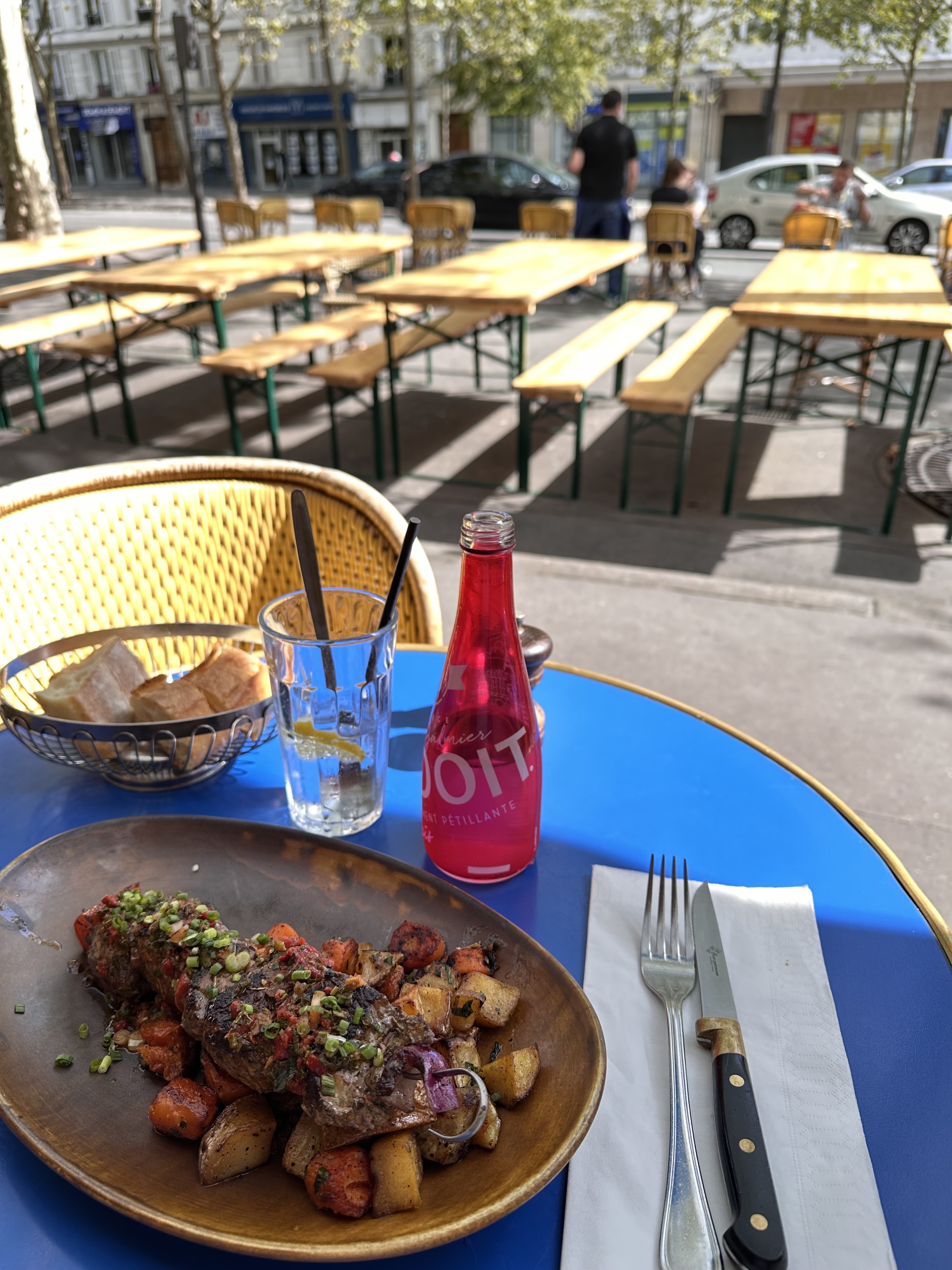 Grande terrasse avec vue sur le boulevard. Assis côte à côte avec mon ami pour admirer celle-ci, je gêne l'accès à la table d'à côté. Le serveur arrive pour prendre notre commande et me le fait remarquer, il restait au moins 20 tables. Sinon la biere était bonne. À noter, ils prennent la CB à partir de 10 balles. Mais à 9 balles la pintes vous y serez facilement.
