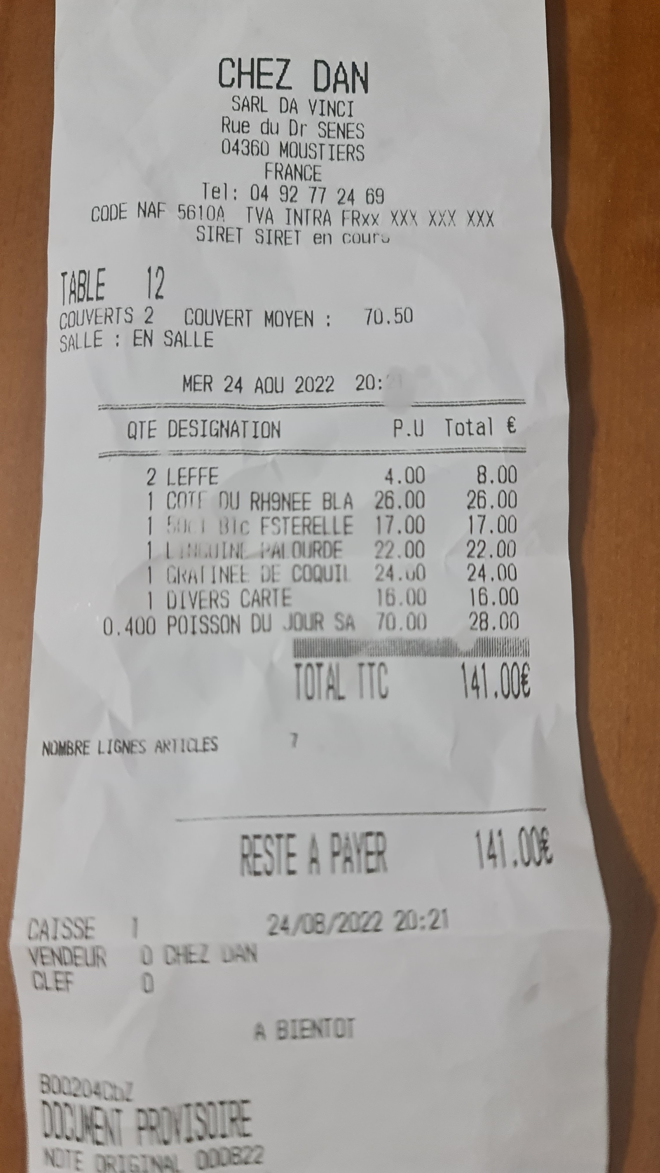 J'y suis allé il y a deux ans et je laisse maintenant un avis. Je ne pouvais pas aller dans d'autres restaurants à l'heure du déjeuner car il n'y avait pas de places disponibles. Je suis allé chez Dan parce qu'il avait une note élevée sur Google Maps, mais la porte était fermée et elle ne semblait pas ouverte, alors j'ai essayé de me retourner, mais le propriétaire a ouvert la porte et est sorti et est entré. Ce jour-là, il n'y avait pas d'autres clients que notre table, donc je me demandais si je pouvais faire confiance à la note. Le propriétaire ne parlait pas très bien anglais, alors j'ai simplement commandé une variété de plats dans le menu. Au final... c'était le meilleur restaurant que nous ayons eu lors de notre voyage de 2 semaines en France ! Les pâtes et autres plats étaient vraiment délicieux et le plat de poisson était le meilleur que j'ai mangé depuis des années. C'est un restaurant situé à l'intérieur de la France, et j'ai été surpris que le poisson puisse être grillé aussi frais et équilibré. Même si nous n'avons pas bien communiqué, le propriétaire était gentil et les enfants étaient satisfaits. Si jamais je voyage dans le sud de la France, c'est un restaurant dans lequel j'ai vraiment envie de retourner.