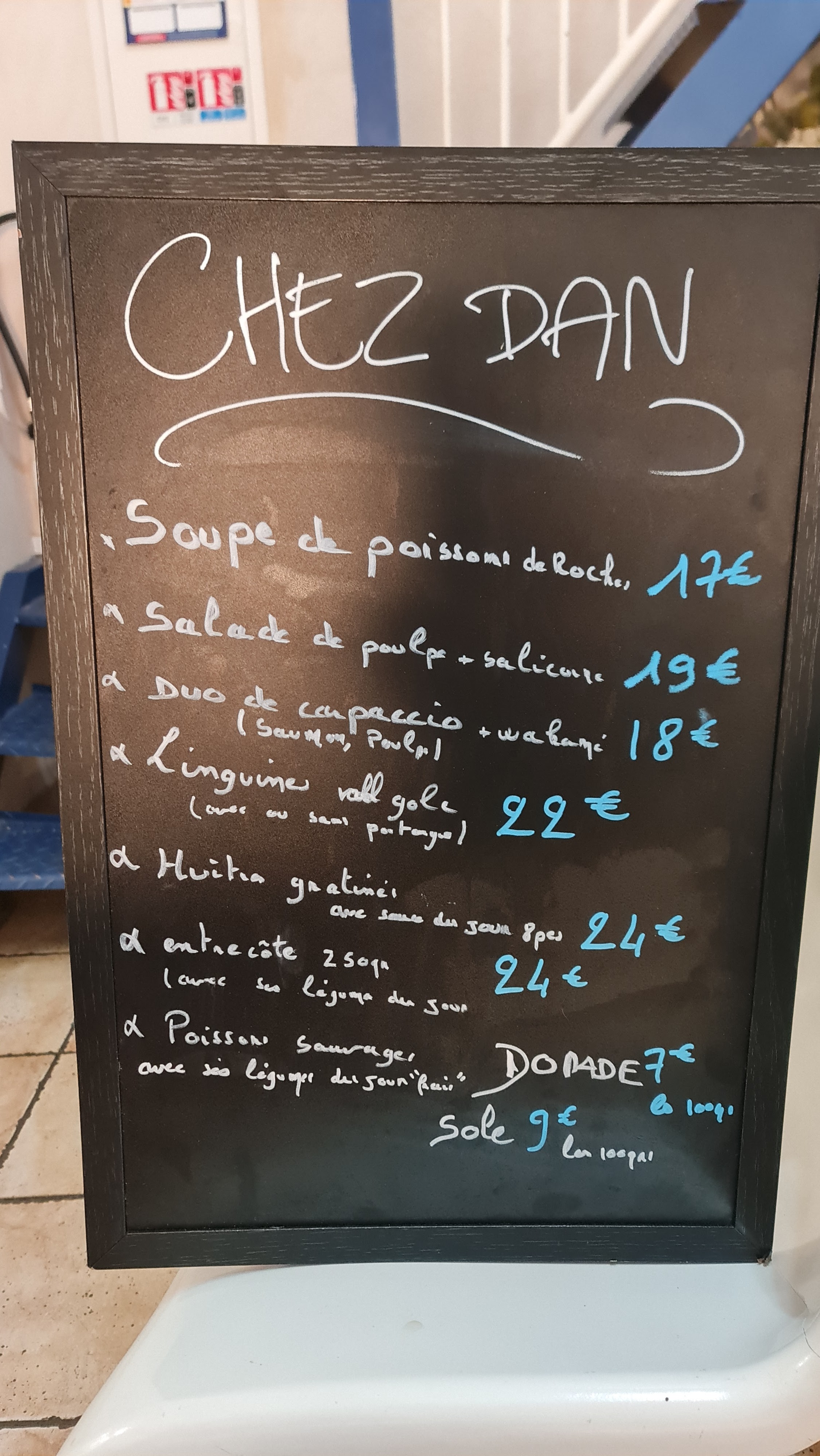 Ne zappez pas cet endroit si vous aimez les produits de la mer..............vous serez ENCHANTÉS !!!!!!!!! UN VRAI REGAL POUR LES YEUX et pour les papilles!!!!!!!!! Et le cadre est très cosy.....intimiste en été.....une petite terrasse de 3 tables.....vous tomberez dessus en redescendant de la Chapelle .........CHEZ DAN !