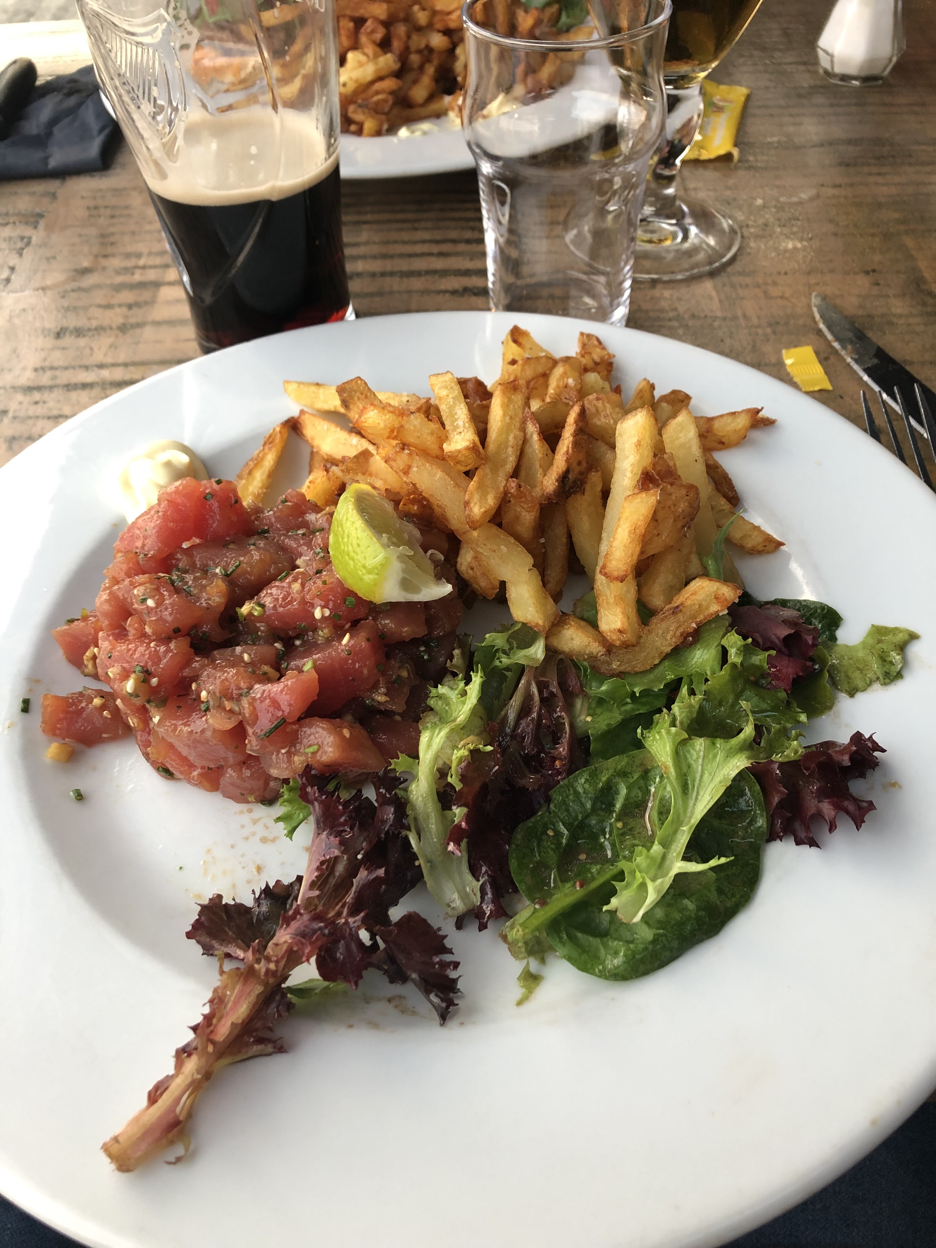 Très bien pour tout ce qui est ambiance, service :viande /frites parfait, j’ai pris un thon immangeable, trop salé et les nouilles moyen. Donc s’en tenir aux classiques.