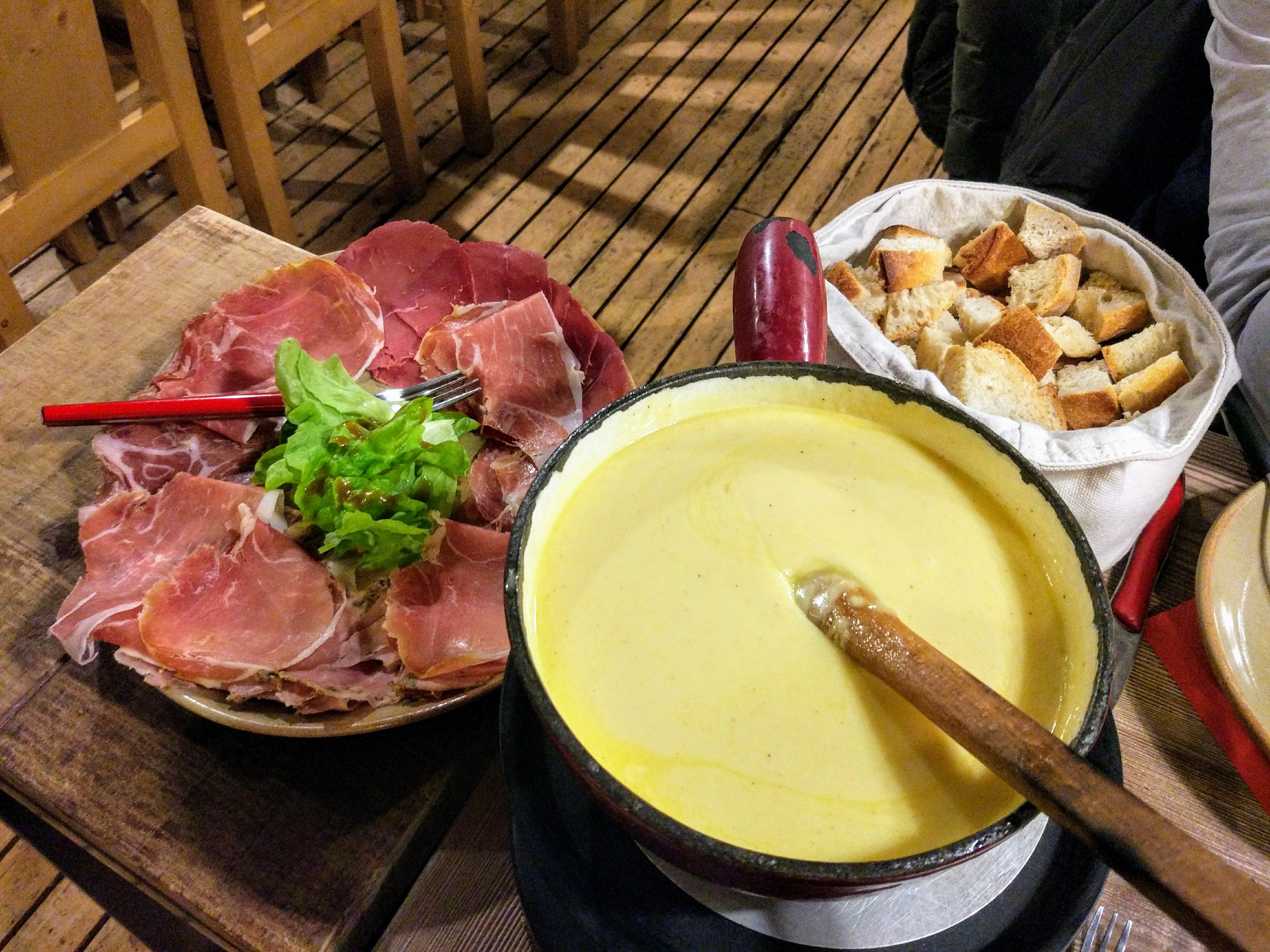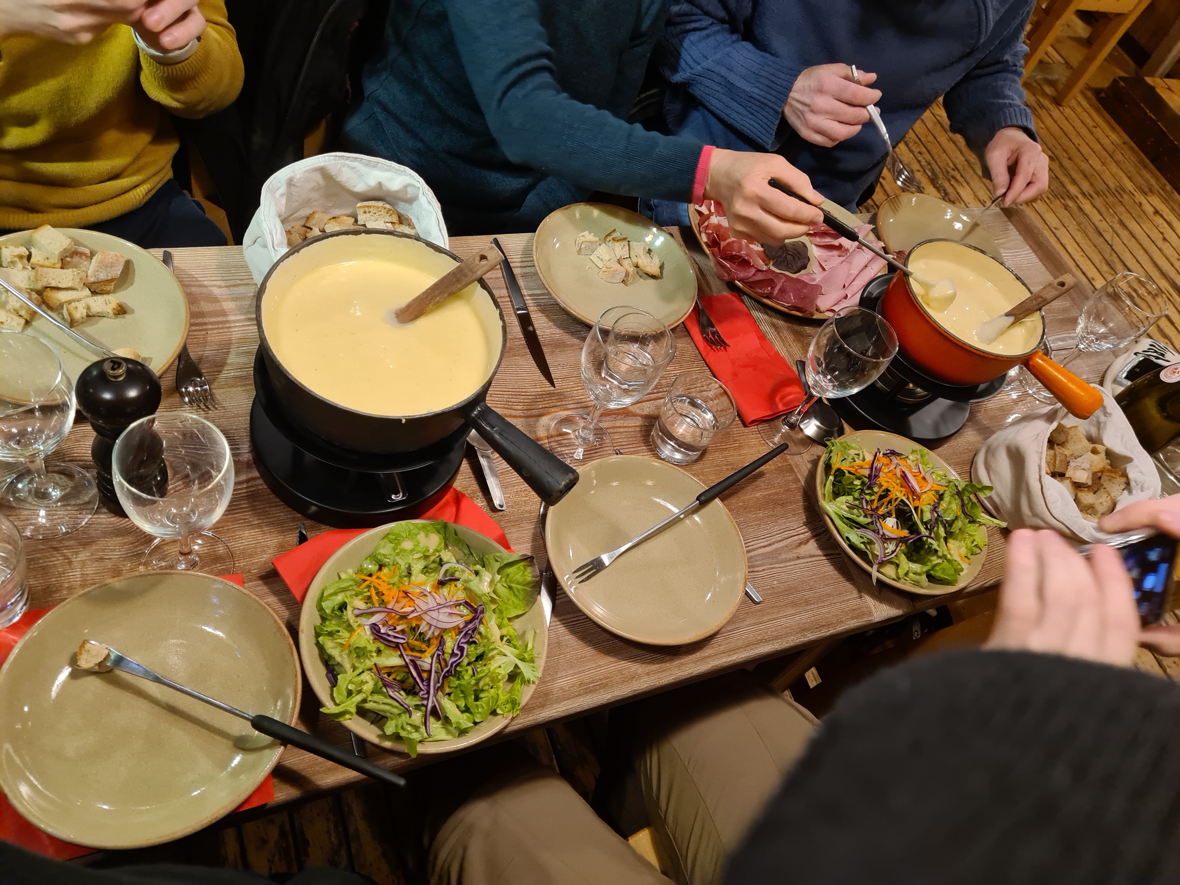 Fondue savoyarde excellente ambiance avec un assortiment de charcuterie