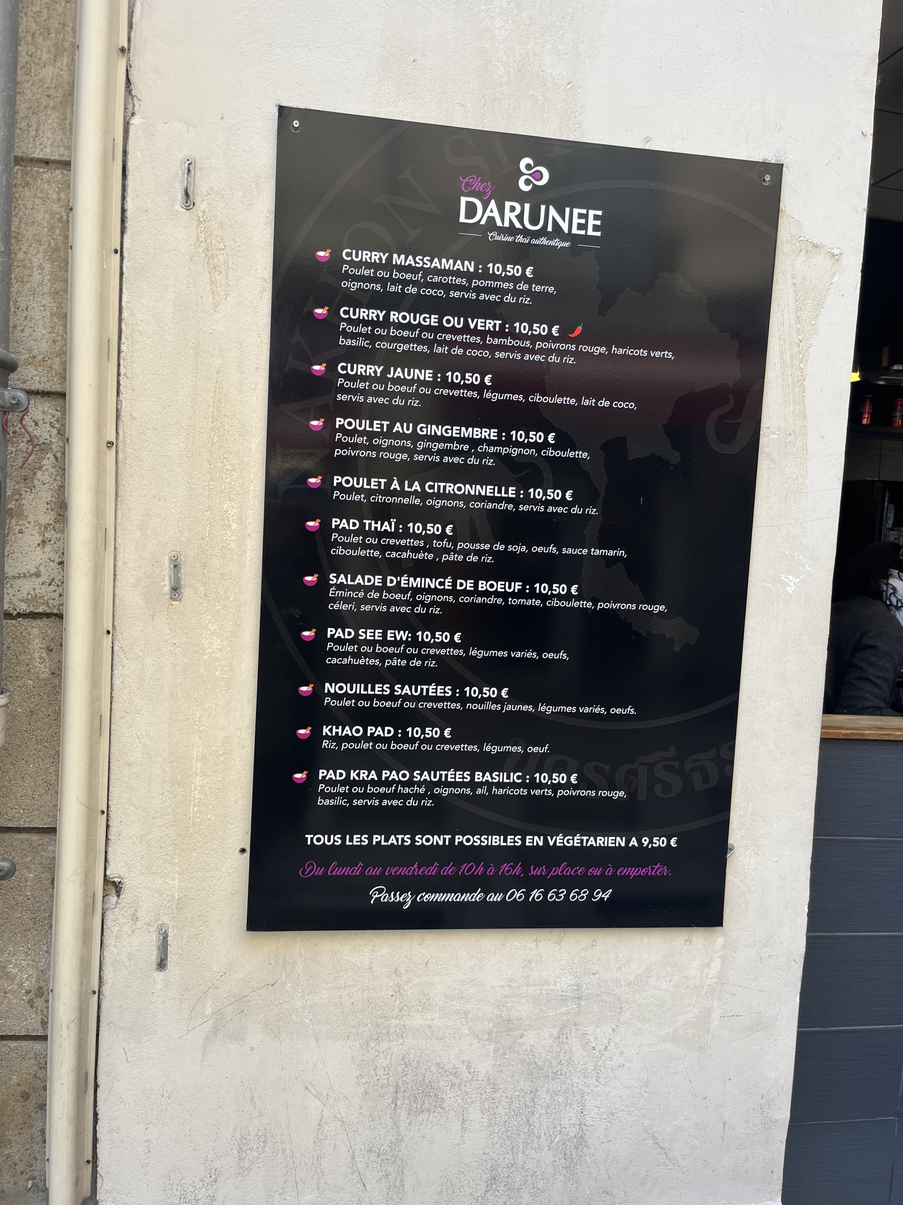 Dès qu’on a un chantier dans le secteur un passage chez darunee est obligatoire . De un pour se régaler et de deux pour faire partager à ceux qui ne connaissent pas car son curry rouge épicé est à tomber par terre .