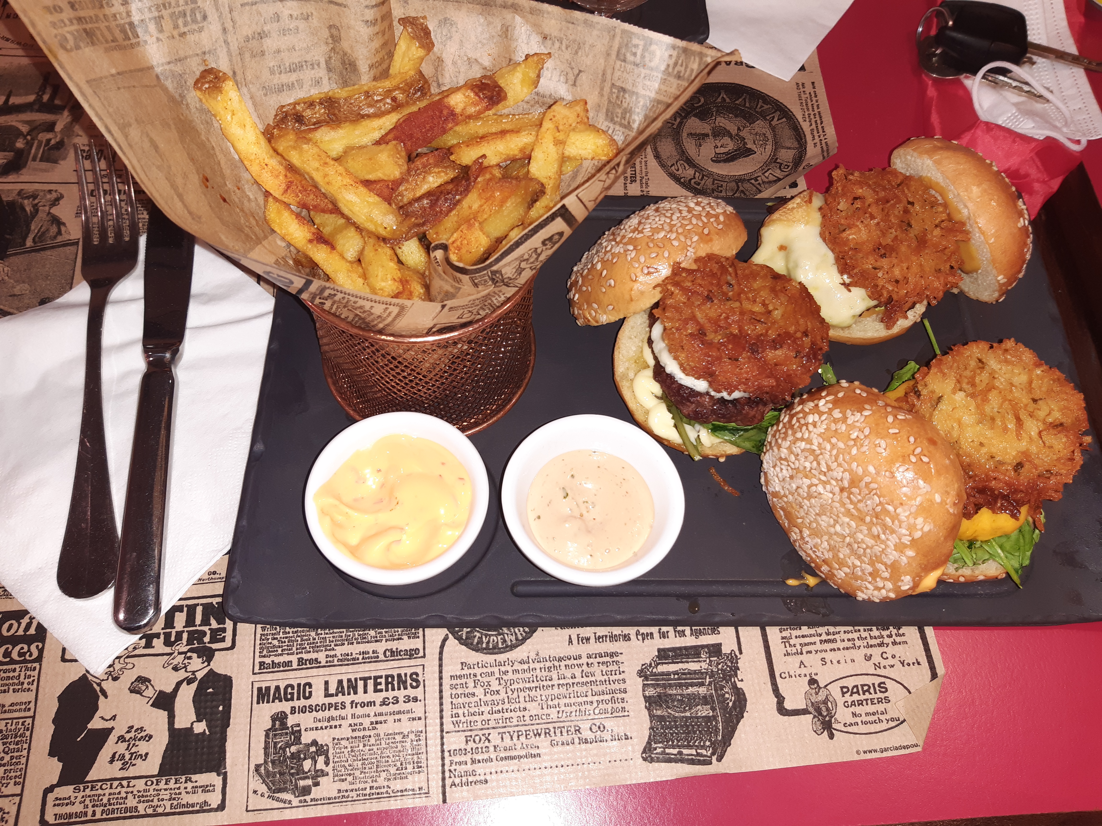 Super bon, nous nous sommes régalés. Amateur de burger nous avons pris la grande armée ( dégustation de 3 petit burger) un délice, l'un de meilleurs que nous avons mangé. Les frites un régale cuissons parfaite et le dessert super touche sucré pour terminer en beauté. Seul un problème de logistique (que nous esperons sera reglé rapidement) nous avons attendu trop trop longtemps , mais nous reviendrons tout de même car les estomacs en redemandent.