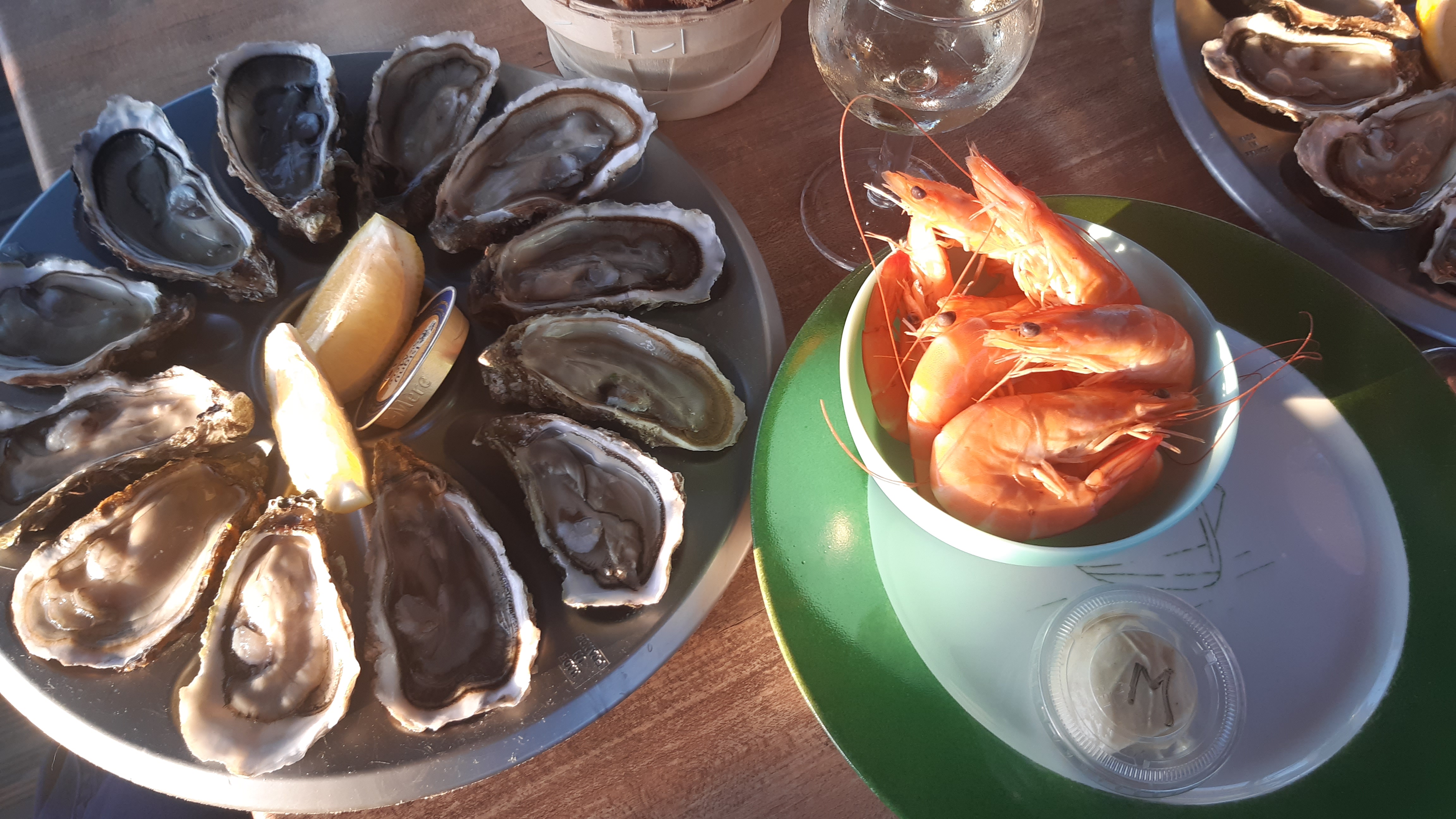 Crevettes, huîtres, pâté et vin blanc. Tous très bons!!!