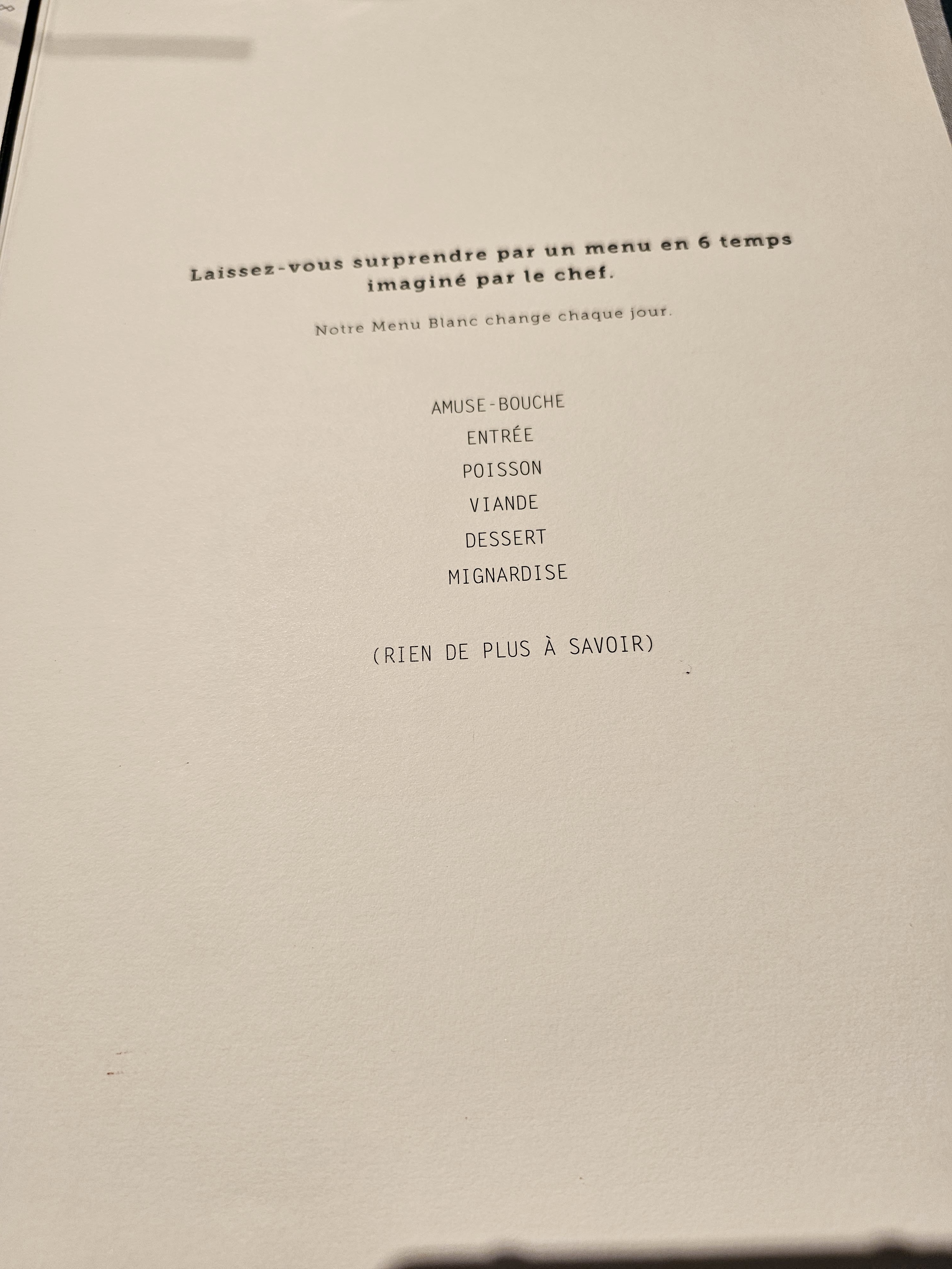Pour mon anniversaire, nous avons choisi le menu blanc qui est une aventure surprise en 5 mets ! Nous ne regrettons pas car chaque met est une véritable surprise en saveurs ! 😍 Par contre, on est resté un peu sur notre faim à la fin. Je recommande !