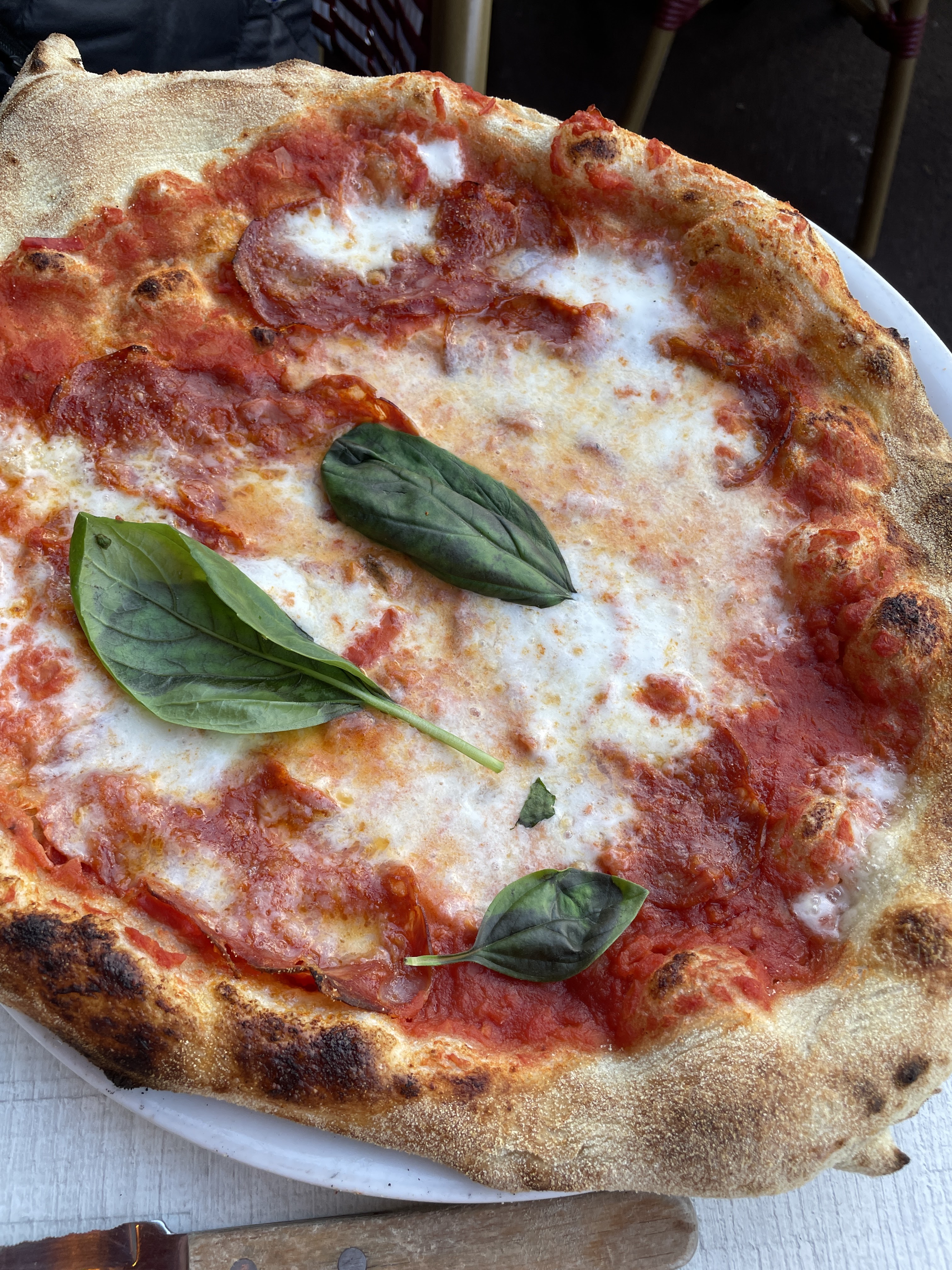 Pâte de pizza molle, difficile à couper avec le couteau fourni. Tables étroites. Lieu sans âme, repris à un ancien bistrot, la décoration et comptoir maintenus ainsi que les vitres oxydés. Extrêmement bruyant, impossible de se parler, nous avons mangé à la hâte pour sortir au plus vite. Il est mentionné une terrasse, en fait vous êtes sur le trottoir sur une des rues les plus passantes de Fontainebleau : les cars de touristes stationnent à deux pas, l'entrée de château est à côté. Nous avons mangé à l'intérieur aussi bruyant qu'à l'extérieur! Pizzeria à fuir. D'accord le personnel est italien mais cela ne suffit pas pour faire une bonne adresse. Je regrette d'avoir eu à donner cet avis défavorable.