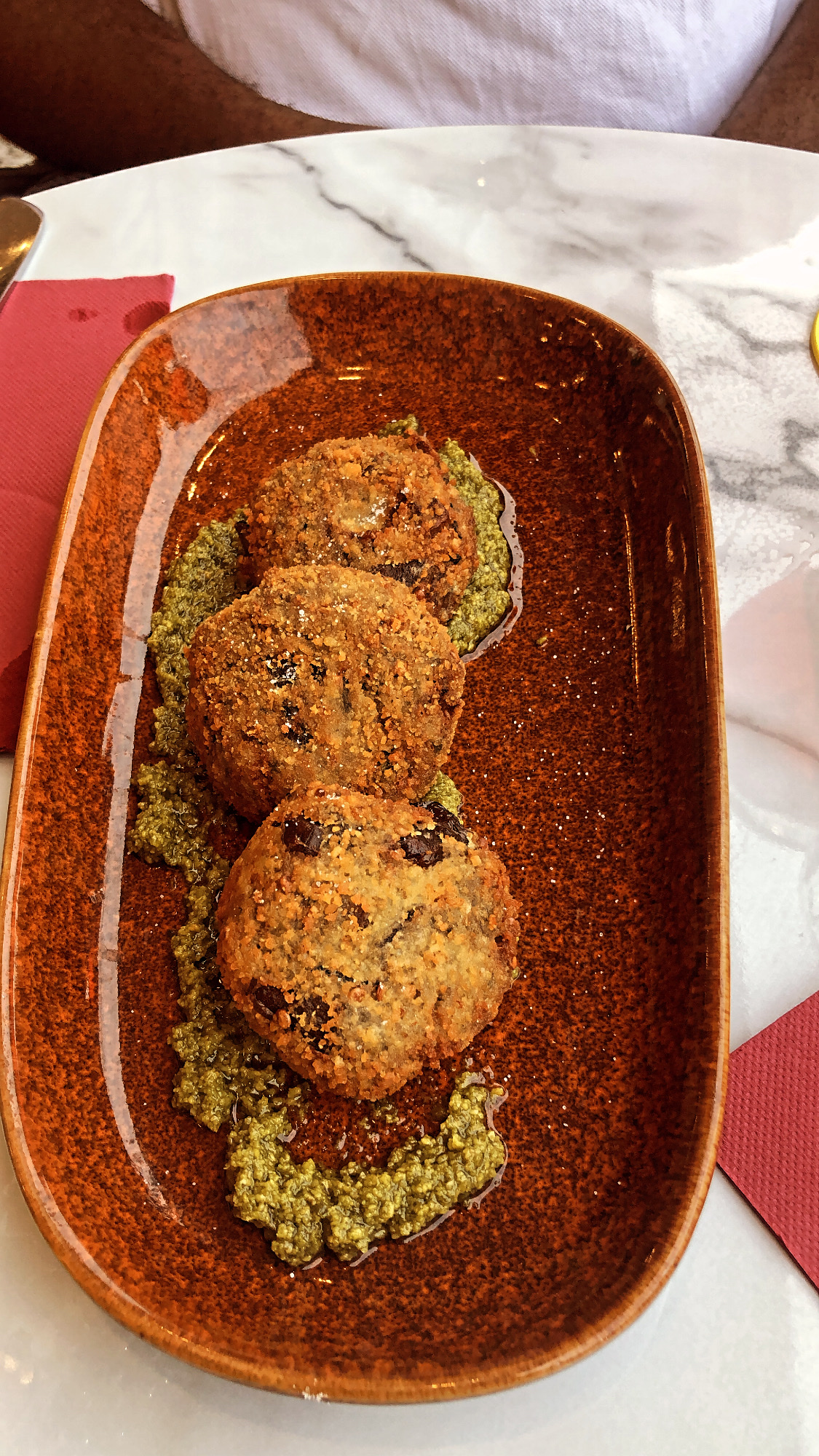 La nourriture est magnifique sur les réseaux mais malheureusement nous n’avons pas pu goûter !!! Après 30min d’attente, toujours personne pour prendre notre commande. Le serveur nous a dit de nous estimer heureux d’avoir été placé directement à notre arrivée, chose qui me paraît normal dans la restauration quand on réserve une table une semaine à l’avance. Une chaleur à l’intérieur à vous faire mourir à petit feu, et pas une bouteille d’eau de mise sur la table pour s’hydrater. A éviter un soir de canicule. Oh mais pardon, je cite ce serveur une nouvelle fois, c’est de notre faute, nous aurions dû, nous client, réclamer qu’on vienne prendre notre commande. Sinon, pour commenter ce qui est commentable, les tables sur la terrasse sont collés à la route, un samedi soir dans Fontainebleau, cela doit être sympa de déjeuner avec les passants qui effleurent votre table. La salle a l’intérieur est minuscule et pourtant on ne s’entend même pas parlé tellement il y a un bruit énorme. Les toilettes sont très sales pour des toilettes après un seul service. A tester probablement à emporter mais certainement pas sur place. Et vous verrez sûrement la réponse du patron, ce sera évidemment de la faute du client.