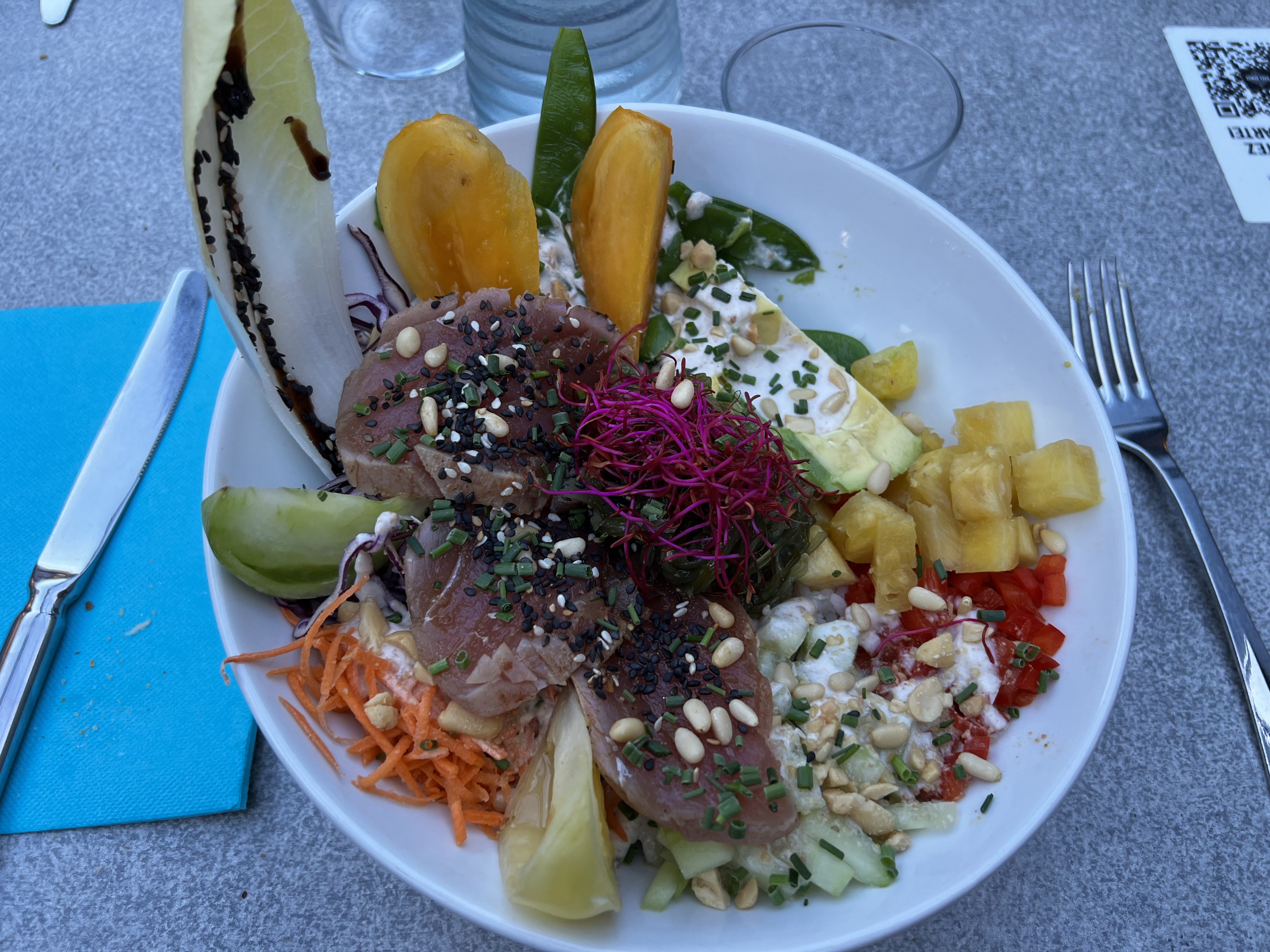 Plats très bons, mention spéciale pour le poke bowl très copieux et savoureux ainsi que pour la crème catalane. Les nuggets maison étaient également très appétissants. Petit bémol concernant la propreté de la vaisselle. Personnel très accueillant et souriant. Nous conseillons ce restaurant.