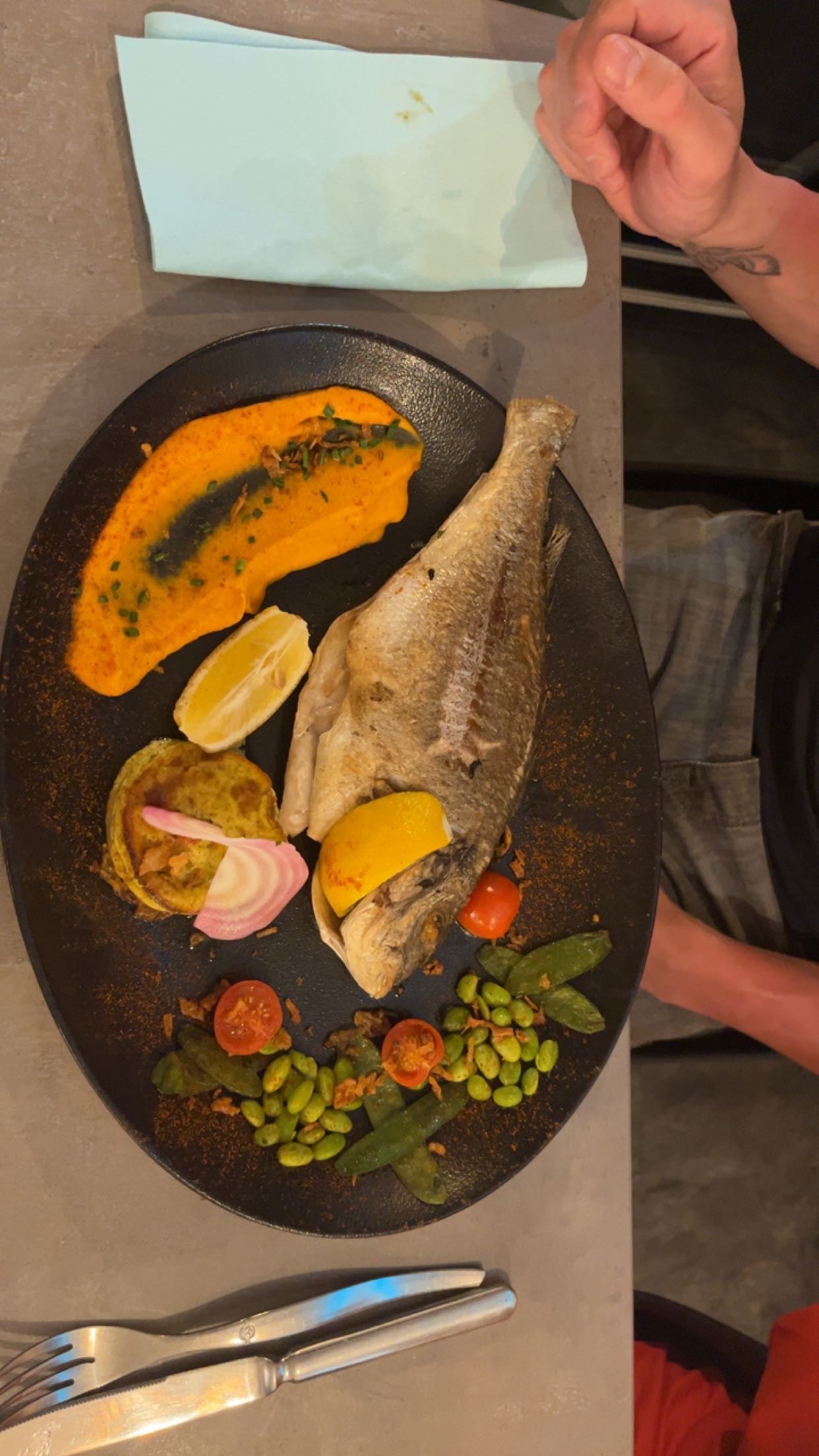 Accueil un peu froid ont sent la fatigue des serveurs, poisson entier découper par le serveur, plein d'arrête et pas trop de goût l'accompagnement était très léger, le tataki de thon a été apprécié la terrine de poulet était bonne aussi, le bœuf été bon mais un peu trop cuit. Wc propre. Deco simple.