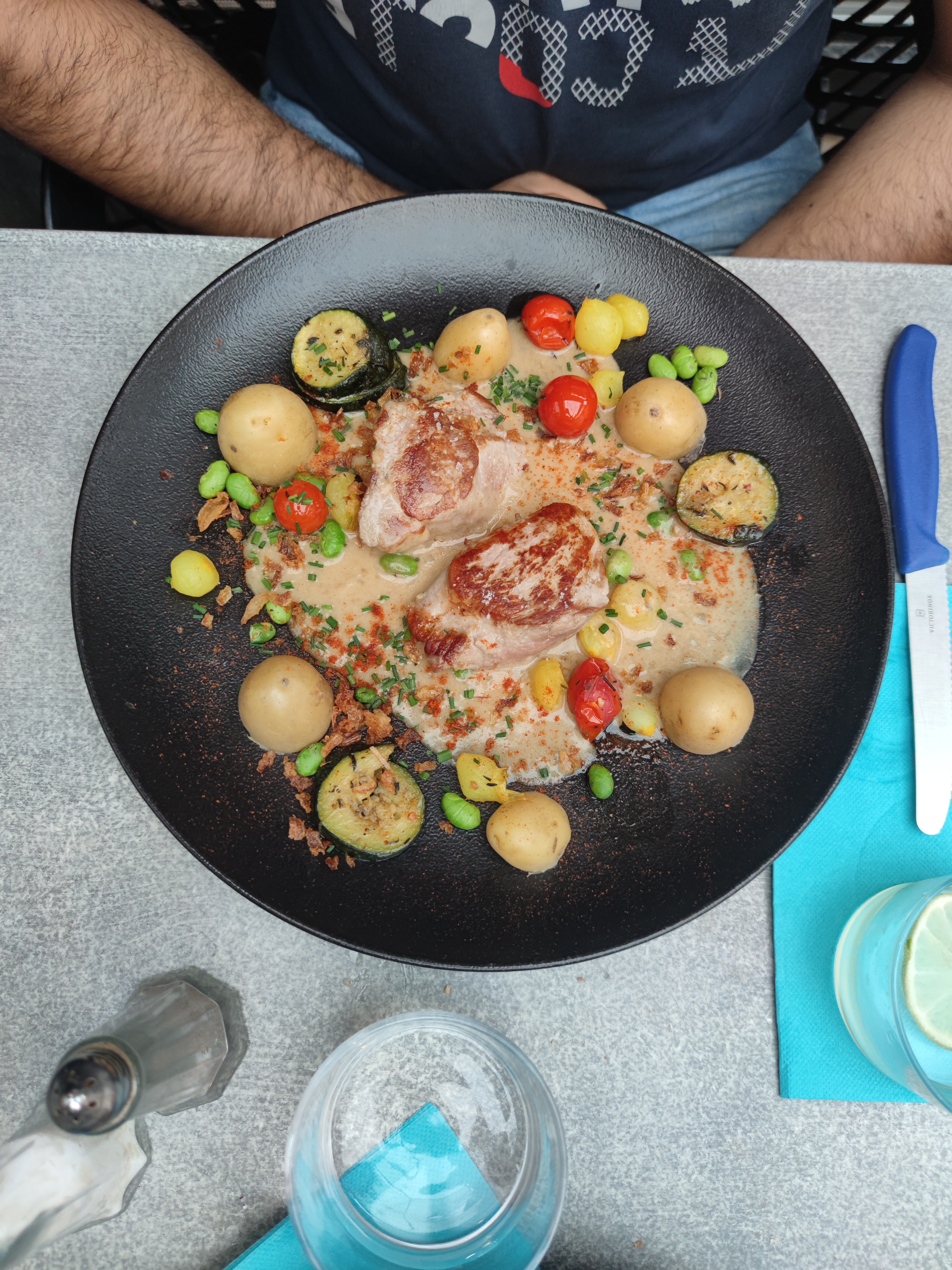 Serveurs sympathiques et rapide. Quelques petits couacs dans la commande qui avait été faite par rapport à la carte internet non mise à jour et donnée à la serveuse qui débutait. la viande rouge servie à la place du filet mignon n’était pas extraordinaire.. mais en dehors de ça, le reste était bon et ils ont tout fait pour être des plus efficaces et présents malgré le monde et leurs deux terrasses.