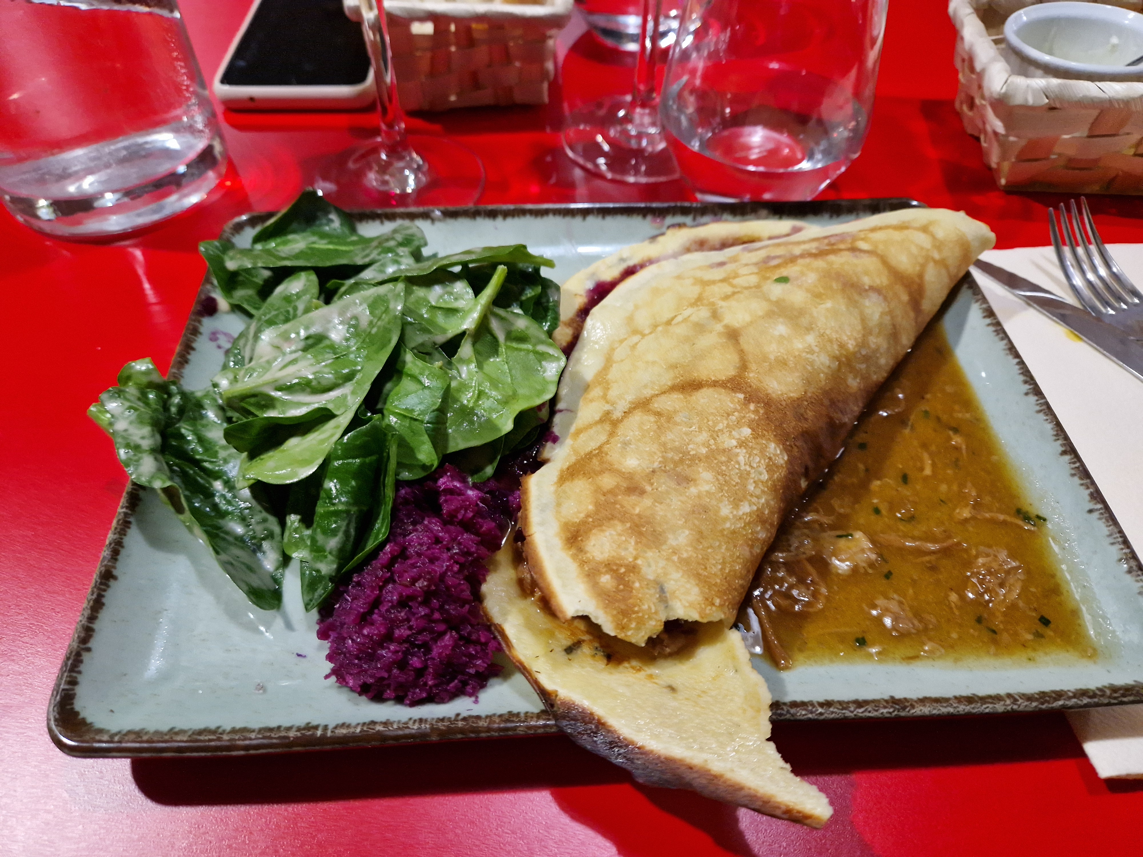 J'ai bien mangé mais ce n'est pas le cas de toute la tablée. La volaille - suggestions du jour était très bonne, de même pour les accompagnements, le coulant au chocolat était bien coulant mais je m'attendais à une meilleure association avec le cassis. Le wrap avec une crêpe, pourquoi pas mais c'est vrai qu'elle ne faisait pas envie, épaisse et bien bien brunie. Le financier lui aussi était coulant, j'ai cru qu'il y avait une compotée à l'intérieur mais non juste pas cuit, pas normal. Voilà expérience mitigée mais pas désagréable globalement.