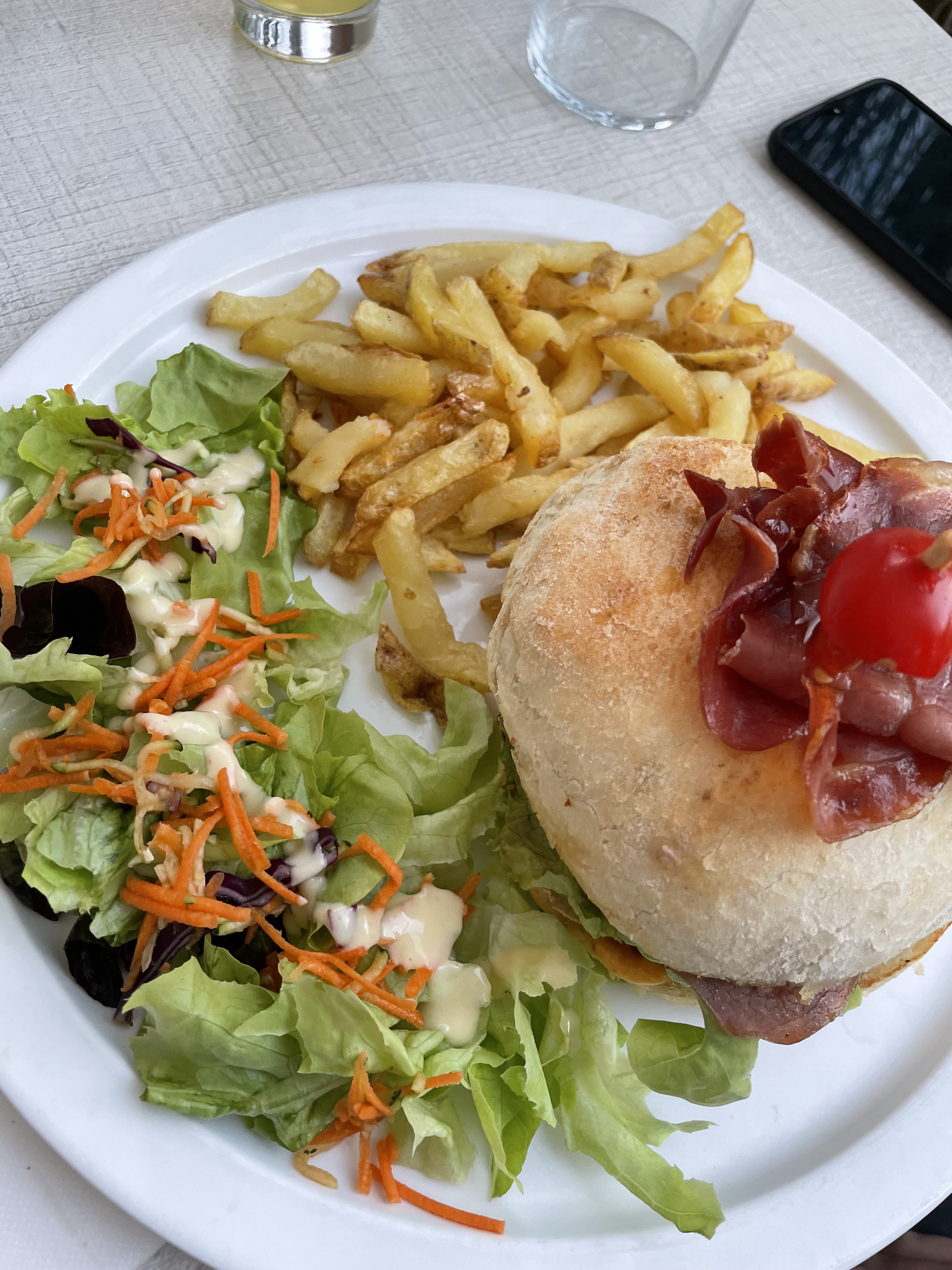 Assiette copieuse .frites maison est super bonne pas grasse.serveuse très sympathique malgré mes exigences sans piment.a decouvrir