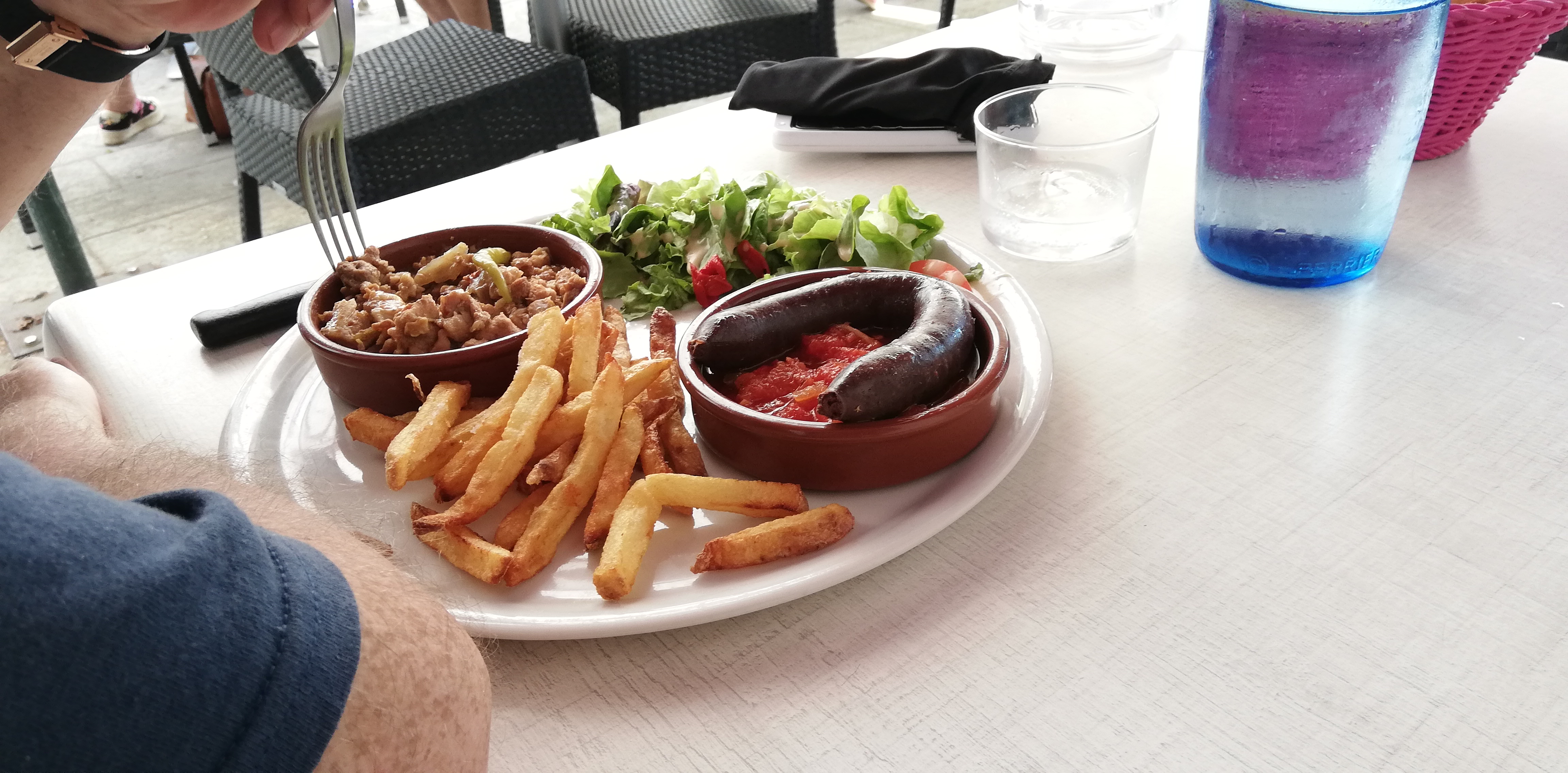 Mauvais accueil!!impossible de manger sur les tables au soleil ??!! Très froid a l'ombre ,surtout au pays basques après la pluie, peut-être que le serveur aime manger dans les courants d'air ? Je pense qu'on l'embêter, le menu bof....