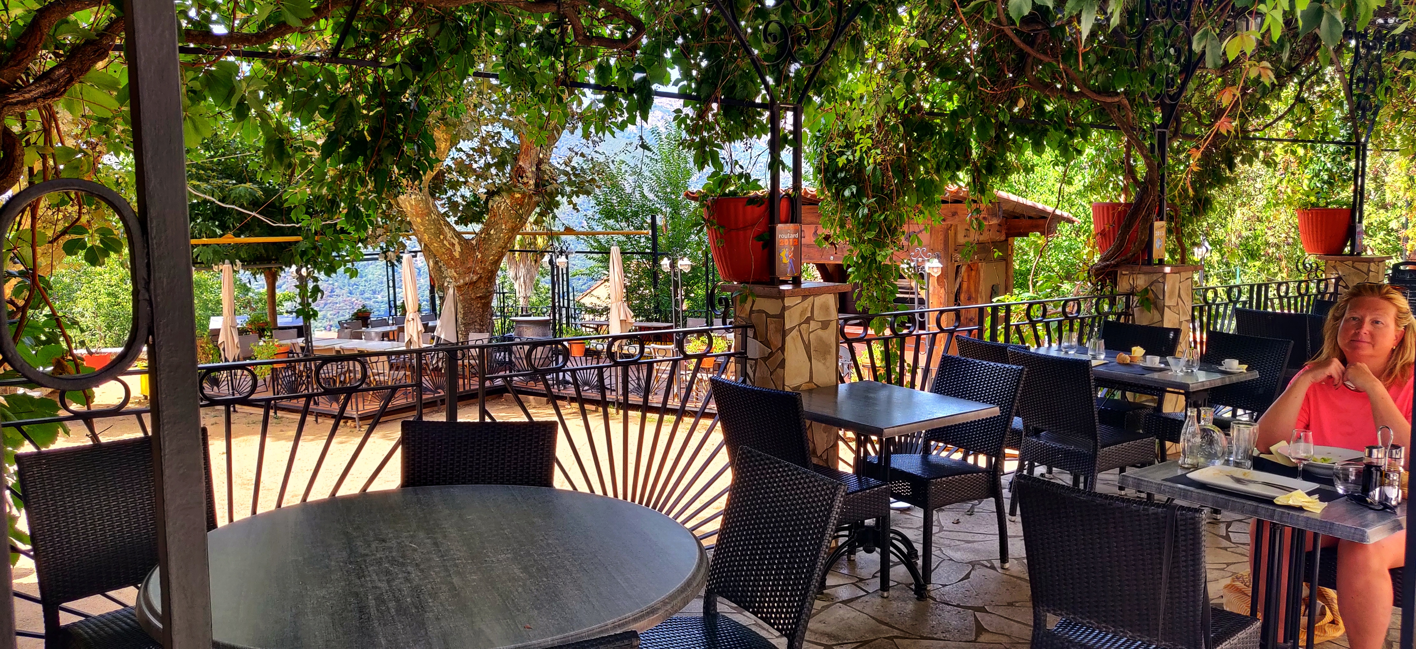 Tables sous une tonnelle végétale et cuisine faite maison... Un très agréable moment à vivre