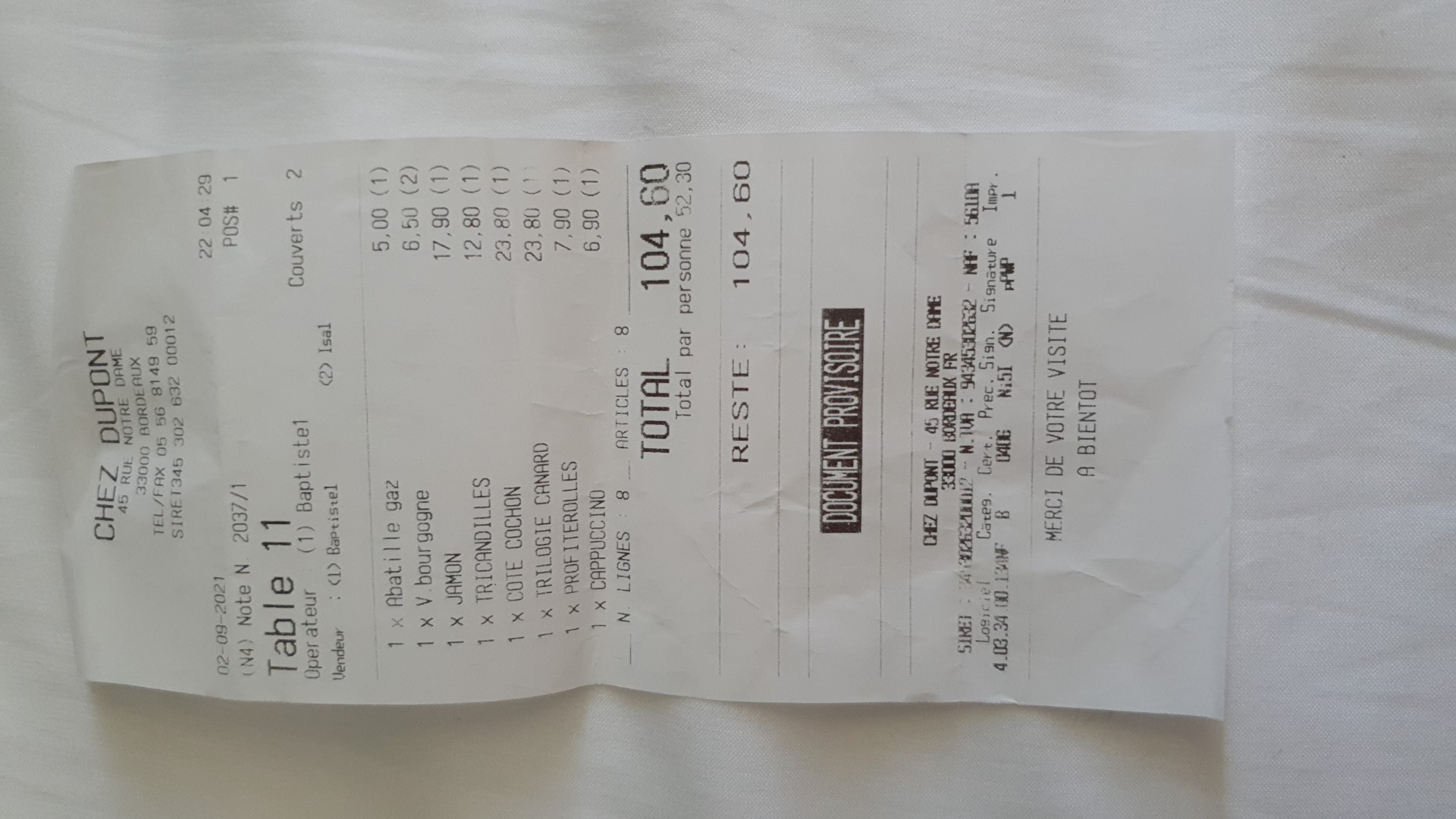 J'ai dîné Chez Dupont avec ma compagne durant notre séjour à Bordeaux. Nous avons adoré le cadre et l'ambiance. Nos plats étaient délicieux et le personnel était très accueillant. N'hésitez pas à y aller si vous passez à Bordeaux.
