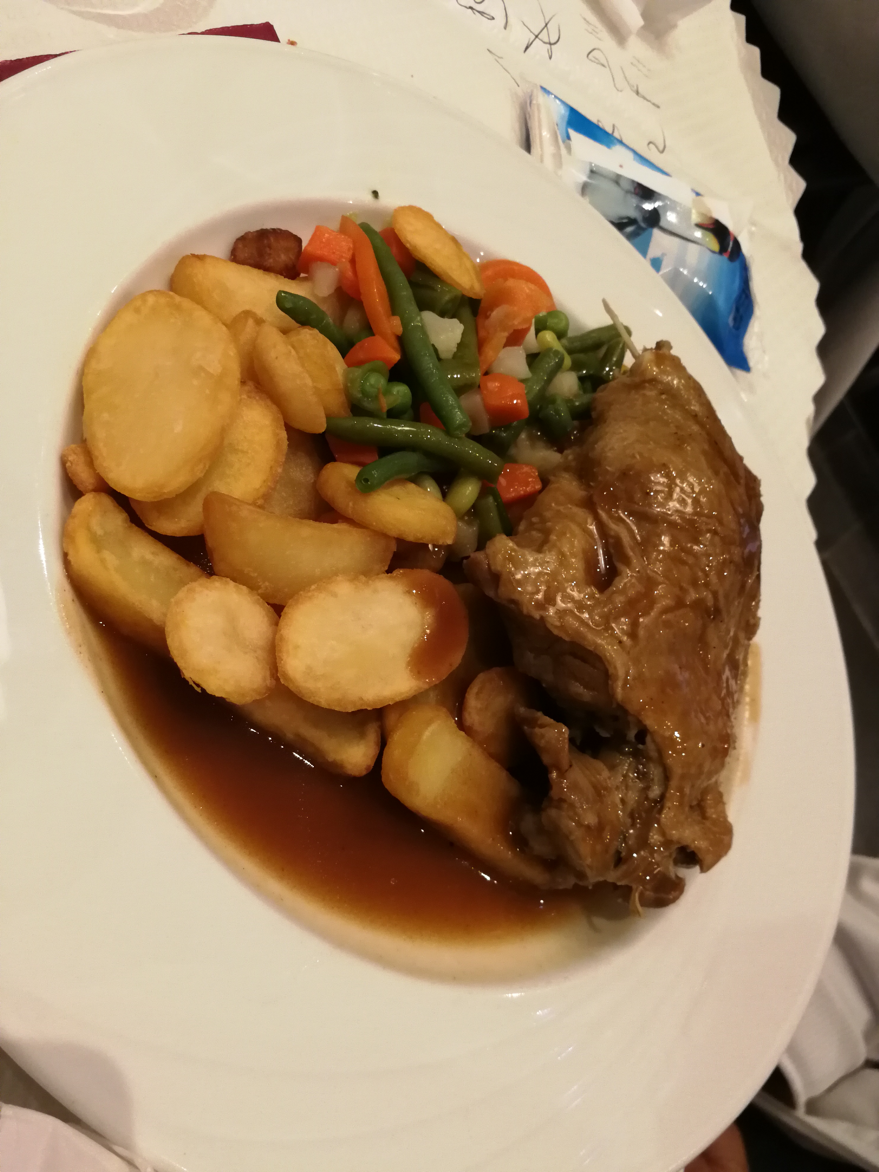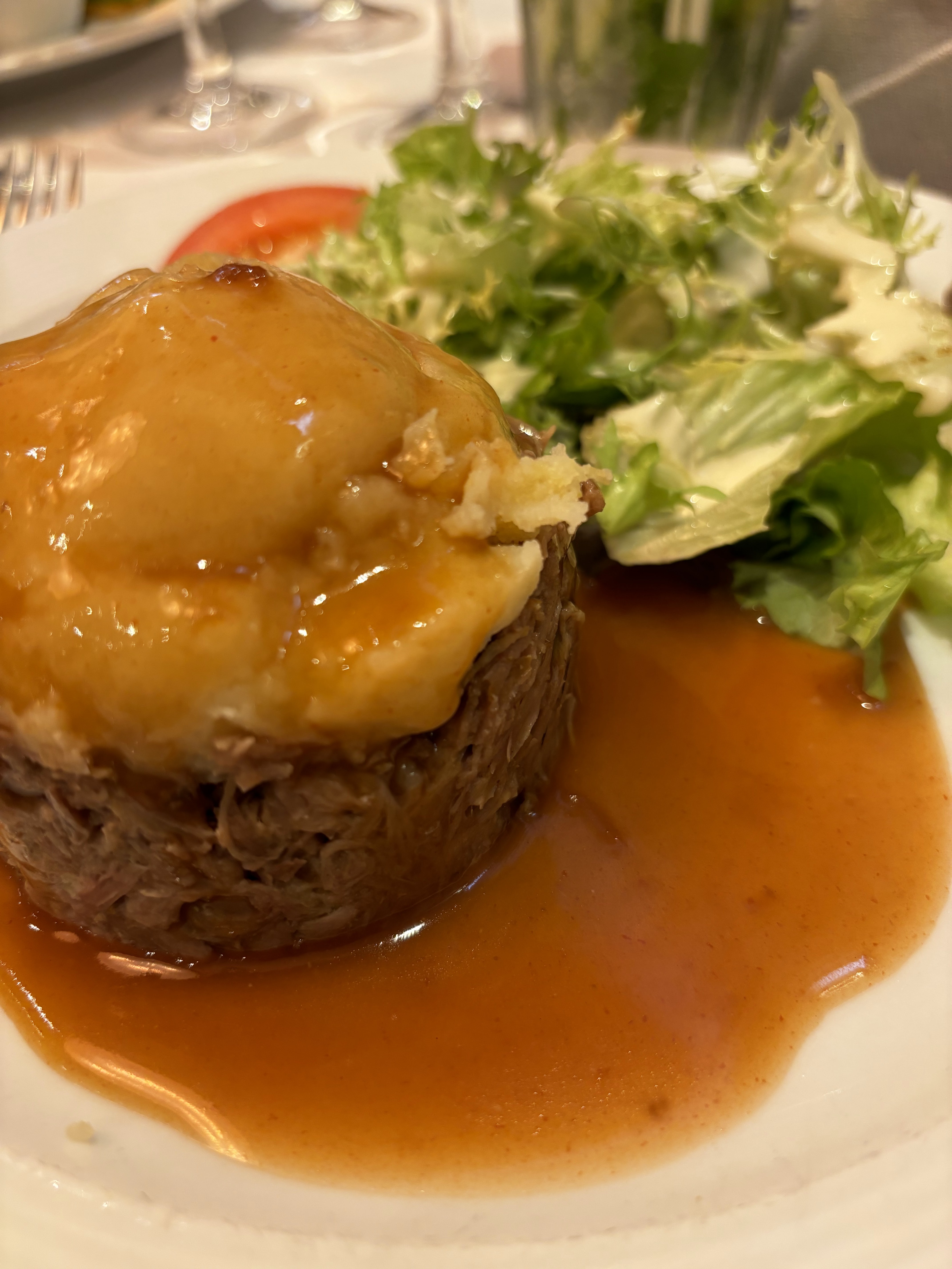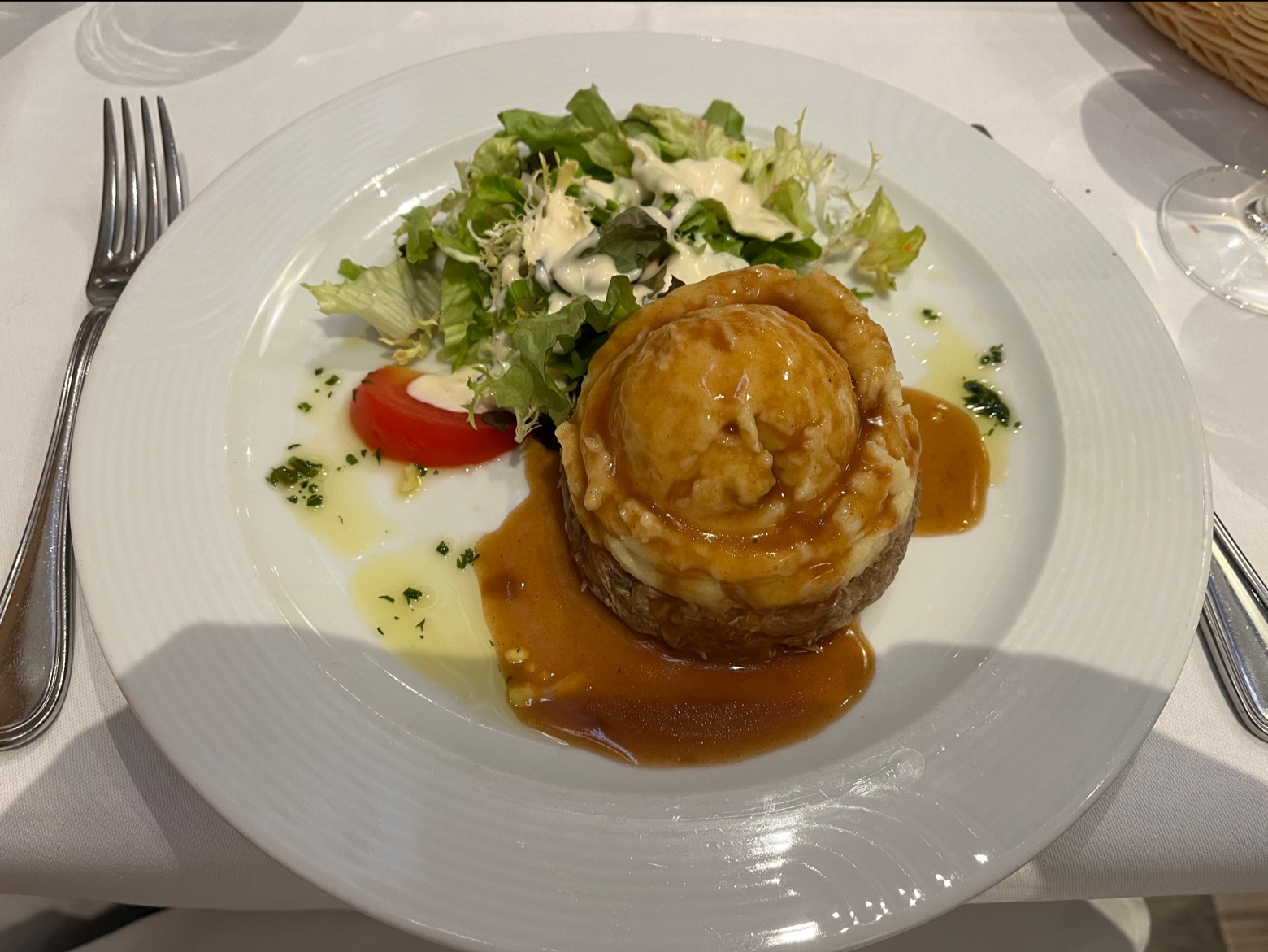Dîner parisien dans le cadre d'un voyage organisé à Singapour. En entrée, nous avons mangé des escargots. Il était parfumé au pesto d'ail et était plutôt bon avec le pain. C'est la première fois que j'essaie ! C'était comme manger du pain à l'ail, à vrai dire En plat principal, nous avons eu du confit de canard et du filet de saumon. Le canard était assez tendre mais s'est séché au bout d'un moment. Le saumon était bon, même s'il était un peu trop salé. J'apprécie qu'ils changent les pommes de terre pour chaque plat principal : tranches de pommes de terre au canard, pommes de terre bouillies au saumon et quartiers de pommes de terre au bœuf (d'après ce que j'ai vu des plats principaux des autres). Le dessert était une part de tarte aux pommes, mais c'était couci-couça. Je n'aime pas les tartes trop sucrées. Dans l'ensemble, c'était un repas correct.