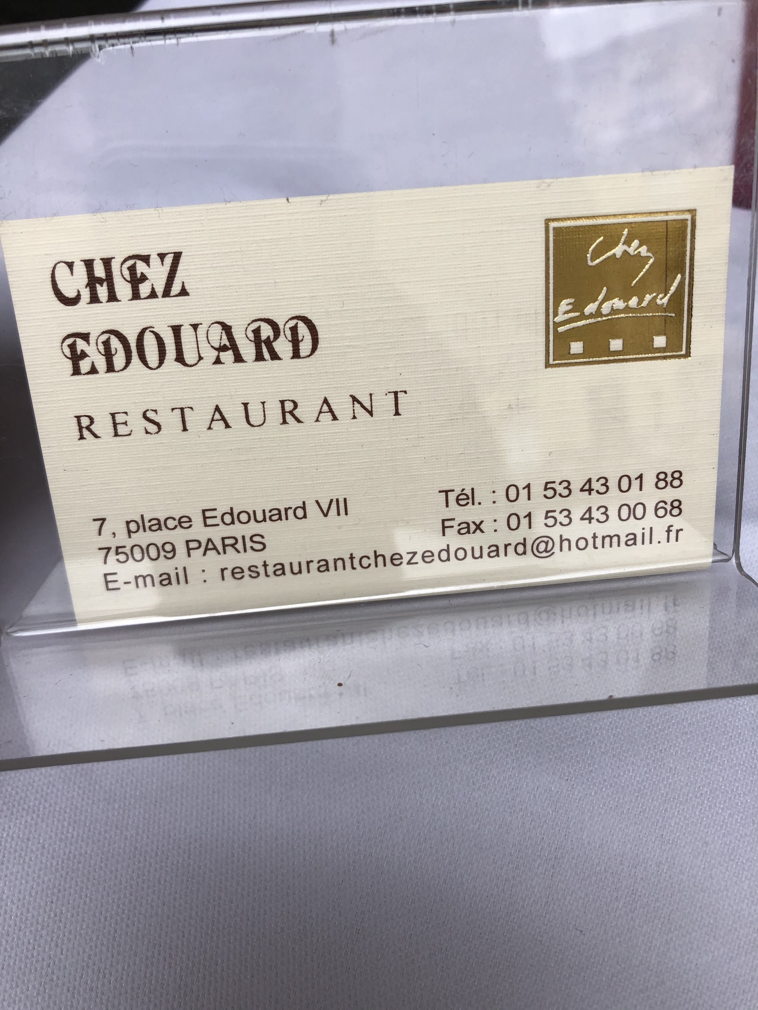 Voici toutes les informations sur le Restaurant français Chez Edouard qui ce trouve au 7 Pl. Édouard VII, 75009 Paris (75). Sur cette fiche vous trouverez les photos, l'adresse, les horaires d'ouverture, le numero de téléphone et les avis clients.Vous pouvez églement rédiger un avis si vous le souhaitez en bas de page.