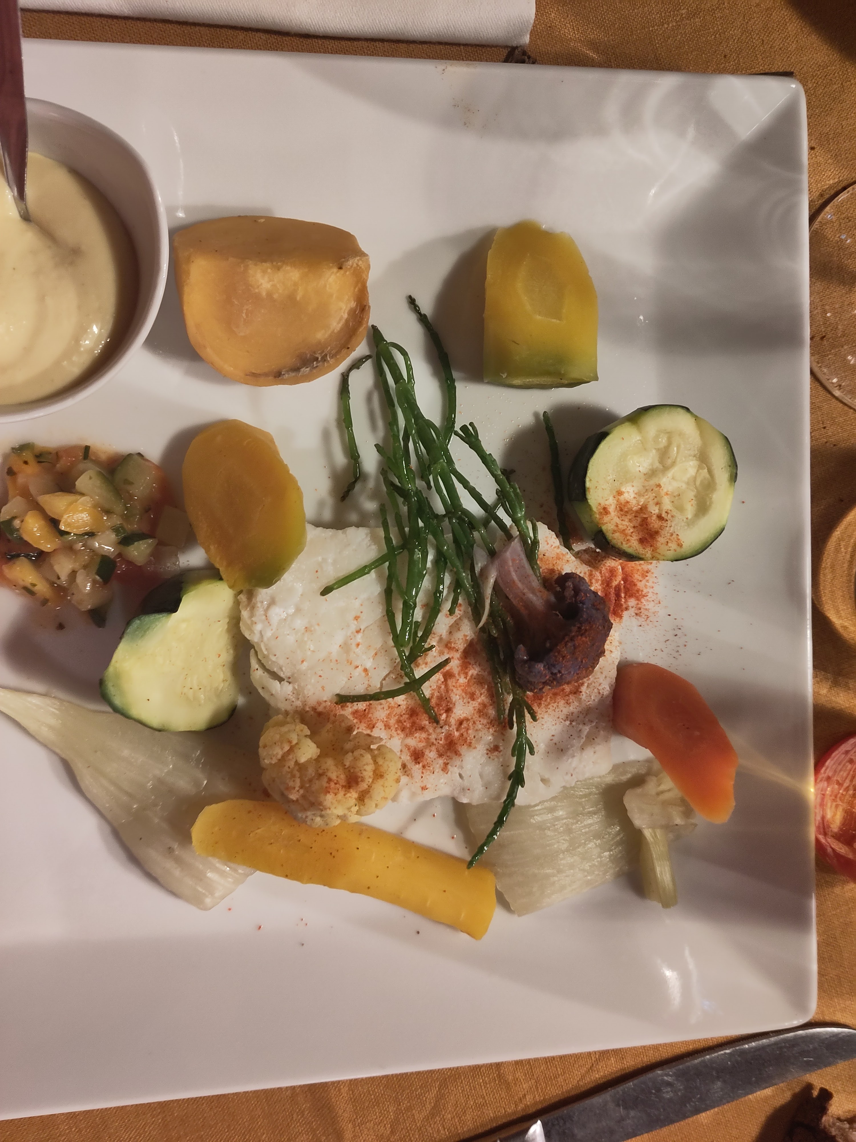 Tout simplement délicieux En entrée un carpacio au canard , j’ai testé pour la première fois, excellent. Après un dos de cabillaud et ses légumes j’ai adoré super bon Et le tiramisu super bon aussi Les vin rouge que j’ai choisi super bon et le champagne idem. Le personnel était super sympa et très chaleureux Je recommande a 2000% cette adresse. 5 étoiles bien mérité Je reviendrai