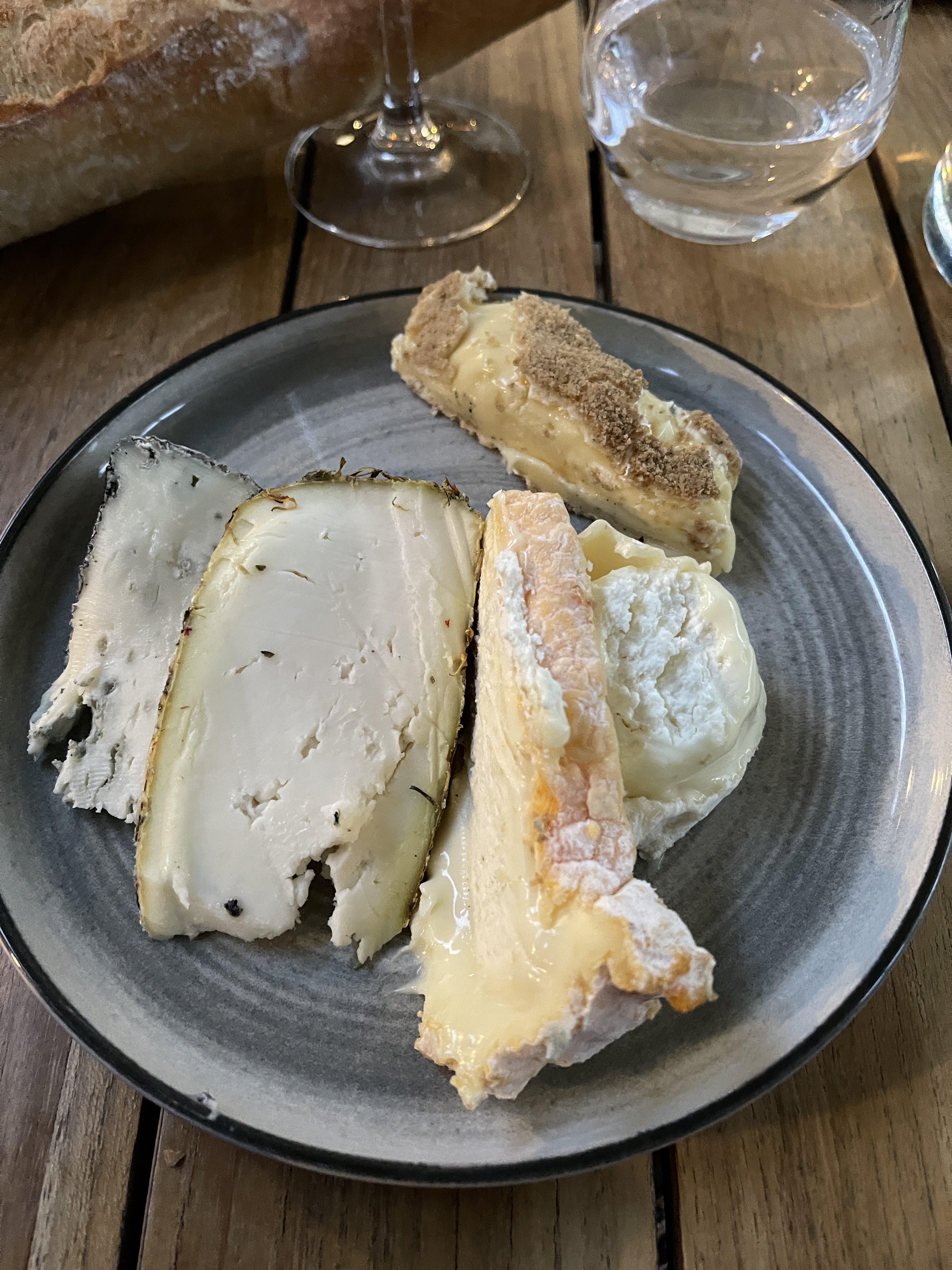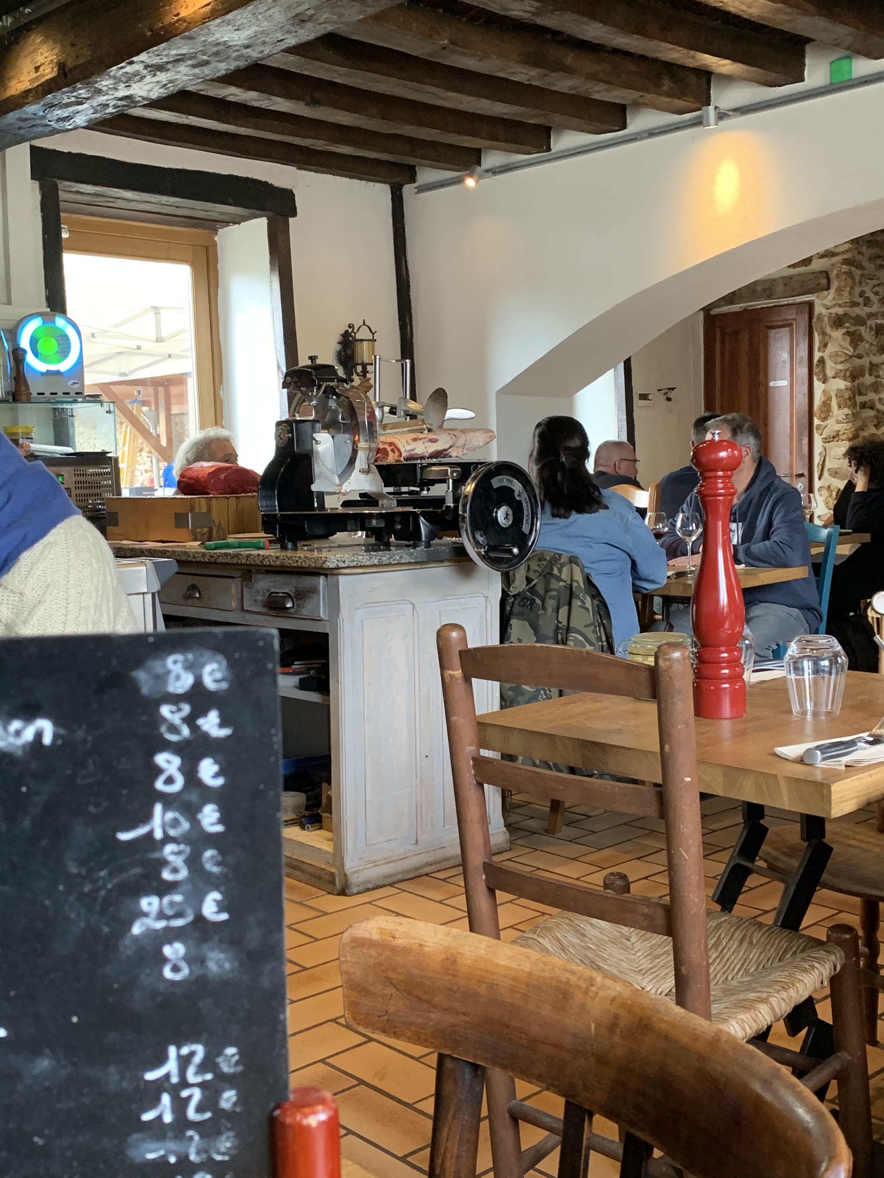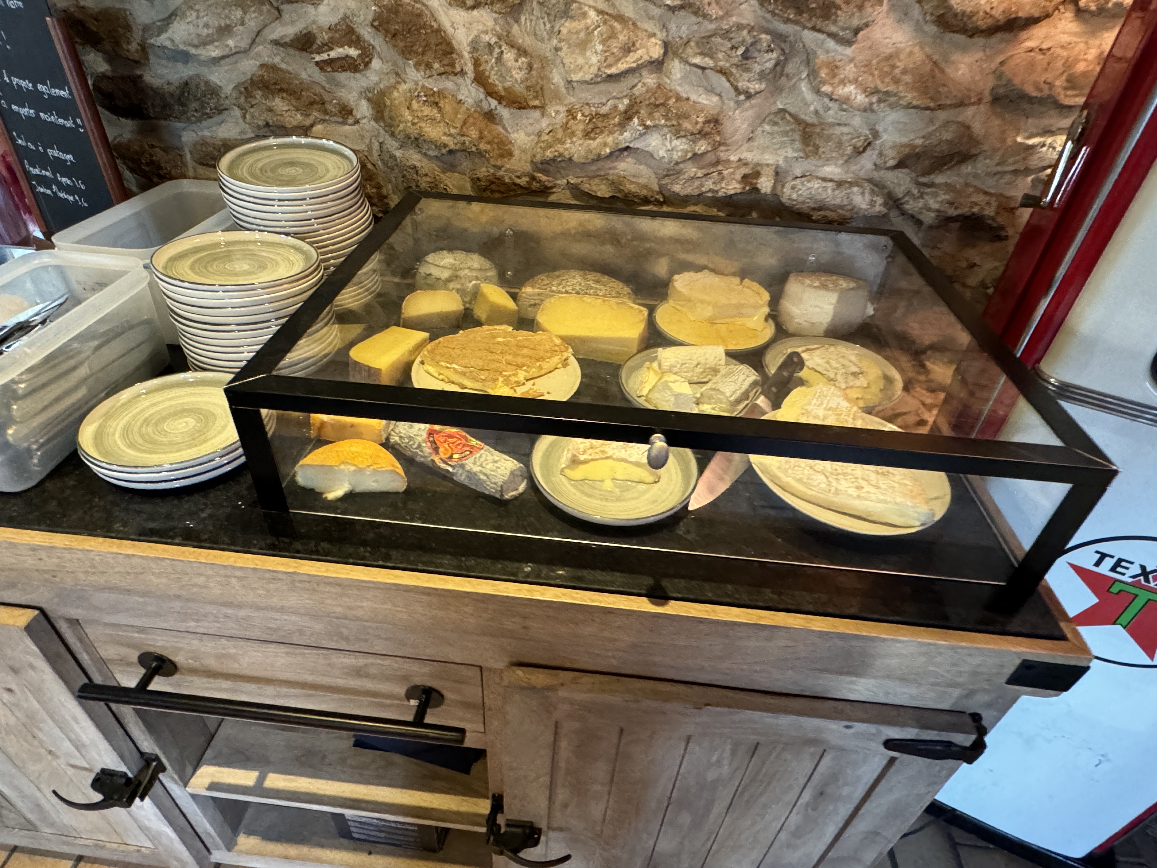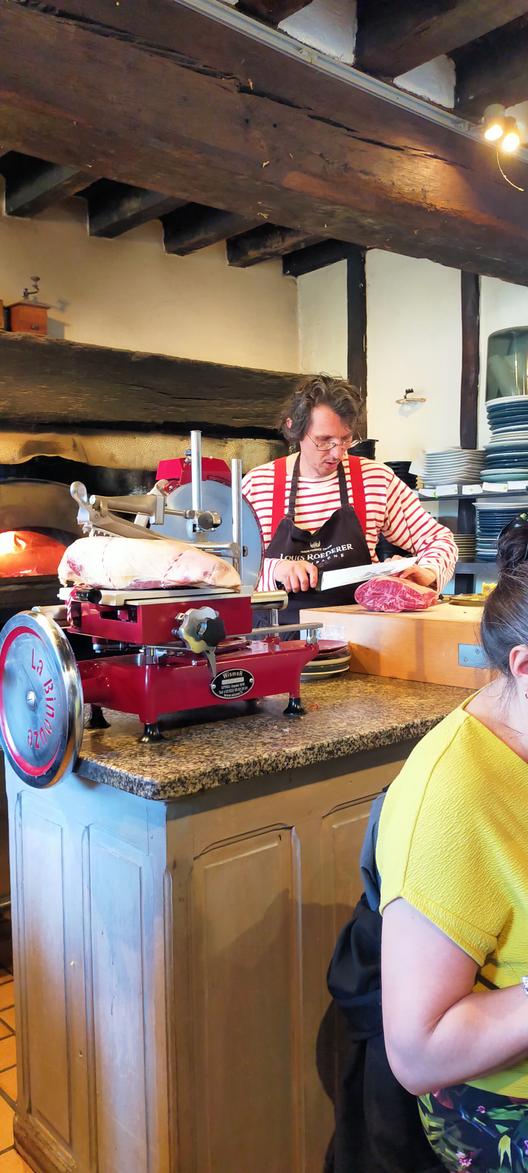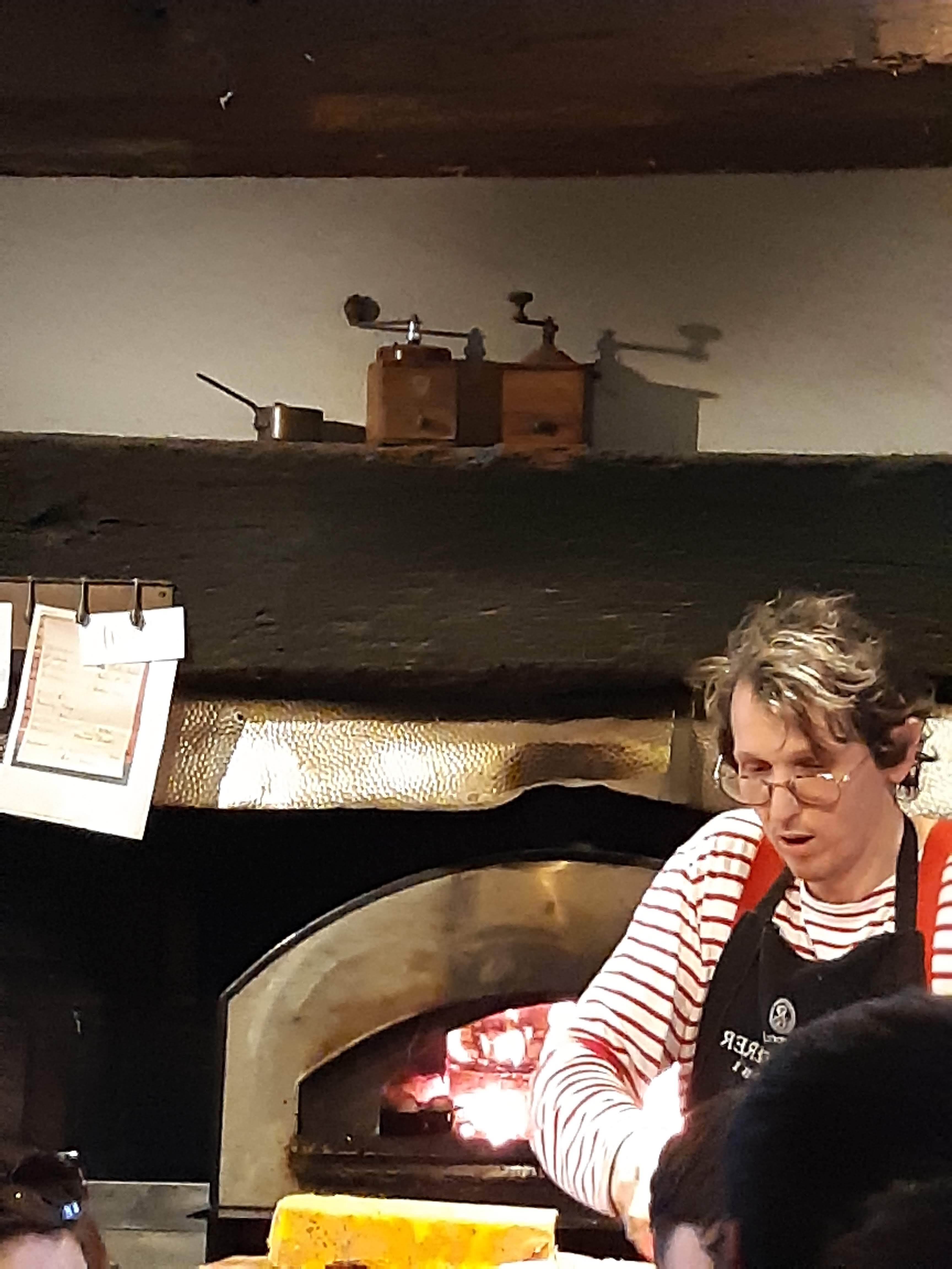 Wahou... Dans le genre atypique... Cuisinier a côté de nous, cuisson au feu de bois, proximité entre les tables a la bonne franquette et des plats savoureux sans chichi Et la cave..... Du vin de sa boutique a choisir directement en rayon et à consommer à table... Et à tarif toujours abordable. Pas pu goûter les desserts... Estomac trop plein 😊 Mes amis ont choisi l assiette de fromage... A choisir directement au plateau. Un régal pour les yeux et le ventre (oubliez peut être le fromage pour un 1er rdv en amoureux 😂) Et un parc a côté pour faire une balade digestive 👍