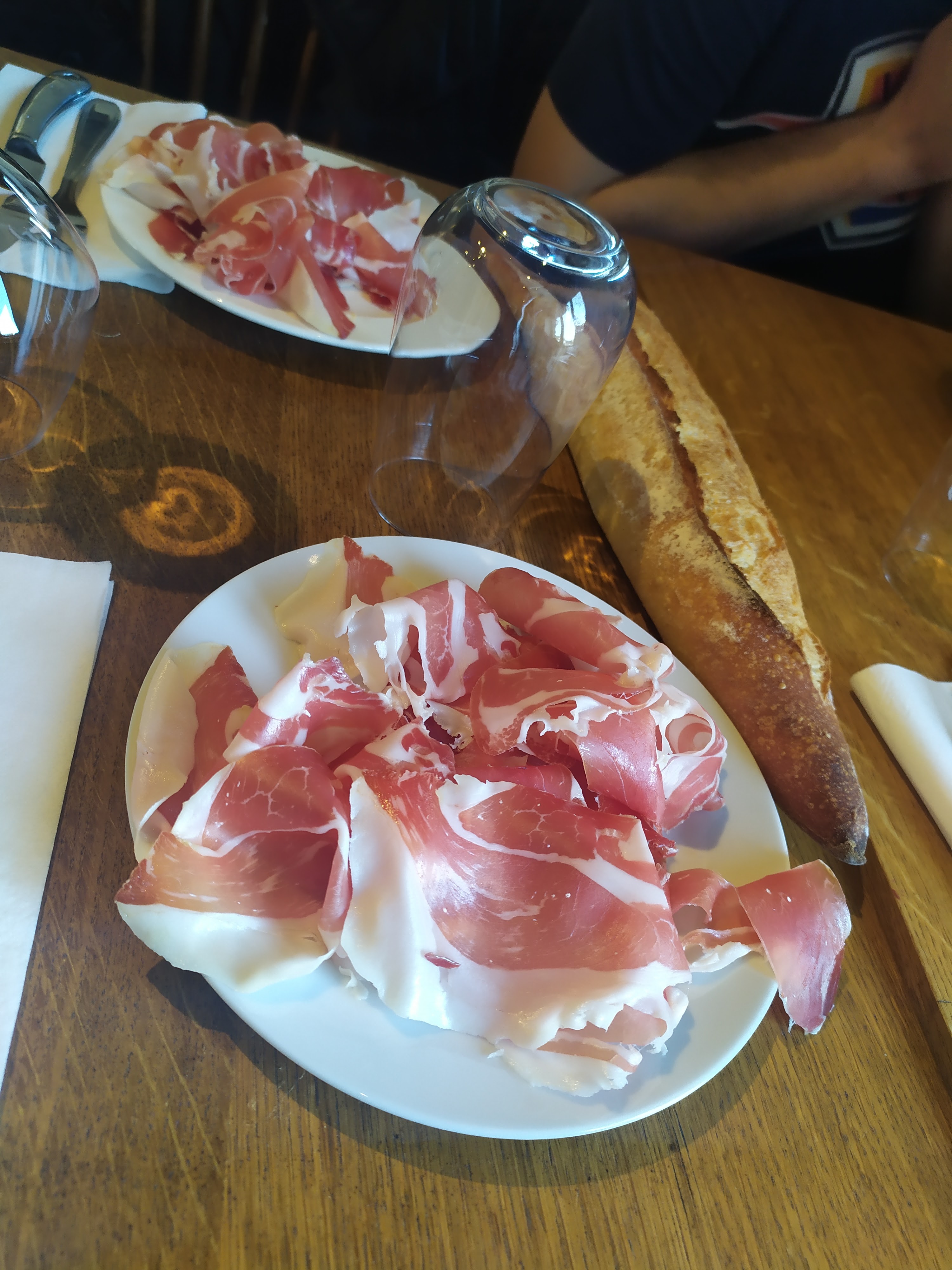 Erwann prépare les viandes tel un DJ jouant du couteau. Derrière lui, telle une sono, le four crépite. Cela lui permet d'être face à la salle et de converser avec les clients. Les produits sont de bonne qualité et cuits au four à bois. Si j'utilise le terme de produits, c'est qu'on a affaire à un expert en cuissons, mais ce n'est pas vraiment cuisiné. Viandes non préparées, pas de sauce pour accompagner les viandes. Accompagnement de pommes de terre, pas d'alternative possible. Voilà je ne mets pas 5 pour le coup. C'est à la bonne franquette avec de bons produits et l'ambiance très bonne. La salle proche de la cave est différente. Erwan et son sound system n'y sont pas. Des discussions debout. Des tables qui se mélangent. Des verres qui semblent s'entrechoquer davantage. A noter, Erwann propose de la pluma ; sale son saumon, et fait son foie gras. Jambon ibérique bien sélectionné.