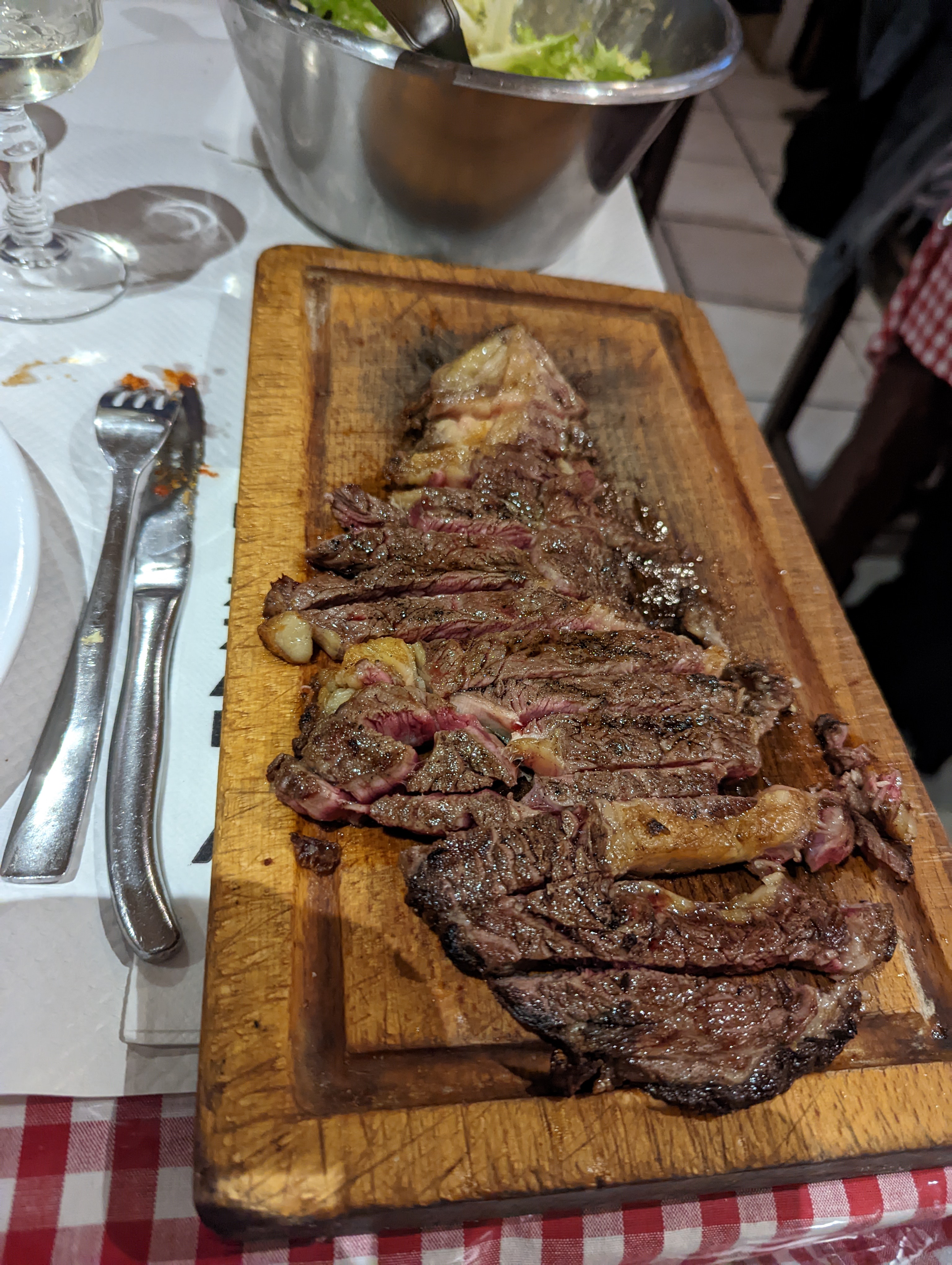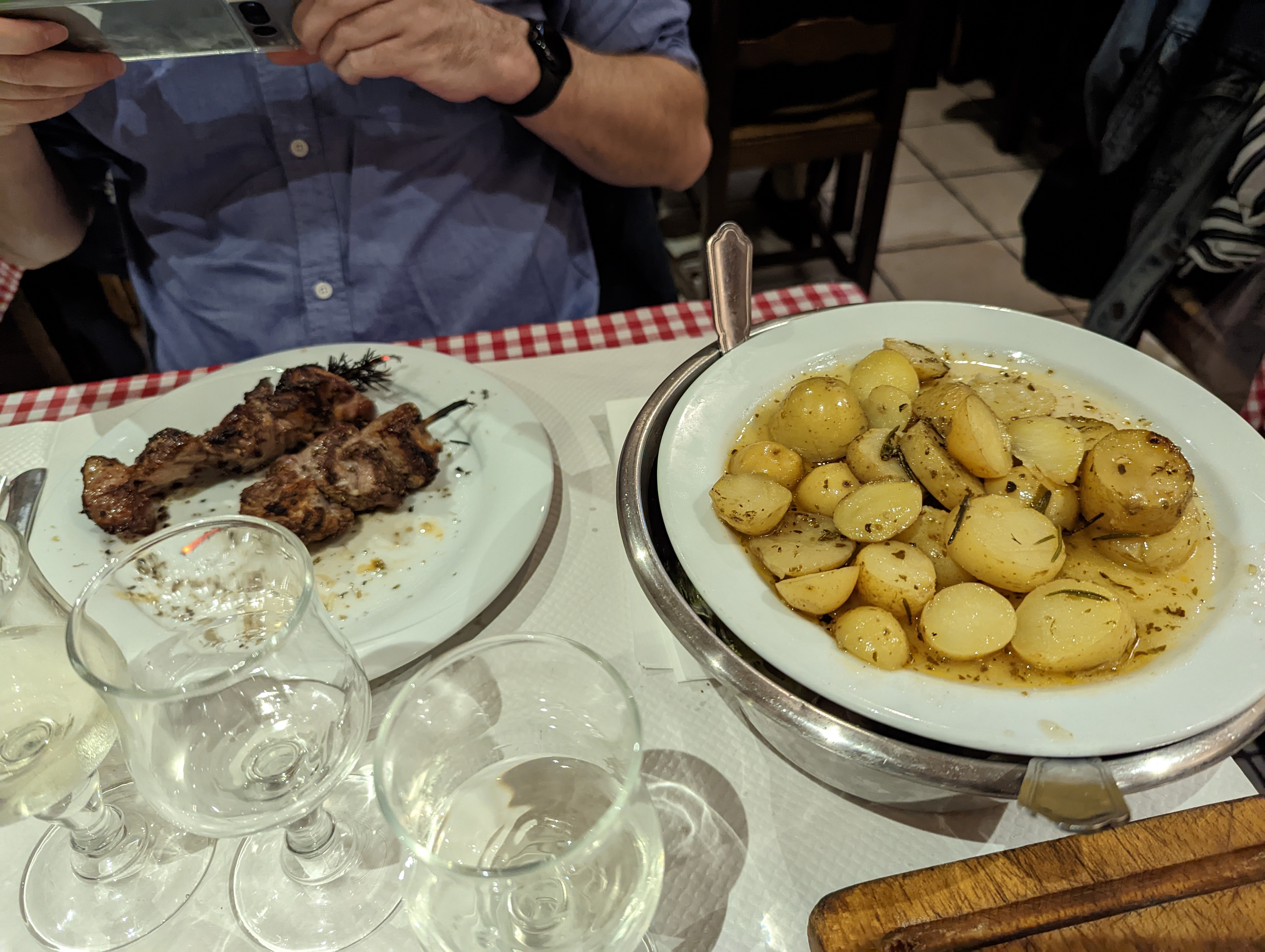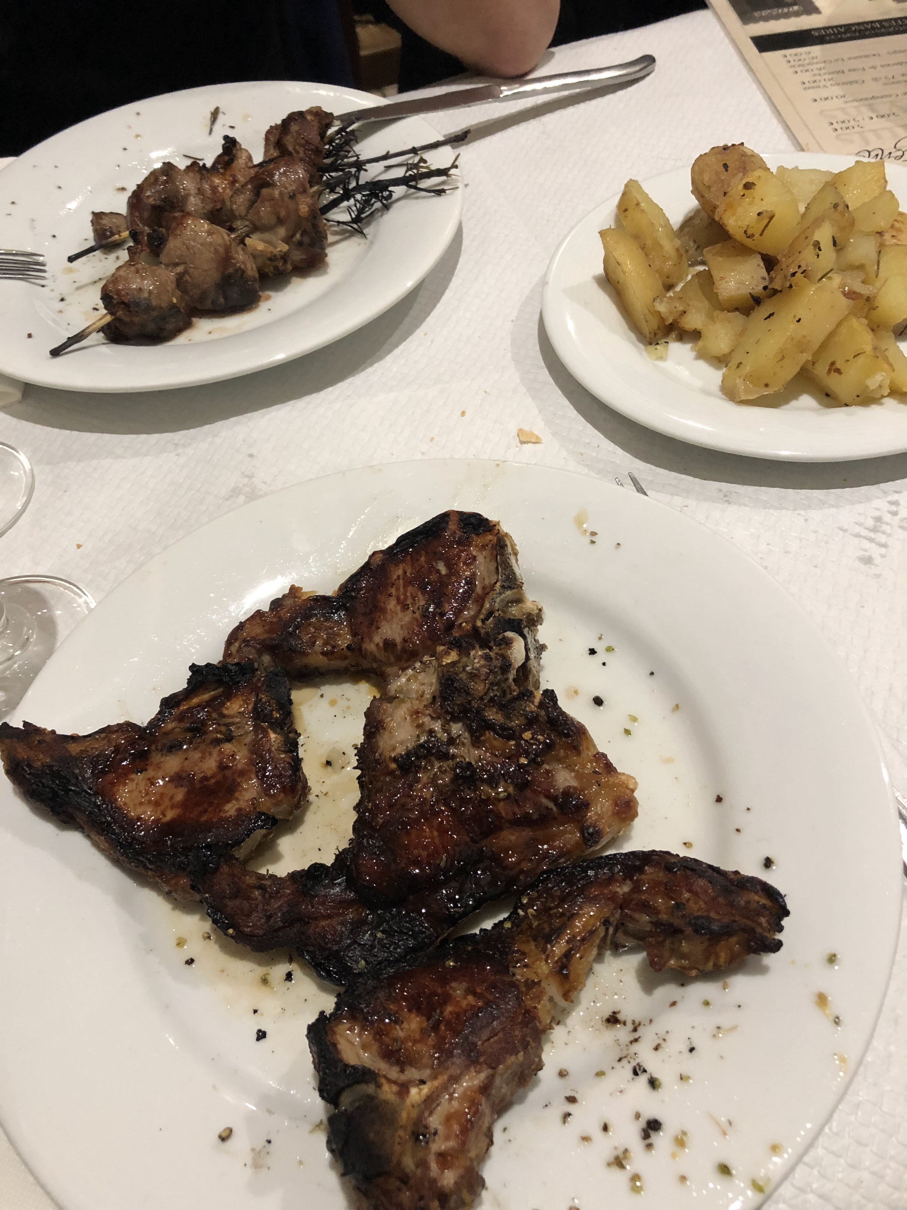 Nous sommes arrivés tard le soir et nous avons été tout de même acceptés La carte laisse peu de choix mais c’est une bonne sélection Un saladier de frisé est apporté d’office Nous avons opté pour les côtelettes et brochettes d’agneaux qui malgré qu’elles soient un tout petit peu trop grillé étaient délicieuses C’etait servi avec une petite assiette de pommes de tard cuites au beurre / huile d’olive legerement assaisonné aux herbes de provence (peut etre un peu leger sur la quantité vu que nous etions deux) Le flan et la tarte aux pommes etaient un peu cher pour ce que c’etait Sinon tout était très bon et nous avons bien été accueilli