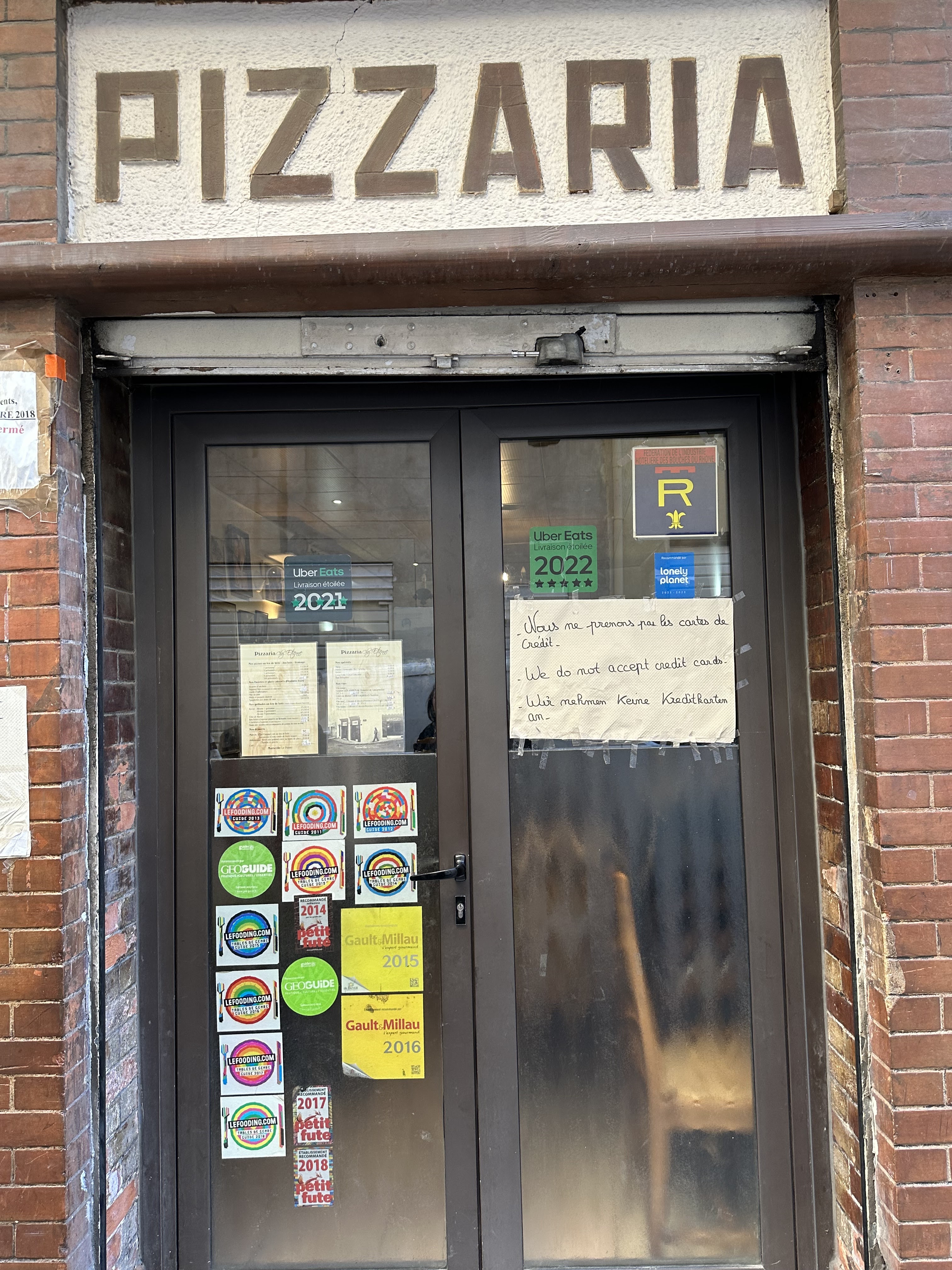Les DEUX types de pizza (anchois ou fromage… ou moité-moitié, les 2 seules au menus) sont absolument excellentes. Attention beaucoup de monde et ambiance de ce fait un peu bruyante (mais les pizza peuvent être commandées à emporter)