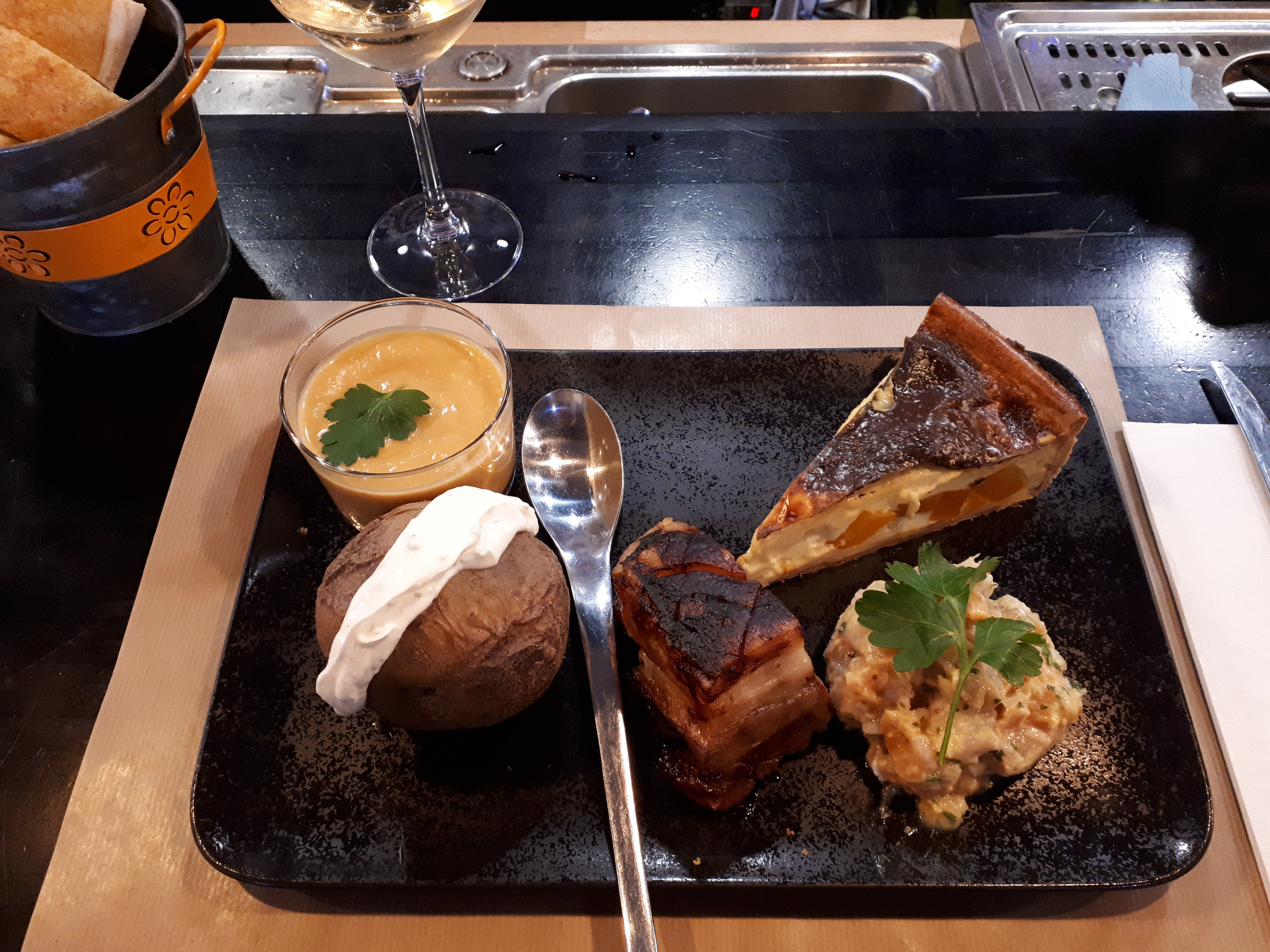 Je viens de manger une succulente assiette avec soupe salade tarte fine et légume. L’ambiance détendu que j’aime vraiment parfait pour venir boire un verre ou manger entre amis en couple ou même tout seul comme moi même Je recommande fortement !!