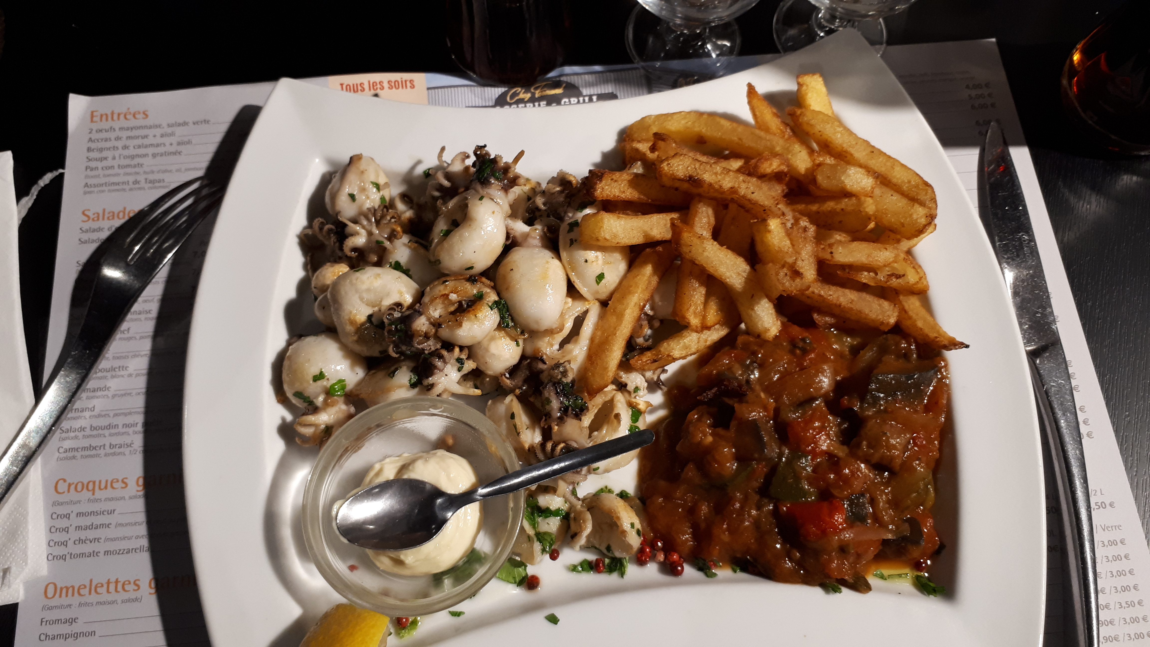 Grillades frites maison Tiramisu Excellent ! Seul bémol...les odeurs de gril qui imprègnent les narines et les vêtements
