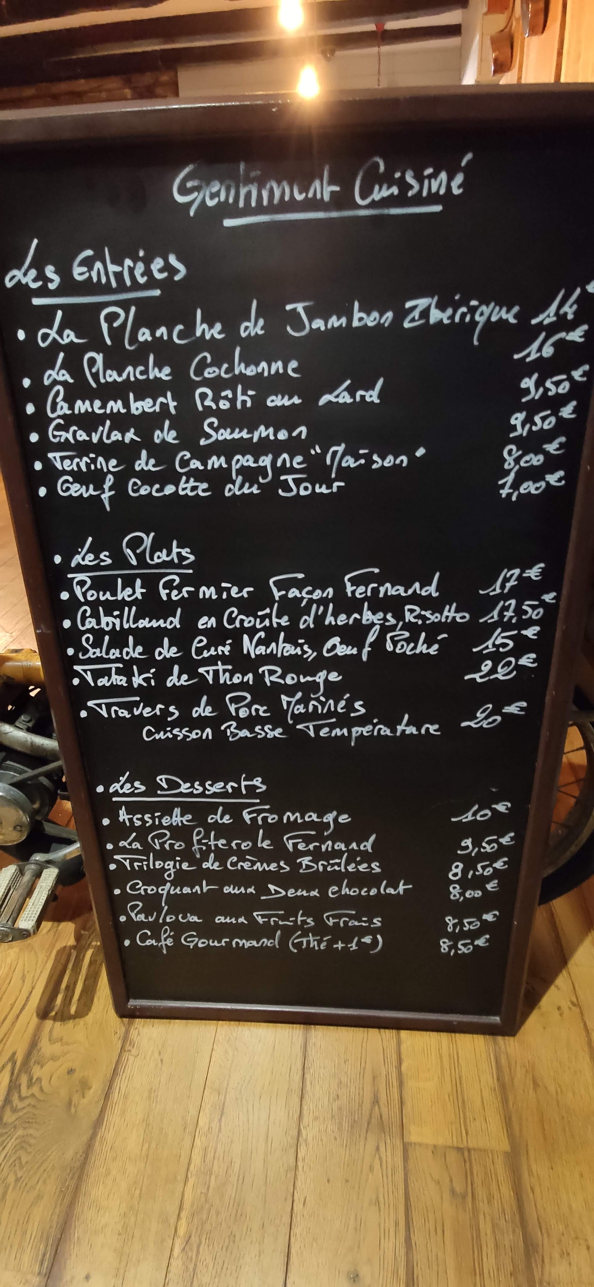 J'ai passé un agréable moment, cette sensation d'être comme chez soit, cheminée au centre de la salle, des tables bien disposées, une salle à taille humaine, des serveurs compétents à l'écoute des clients. J'ai opté pour le menu fernand à 25e, super rapport qualité prix, je reviendrais pour tester à la carte. Juste une remarque sur le parking, ça serait sympa de reboucher les trous car avec un coupé on peut y laisser un spoiler. Sinon Bravo à cet établissement et tout le staff good job 😉