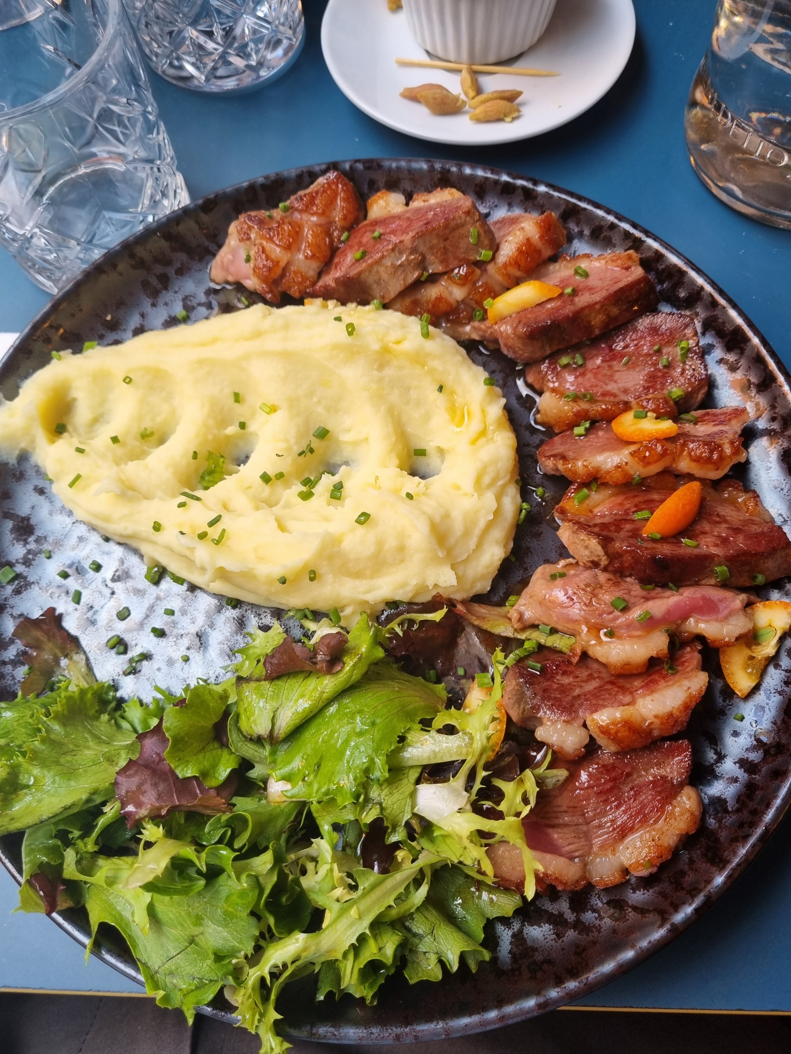 Mixed bag, would avoid. Nice space, but booking was hard because their website reservations were broken. No english menu but one of us spoke French so it was fine. Great hummus appetizer with soft warm pita. However the cote-de-boeuf was pretty gross. I'm a big steak lover and have had this dish in many places as well as cooked it myself. The quality of the beef used here was poor and it had a very strange taste, it was also not seared evenly leaving many 'grey spots. The accompanying sauces and sides were good. So like I said, it was a mixed bag but for the price I would definitely not recommend coming here. Oh and the server forgot to give us anything to drink until after we had finished our appetizers (we ordered drinks initially and asked for water too and he just forgot everything). Un mélange, j'éviterais. Bel espace, mais la réservation était difficile car les réservations sur leur site web ne fonctionnaient pas. Pas de menu en anglais mais l'un d'entre nous parlait français, donc c'était bon. Excellent apéritif de houmous avec du pain pita chaud et doux. Cependant, la côte de boeuf était assez dégoûtante. Je suis un grand amateur de steak et j'ai mangé ce plat dans de nombreux endroits ainsi que cuisiné moi-même. La qualité du bœuf utilisé ici était médiocre et avait un goût très étrange, il n'était également pas saisi uniformément, laissant de nombreux 'points gris'. Les sauces et accompagnements étaient bons. Donc, comme je l'ai dit, c'était un mélange mais pour le prix, je ne recommanderais certainement pas de venir ici.