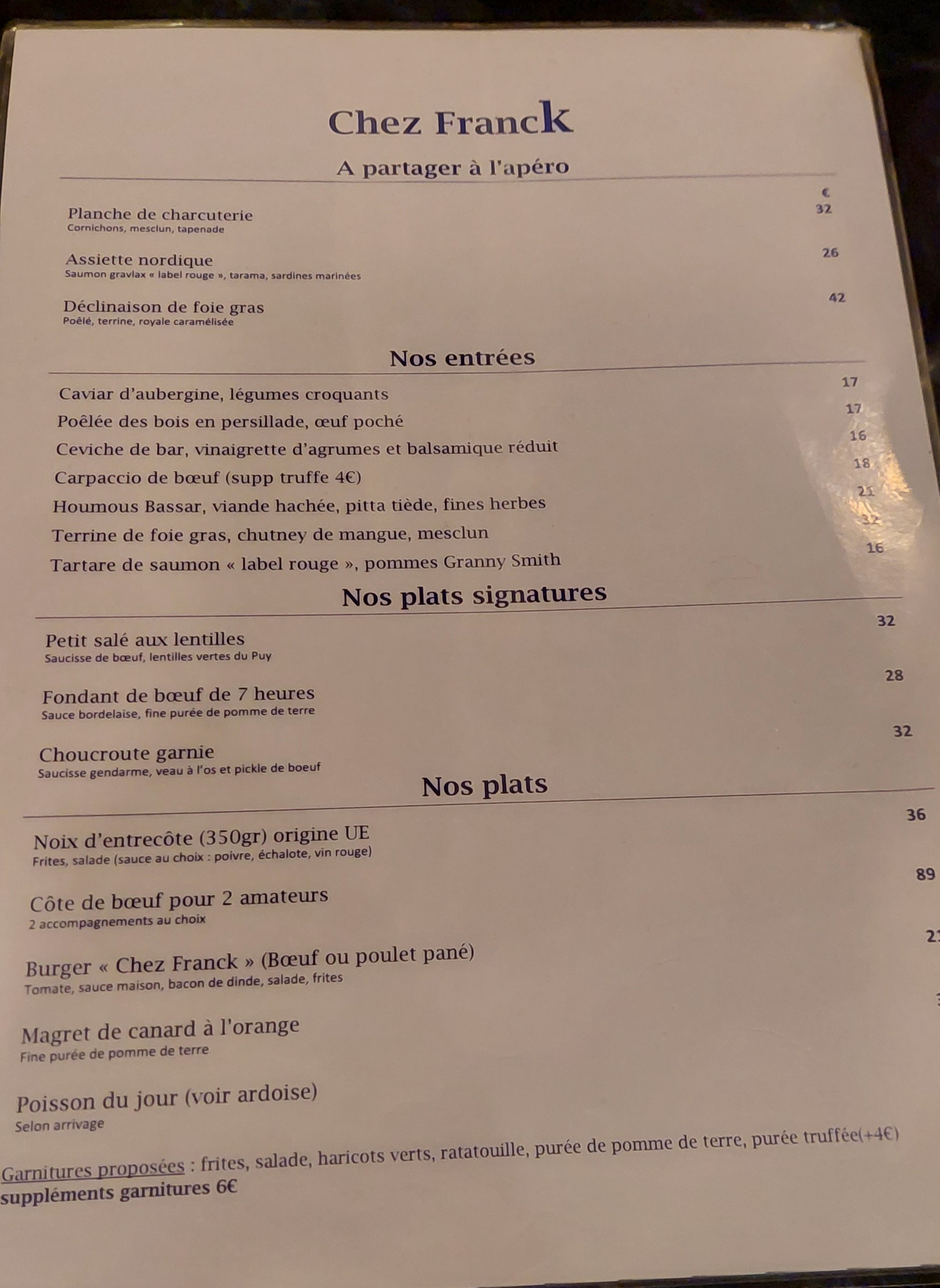 Nous avons eu la bonne idée de ne pas commander un samedi soir. Nous souhaitions changer nos habitudes, et partir à la rencontre d’un restaurant. Nous n’avons pas été déçus. En plus de son côté brasserie française branchée, le restaurant « chez Franck » possède le luxe d’avoir des produits de qualité et des plats originaux comme sa choucroute garnie ou son fondant de bœuf. Côté cuisine, ce fut un sans faute. Mais parmi mon choix de note, je prends en compte aussi le service et la relation entre le client et le personnel. Et franchement il n’y a rien à dire de négatif. Que ce soit le chef Franck, ou le serveur Liam, le professionnalisme et la gentillesse furent au rendez-vous. C’était top. Bonne continuation, merci beaucoup et à très bientôt !