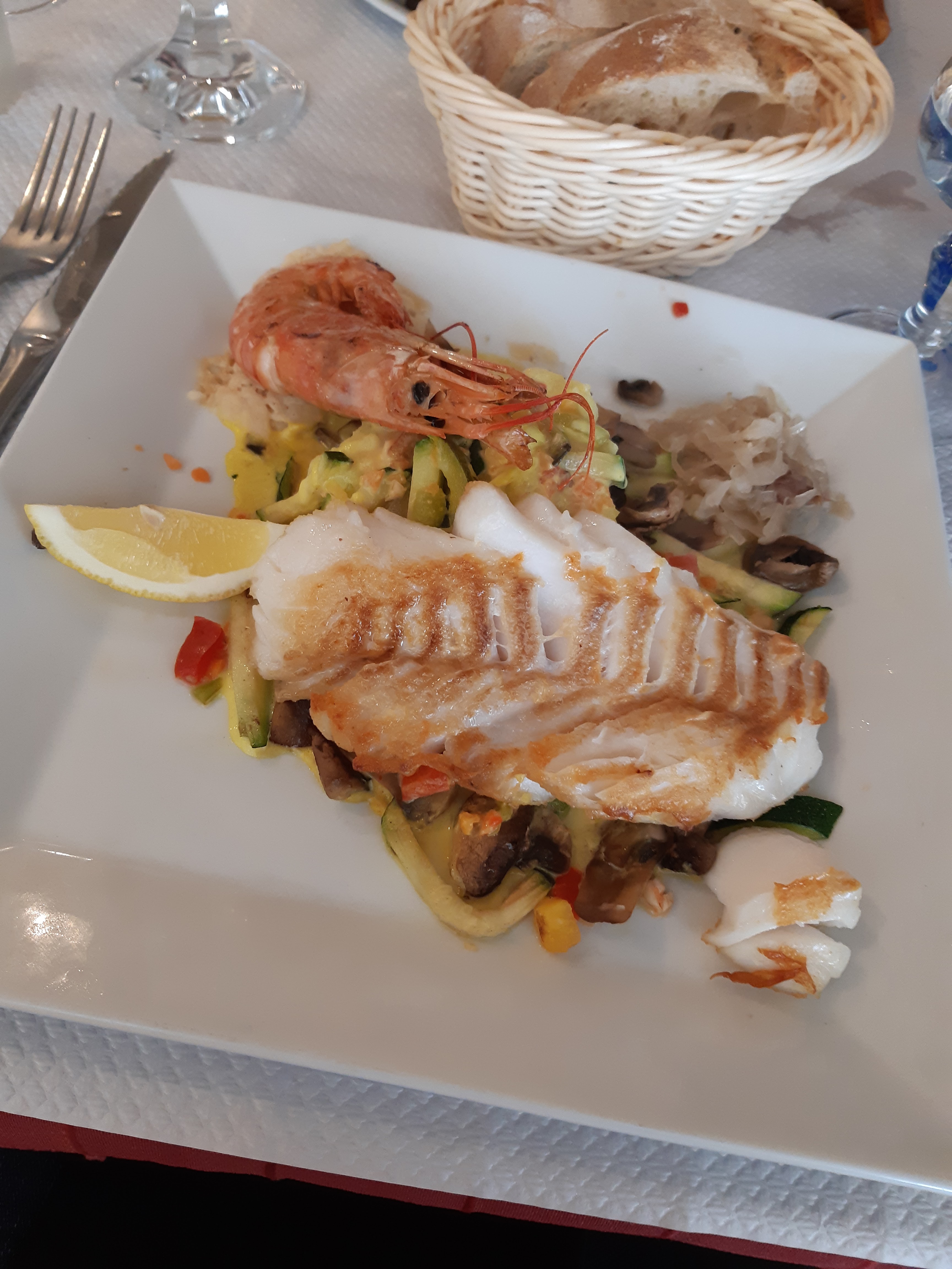 Plats très bons ! Daurade et flan sur les photos