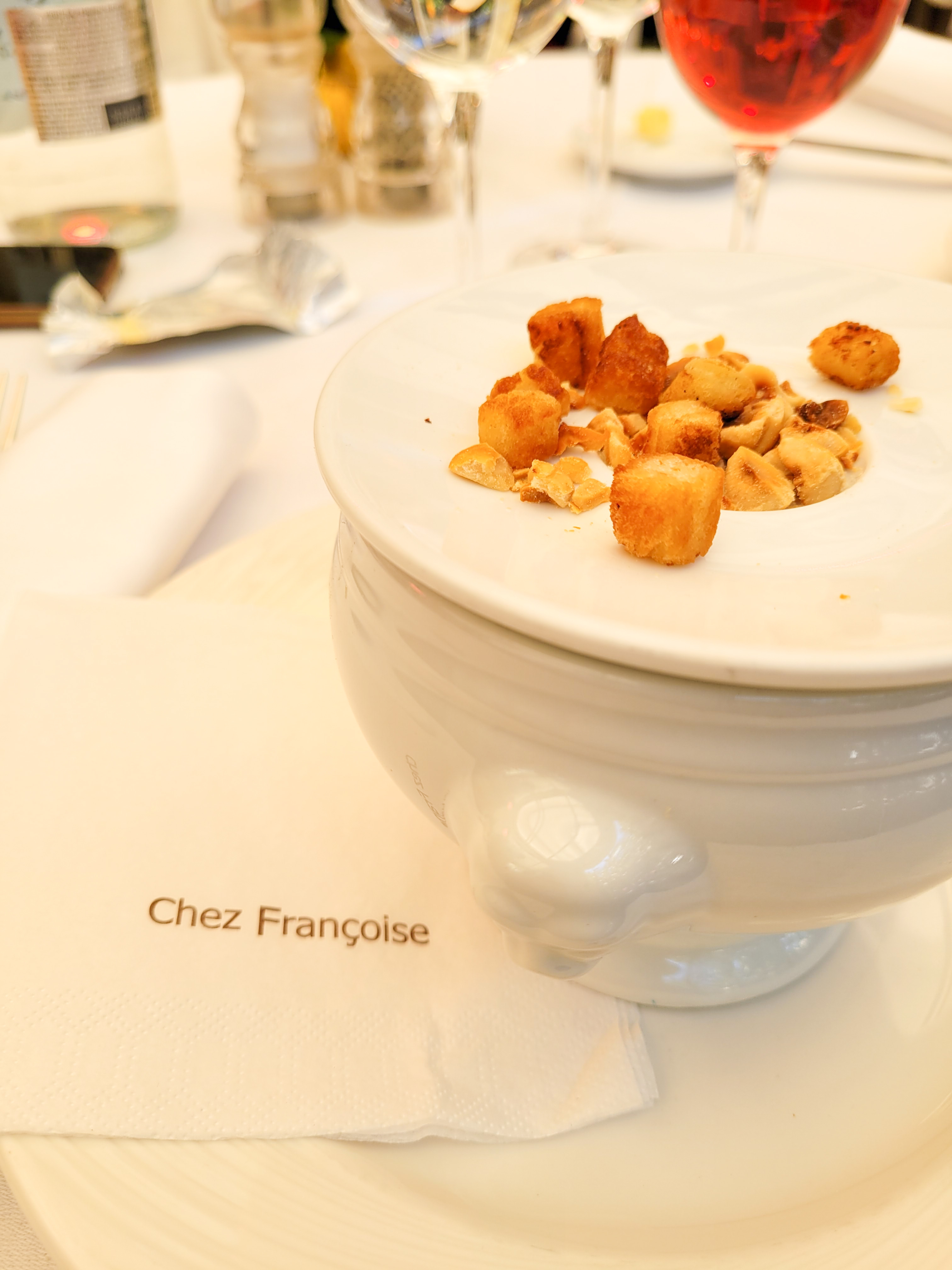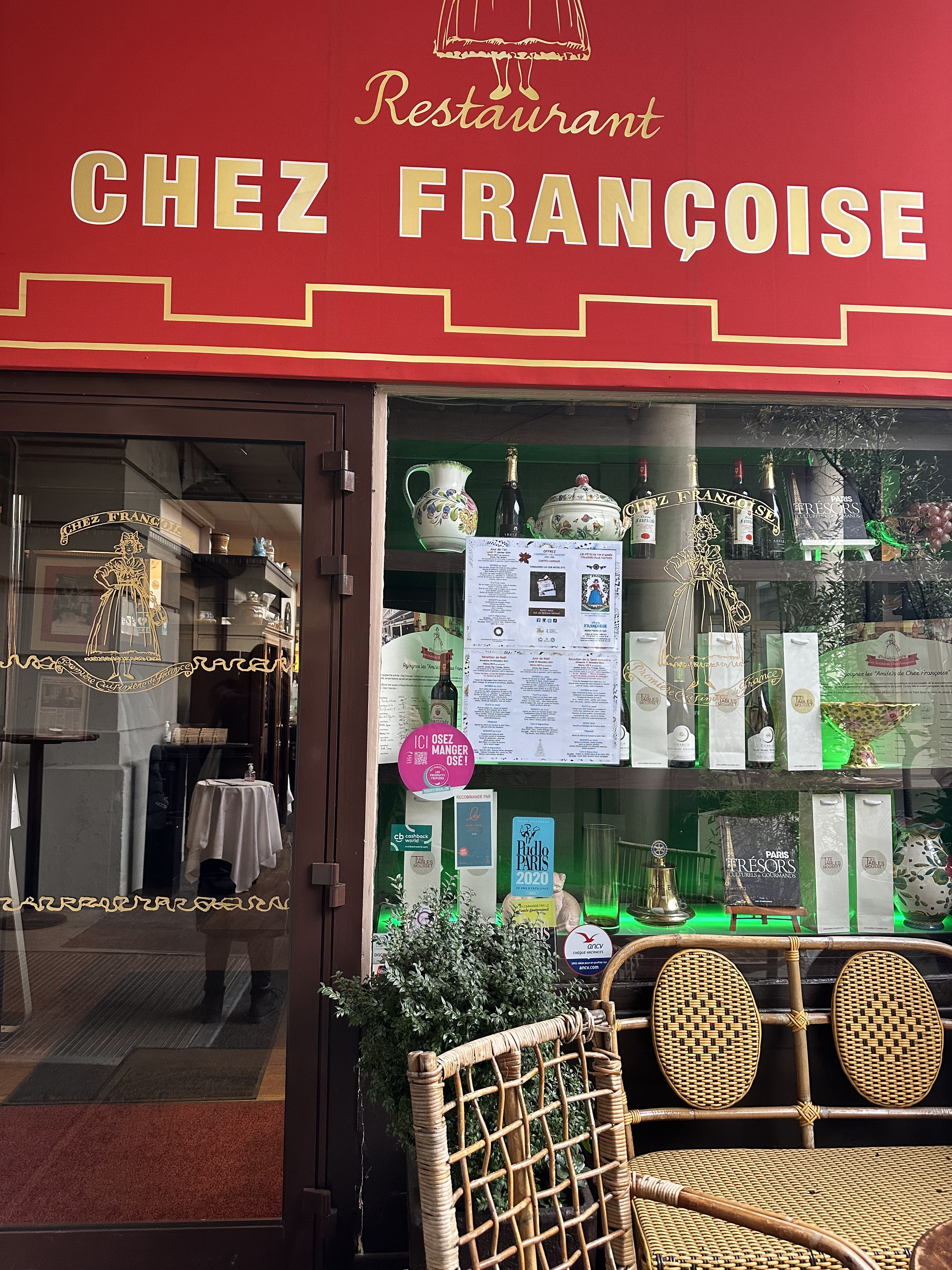 Très jolies salles. Le service est impeccable. Les plats sont délicieux. Aucune surprise à l'addition : on paye exactement les prix indiqués sur les cartes et menus. CERISE SUR LE GÂTEAU : Le jour de la Sainte Françoise, 9 mars, il y a des surprises pour les clientes qui portent ce prénom. Eh oui, le restaurant s'appelle Chez Françoise ! Que vous vous prénommée Françoise ou pas, je vous recommande ce restaurant charmant.