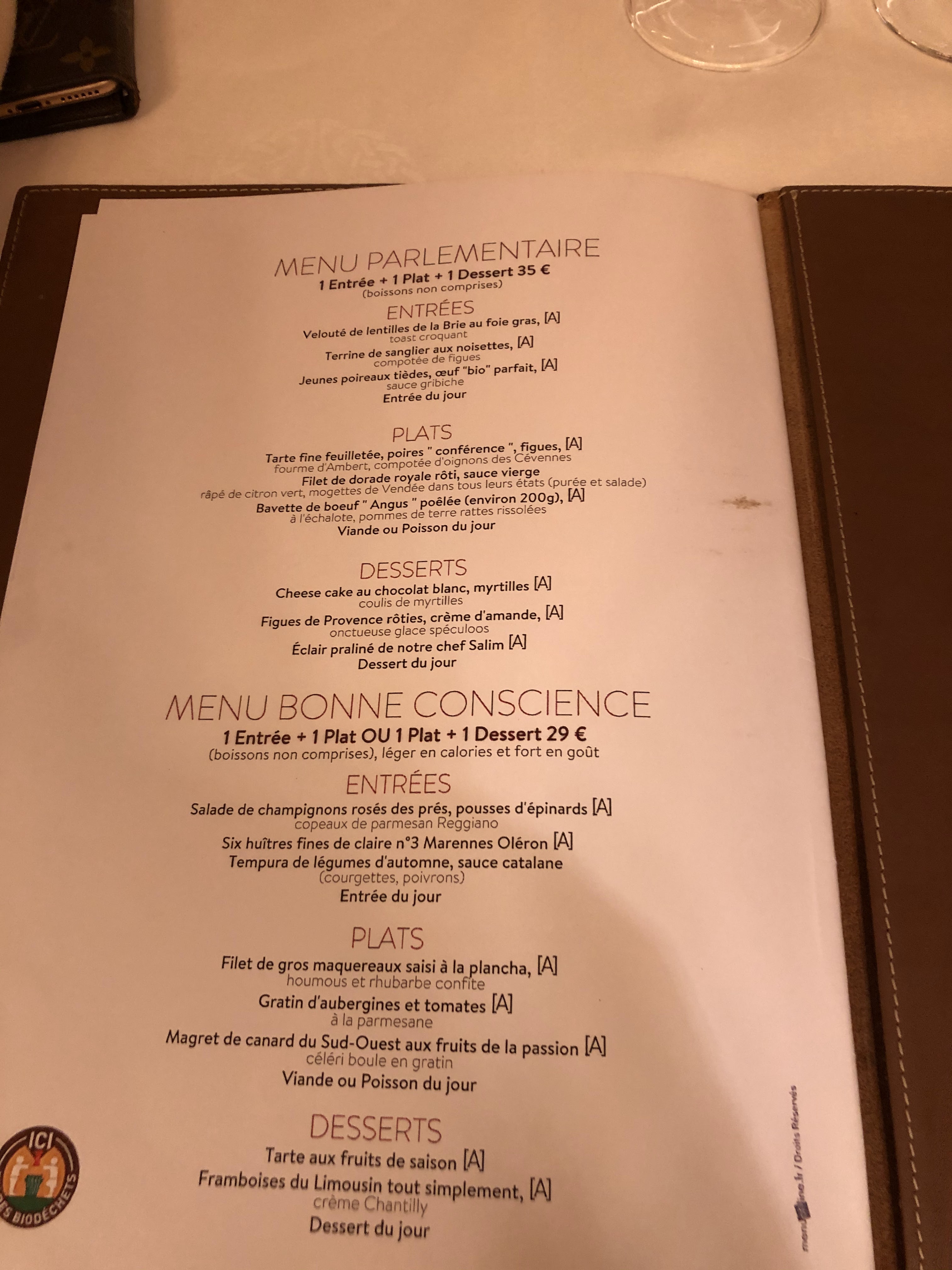 Très belle carte et de nombreux thèmes tout au long de l année. Un menu parlementaire à 35 euros et 29 si vous prenez plat dessert ou entrée plat. Sans les boissons. Très fin et les plats sont harmonieux.
