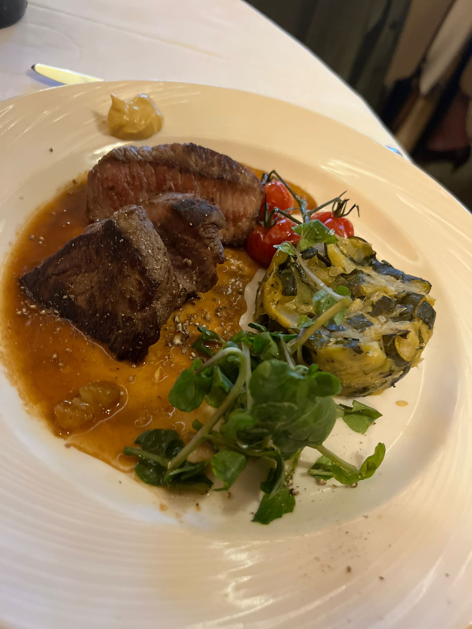 Mon mari et moi avons découvert ce restaurant d'un style gastronomique grâce à Groupon. Le service à table a été très bien tout comme le repas. Le menu proposé était complet, ci-joint la photo du plat principal.