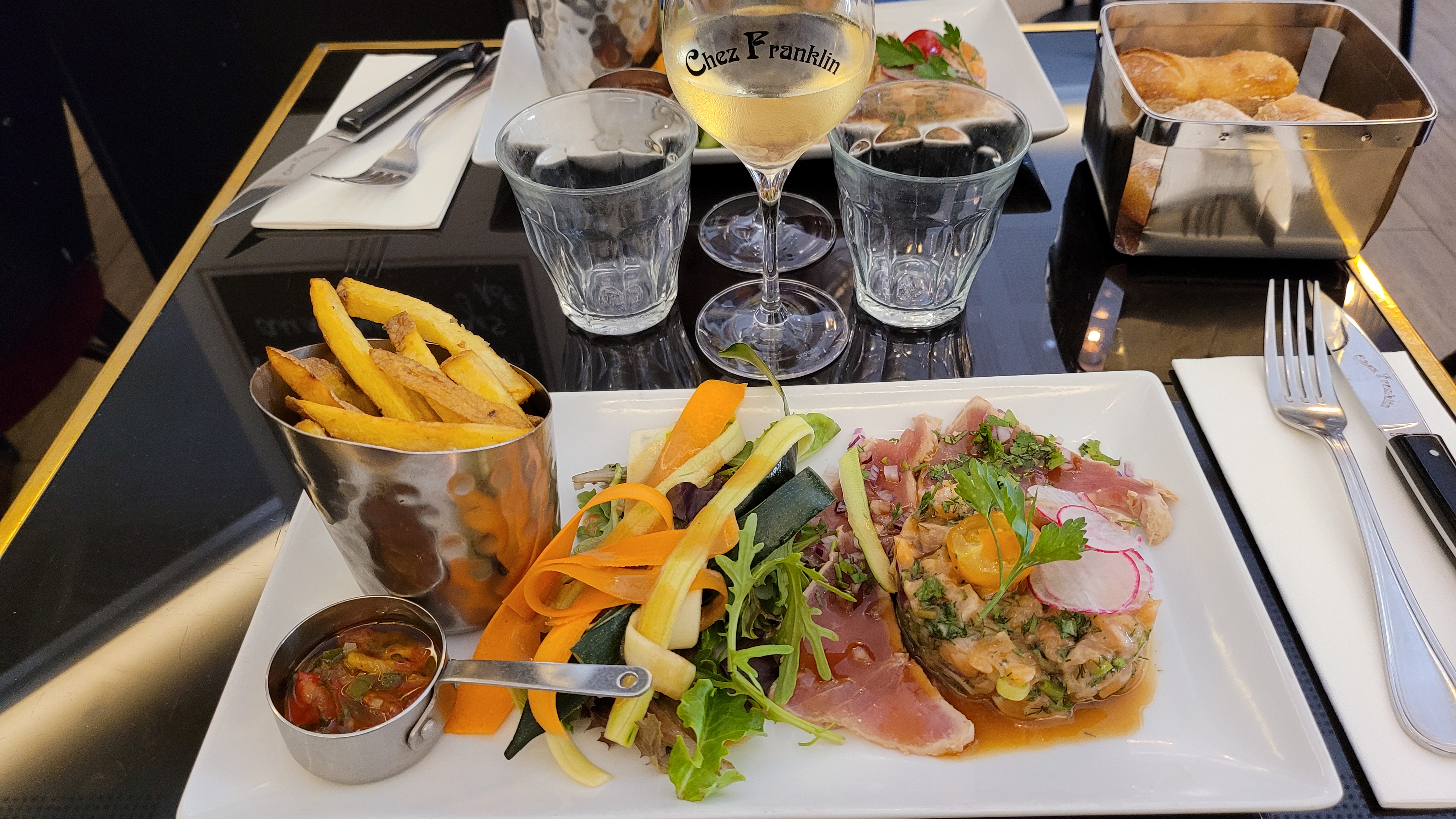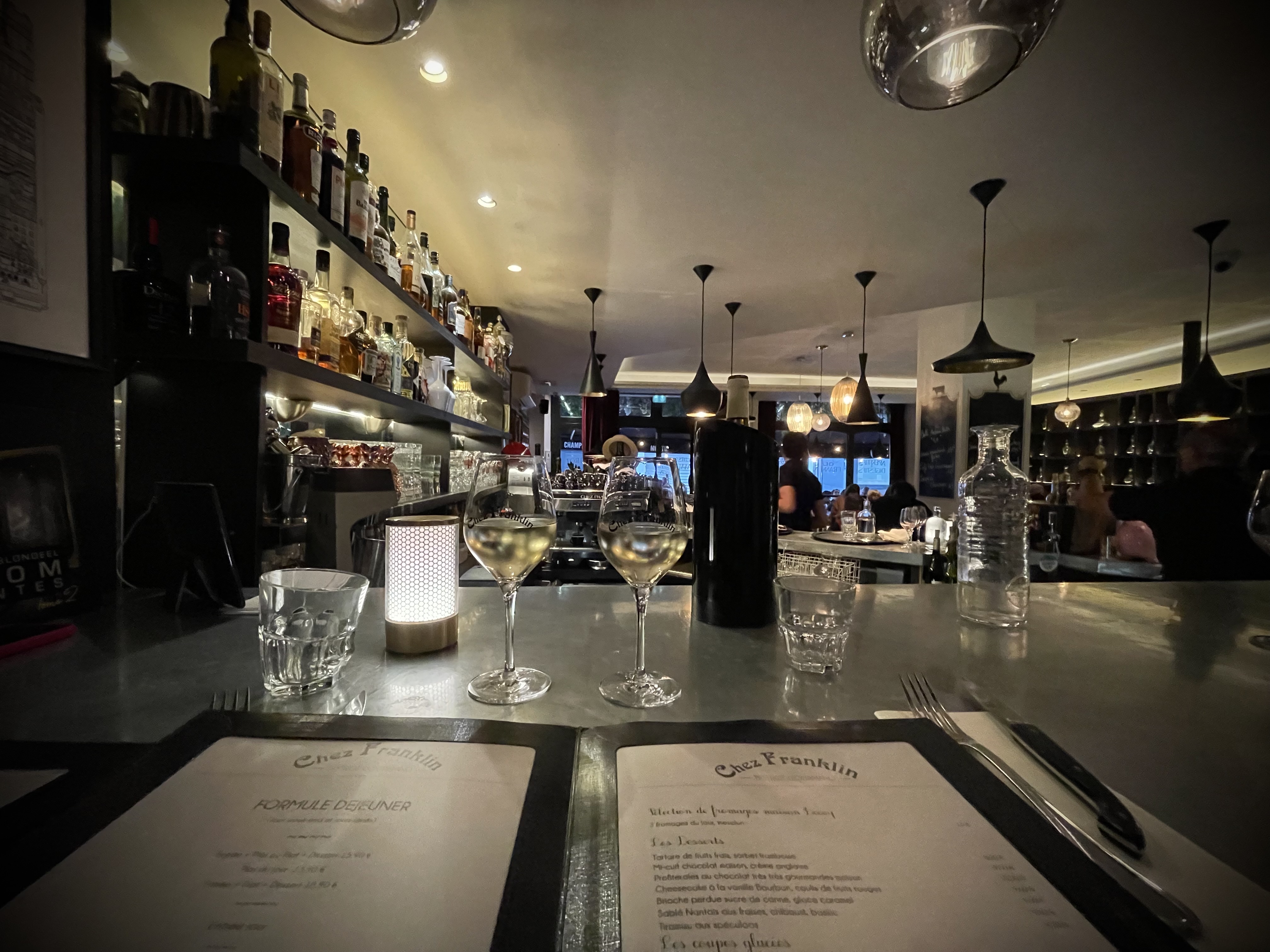 Nous avons passé deux très belles soirées chez Franklin. Le chef ainsi que le personnel nous ont chouchoute. Très bon vins soit en bouteille soit au verre, la carte est comme on l’aime, quelques plats adaptés a la saison et produits super frais. La place au bar était sublime, superviser le ballet des serveurs et la rentrée et sortie des clients. Merci et ne changez pas votre concept .