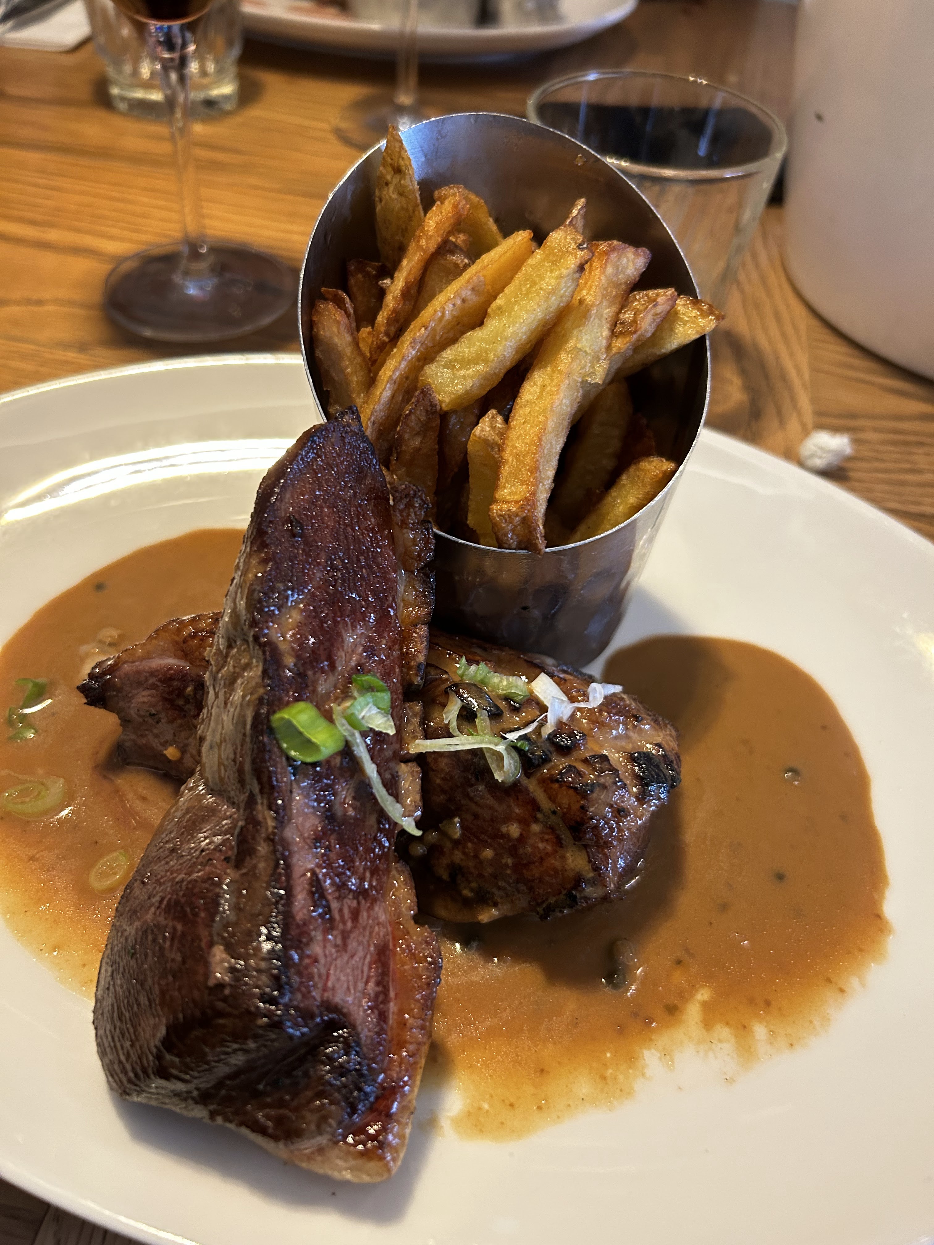 Très bon restaurant . Autant dans la cuisine que dans le service . Les serveurs sont rapides et aimables Je recommande la pièce de bœuf pour deux ! ✨