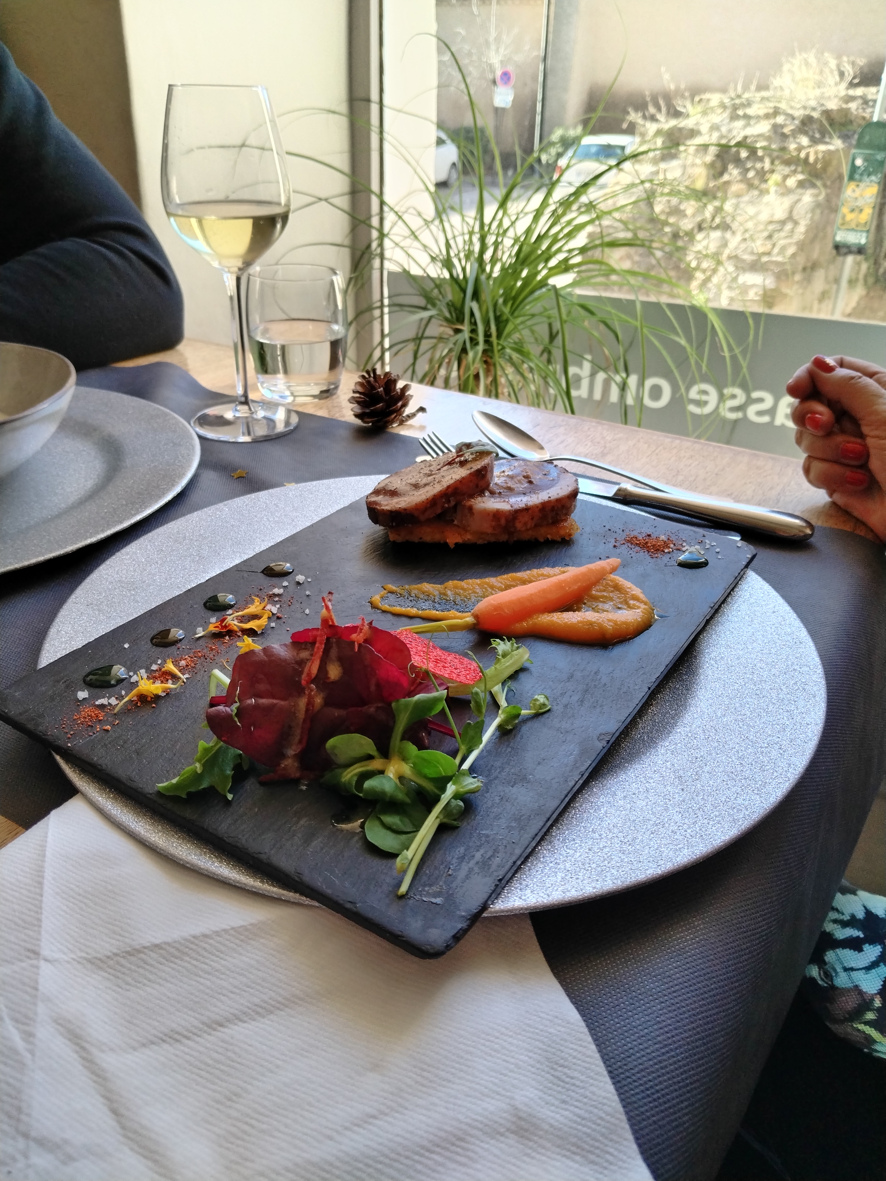 Quite possibly the best meal we have had in Carcassonne for a very long time. The food was inventive, creative, presented beautifully and of course very very delicious. We went for my husband's birthday lunch and we were extremely impressed. We both chose the POUR LES GOURMETS menu at €40 each. It did not disappoint. I also had two fabulous glasses of a local white wine named Mercredi 12h30 Blanc by Domaine Pujol. It was stunning at only €5.50 per glass. My husband doesn't drink much, and he enjoyed a simple Martini Blanc. I really cannot stress enough how much we enjoyed our dining experience here. Highly recommended. Probablement le meilleur repas que nous ayons eu à Carcassonne depuis très longtemps. La nourriture était inventive, créative, joliment présentée et bien sûr très délicieuse. Nous y sommes allés pour le déjeuner d'anniversaire de mon mari et nous avons été extrêmement impressionnés. Nous avons tous les deux choisi le menu POUR LES GOURMETS à 40 € chacun. Cela n'a pas déçu. J'ai également bu deux fabuleux verres d'un vin blanc local nommé Mercredi 12h30 Blanc du Domaine Pujol. C'était époustouflant à seulement 5,50 € le verre. Mon mari ne boit pas beaucoup et il a apprécié un simple Martini Blanc. Je ne saurais trop insister sur le fait que nous avons apprécié notre expérience culinaire ici. Hautement recommandé.