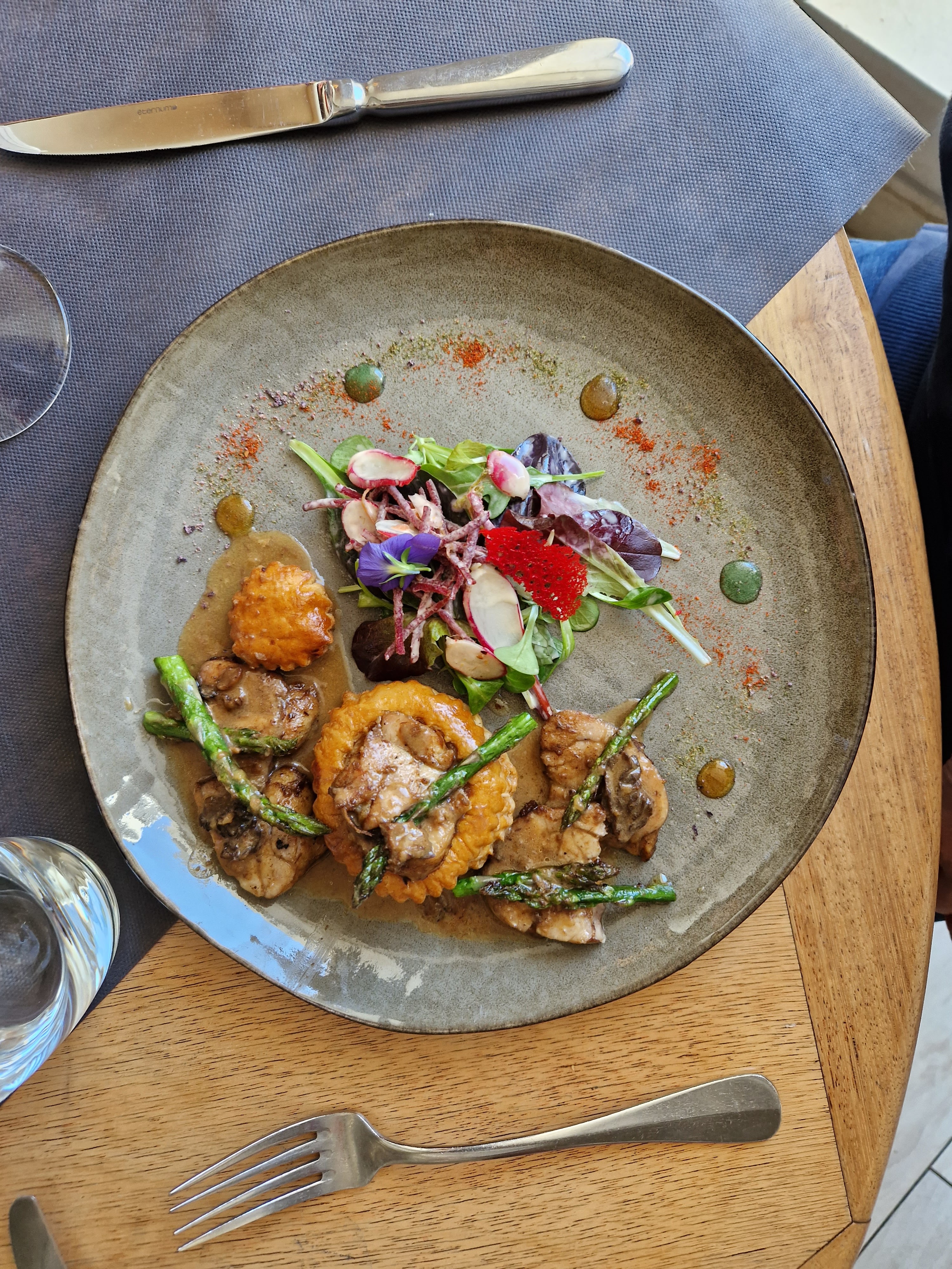 Plats très raffinés. De belles assiettes. Cadre très agréable avec de l espace. Service avec sourire, ce qui ne gâche rien !!