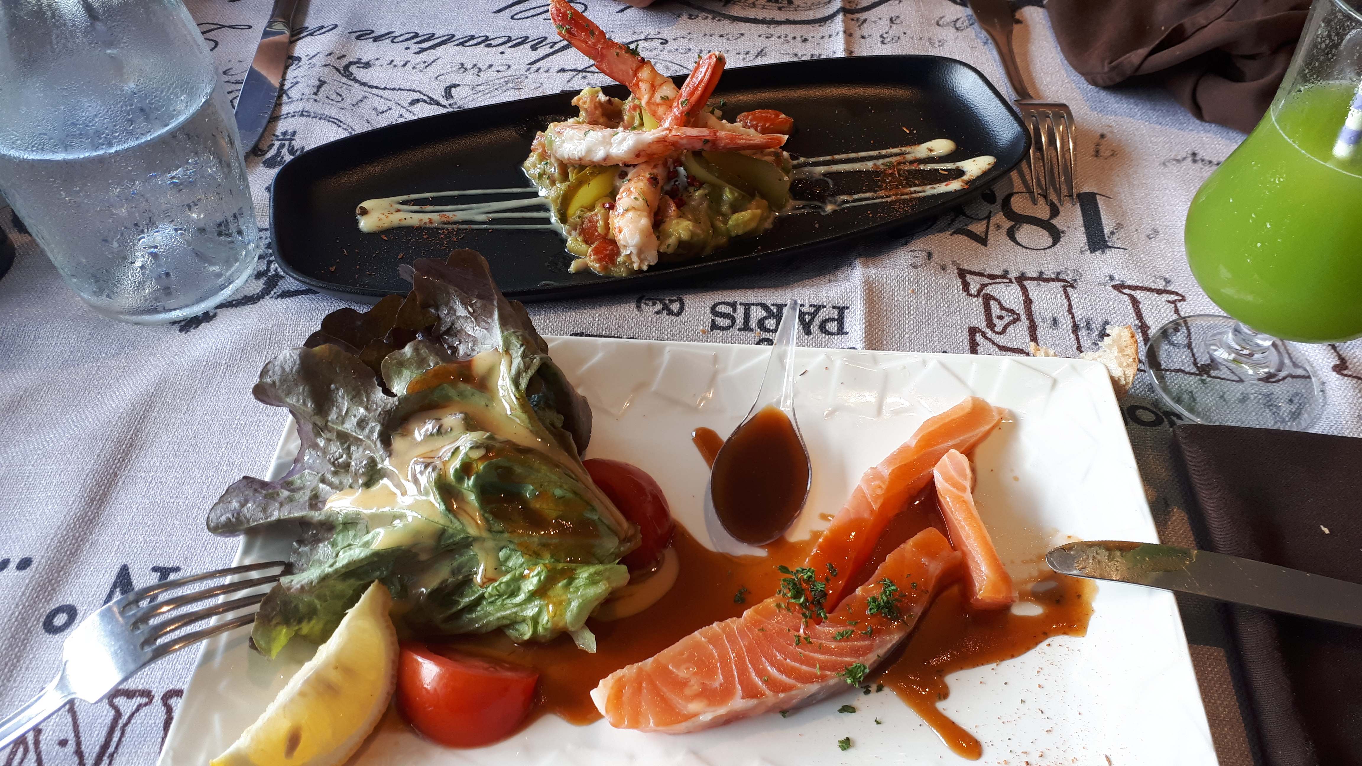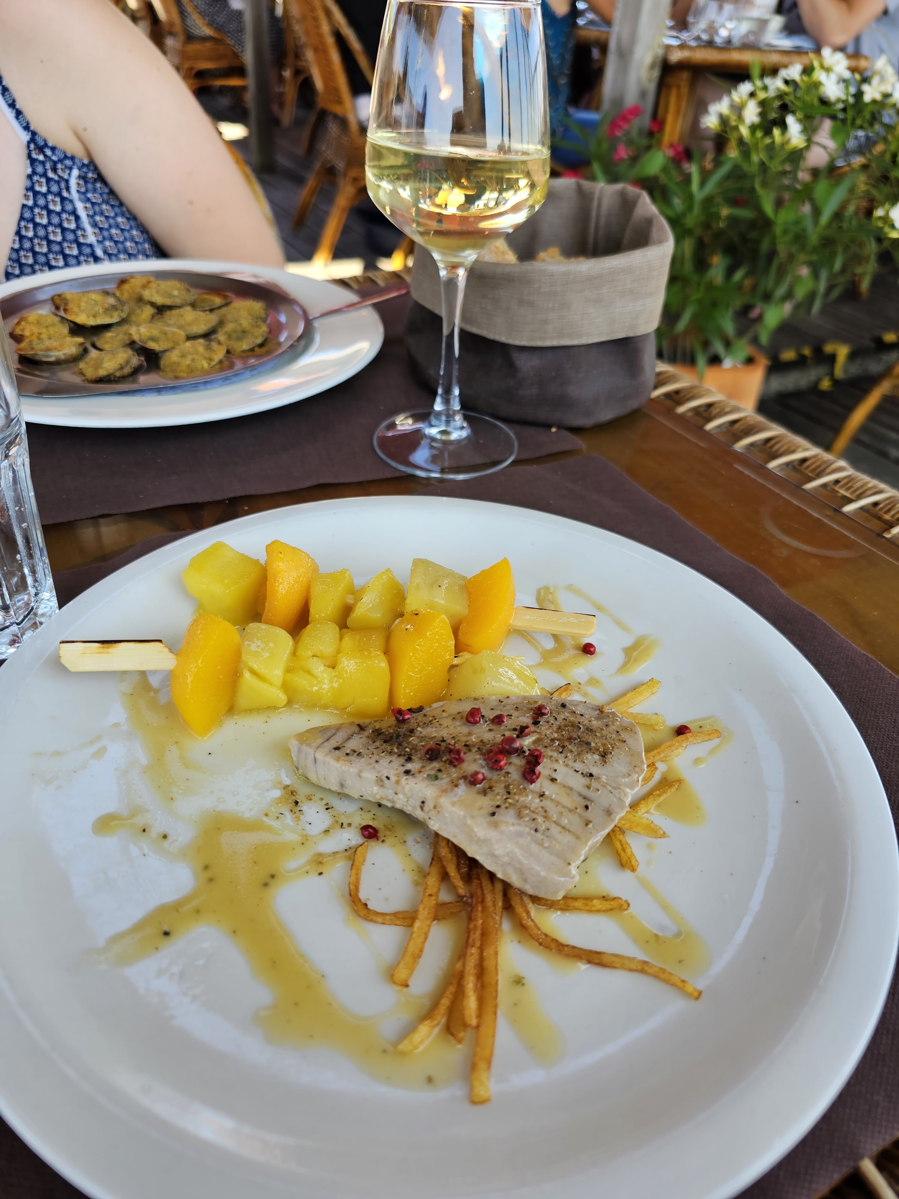 Restaurant de fruits de mer et poissons (plats de viande également) typique charentais avec des pointes d'assaisonnement à la Sénégalaise avec fruits exotiques et agrumes. Les cocktails en apéritifs étaient excellents, les plats de même et parfaitement soignés, se terminant sur des desserts maison travaillés. Le service y est très agréable avec une belle vue sur le coucher de soleil sur les marais salans. Je conseille fortement !