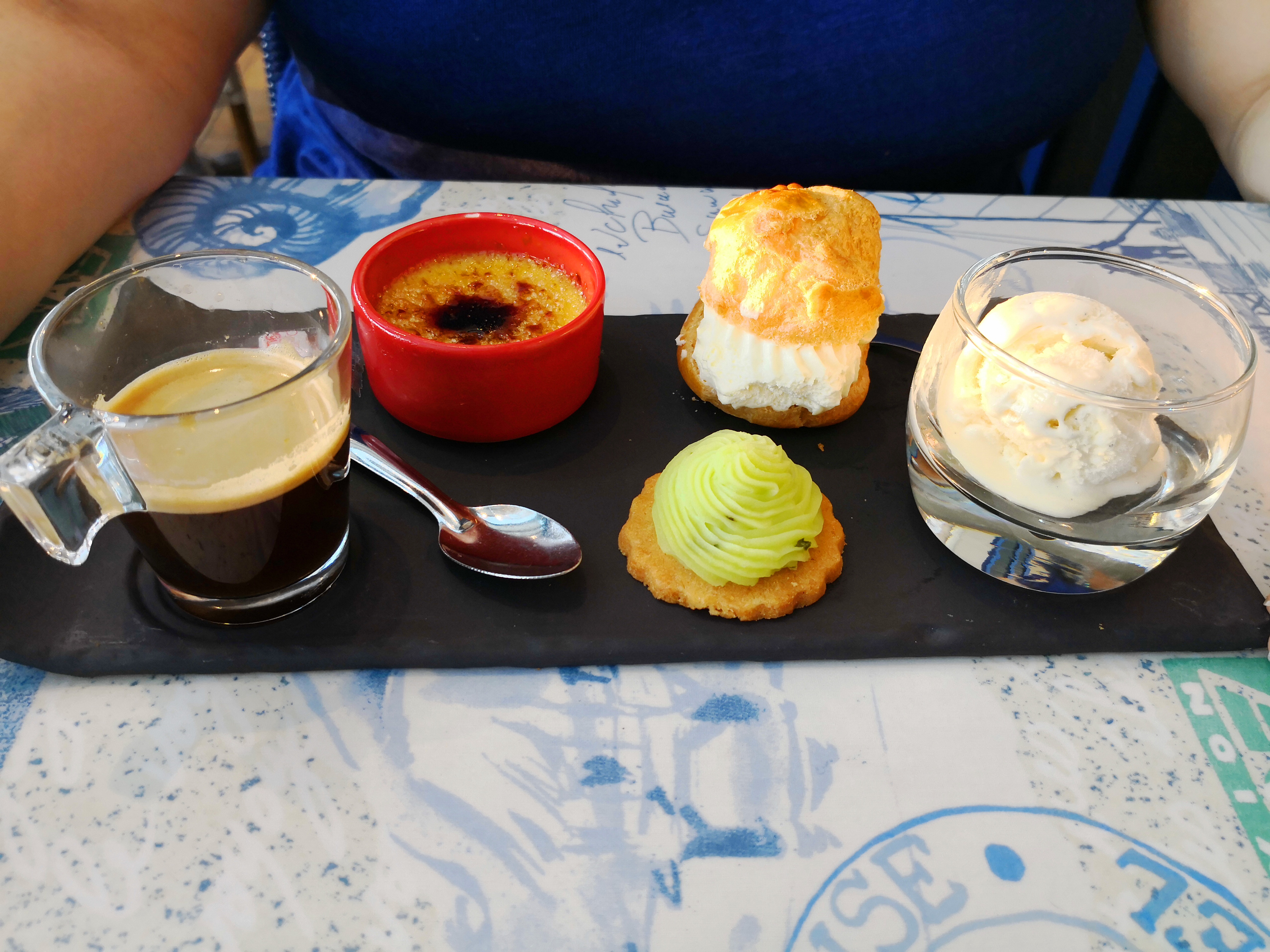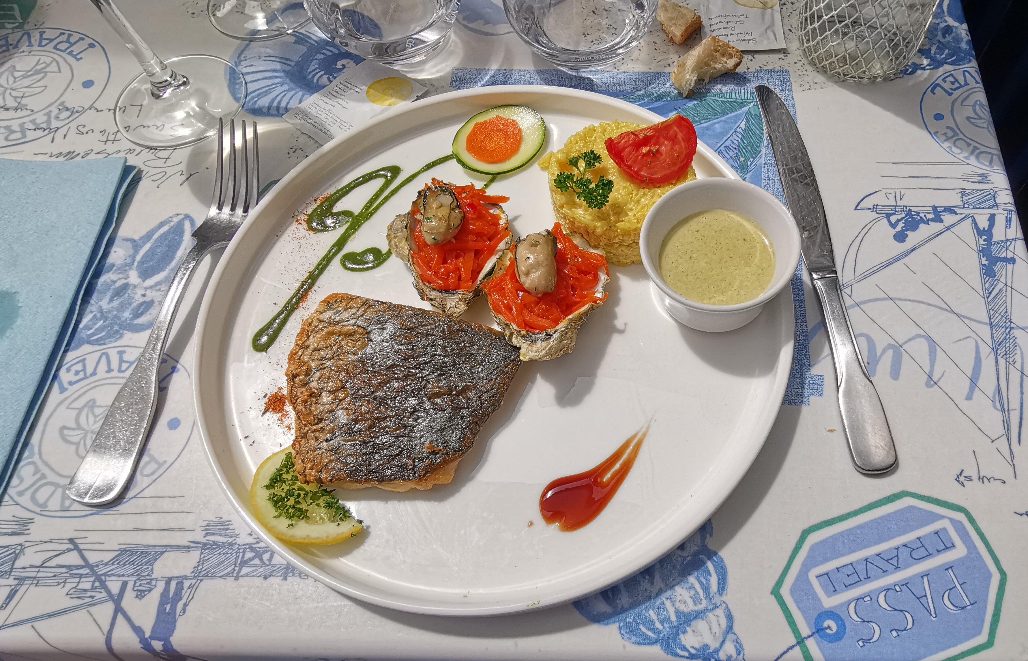 Personnel, très attentif et agréable. Repas de bonne qualité. Baba au rhum excellent avec un peu de fleur d’oranger. Pour l’assiette de fruits de mer, j’aurais préféré des huîtres et langoustines un peu plus grosses . Prix dans le haut de la fourchette mais excessif sur les boissons. Sept euros la bouteille d’eau gazeuse.